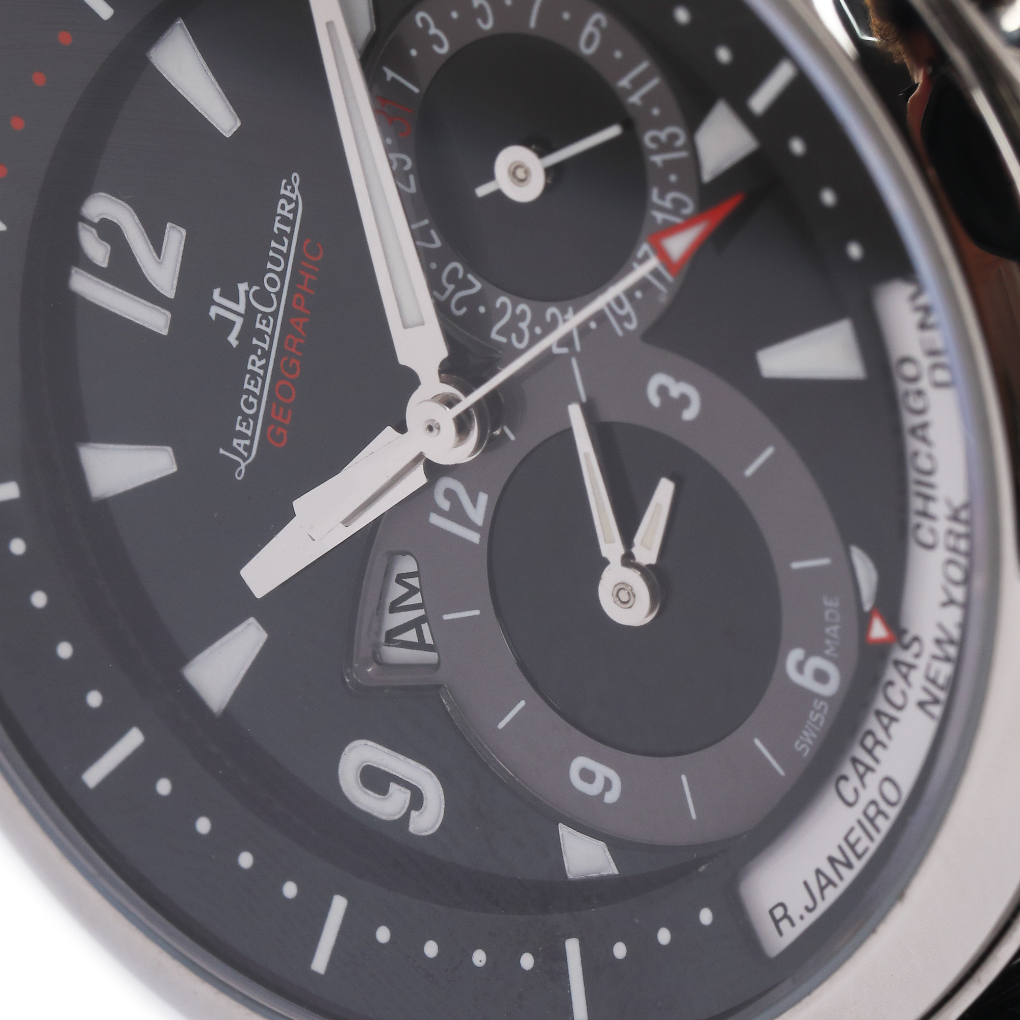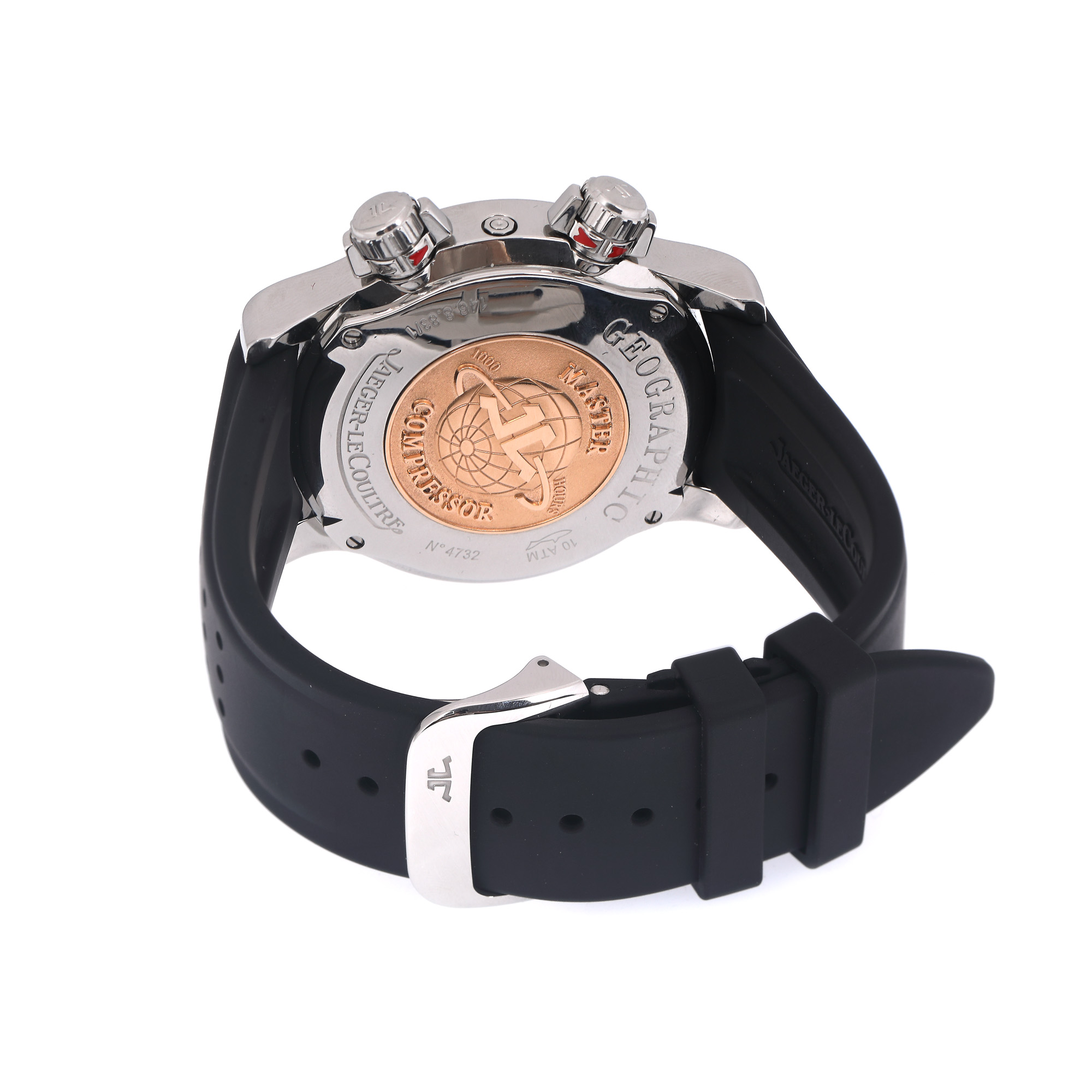 Ceas Jaeger-LeCoultre Master Compressor Geographic, de mână, bărbătesc, referință 146.8.83/1, mecanism automatic, calibru 923. Cadran de culoare negru, cu indici orari luminiscenți și cifre arabe, registru circular pentru dată între orele 2-4, registru circular pentru zi și noapte între orele 5-9, și registru GMT pentru ora mondială sub orele 5-7. Curea din cauciuc, de culoare neagră, cu sistem de închidere tip deployant, originale.
