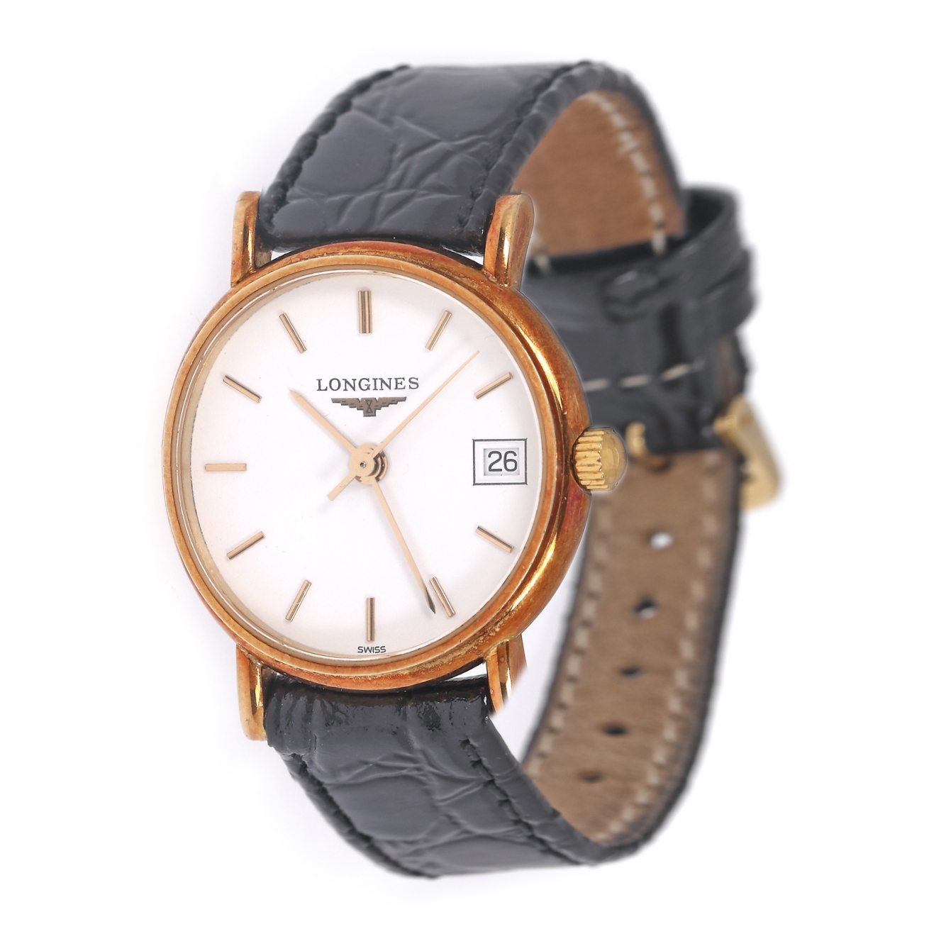 Ceas Longines La Grande Classique, din aur, de mână, de damă, referință L7 490 6, mecansim quartz. Cadran de culoare alb, cu indici orari din aur și registru pentru dată în dreptul orei 3. Curea din piele, de culoare neagră, cu cataramă, originale.