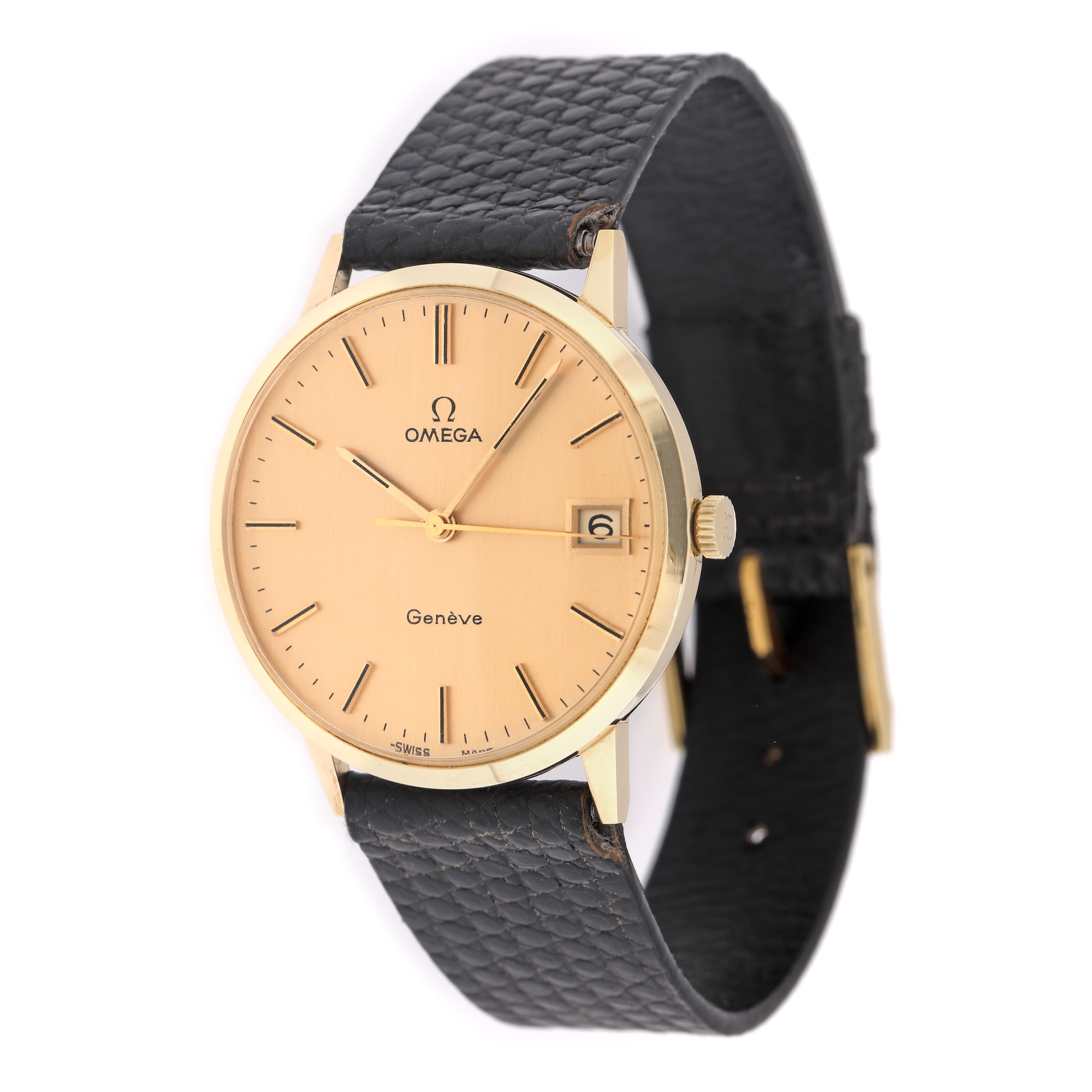 Ceas vintage Omega Geneve, de mână, bărbătesc, referință 192051, mecanism cu armare manuală calibrul 1030. Cadran cu indici baghete, registru pentru dată în dreptul orei 3. Însoțit de cutia originală.