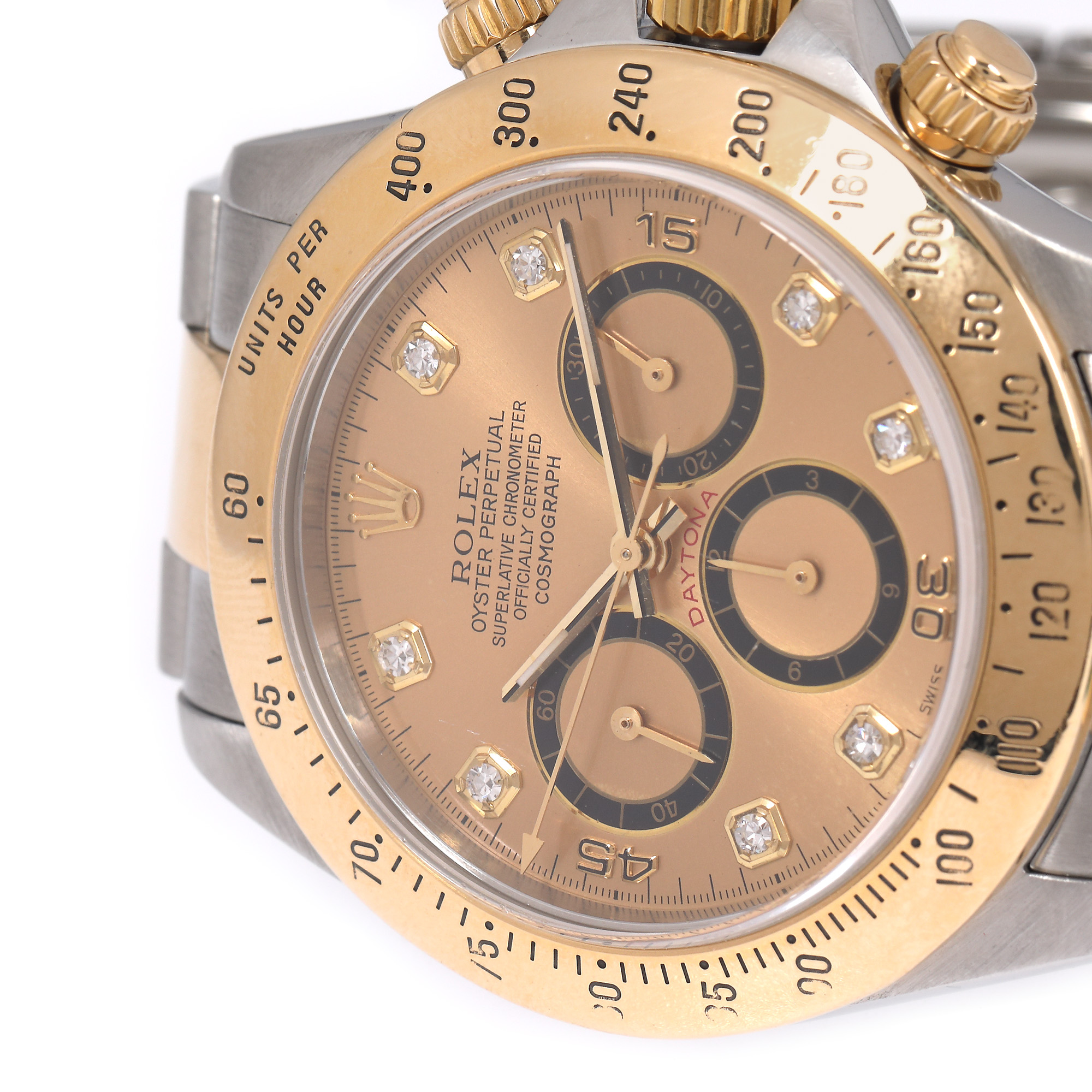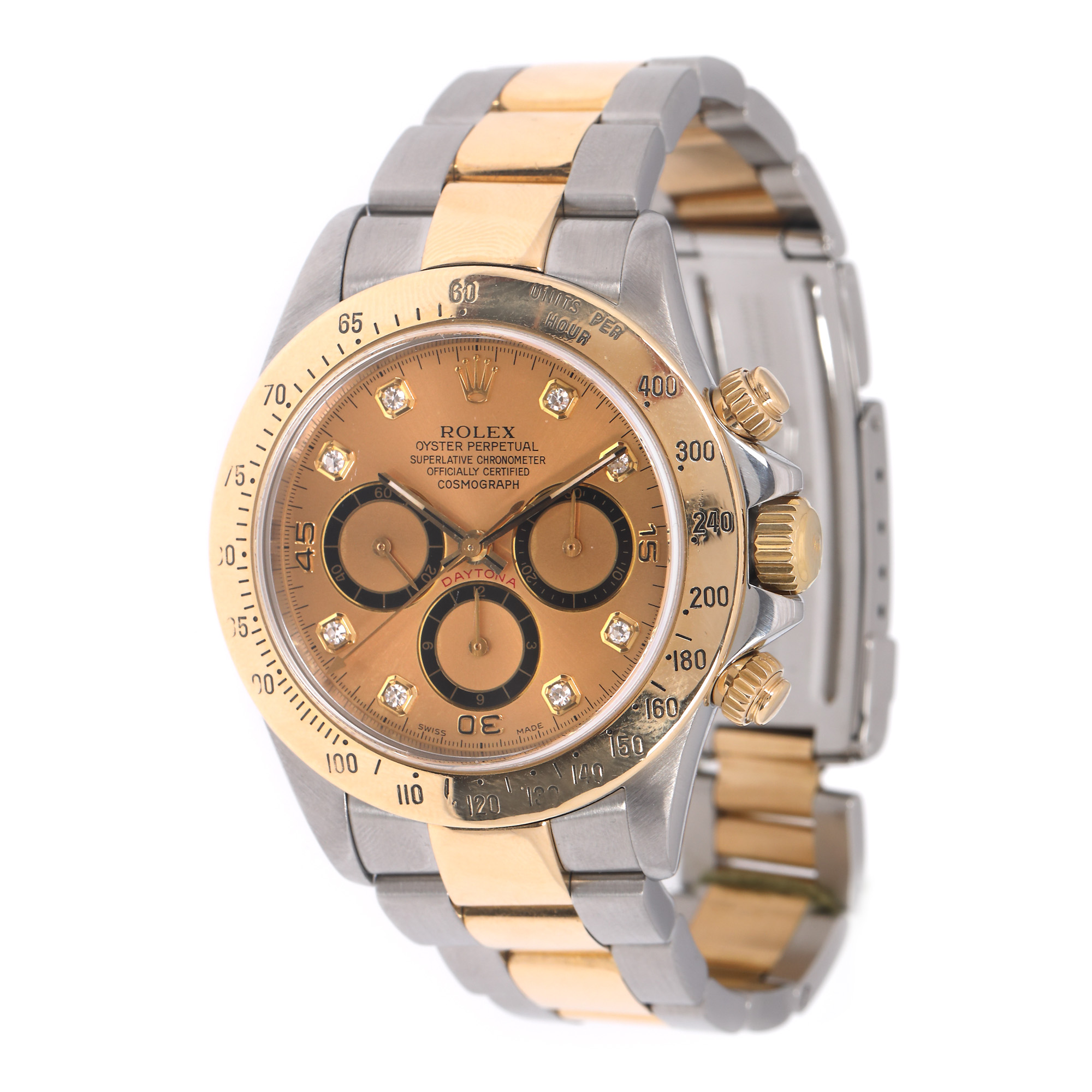 Rolex Daytona Cosmograph, din aur și oțel, decorat cu diamante, de mână, bărbătesc, referință 16523, mecanism automatic, calibrul 4030. Cadran de culoare auriu, cu indici orari diamante, cu trei registre cronograf. Curea cu sistem de închidere tip deployant, originale Accesorii: cutia originală.