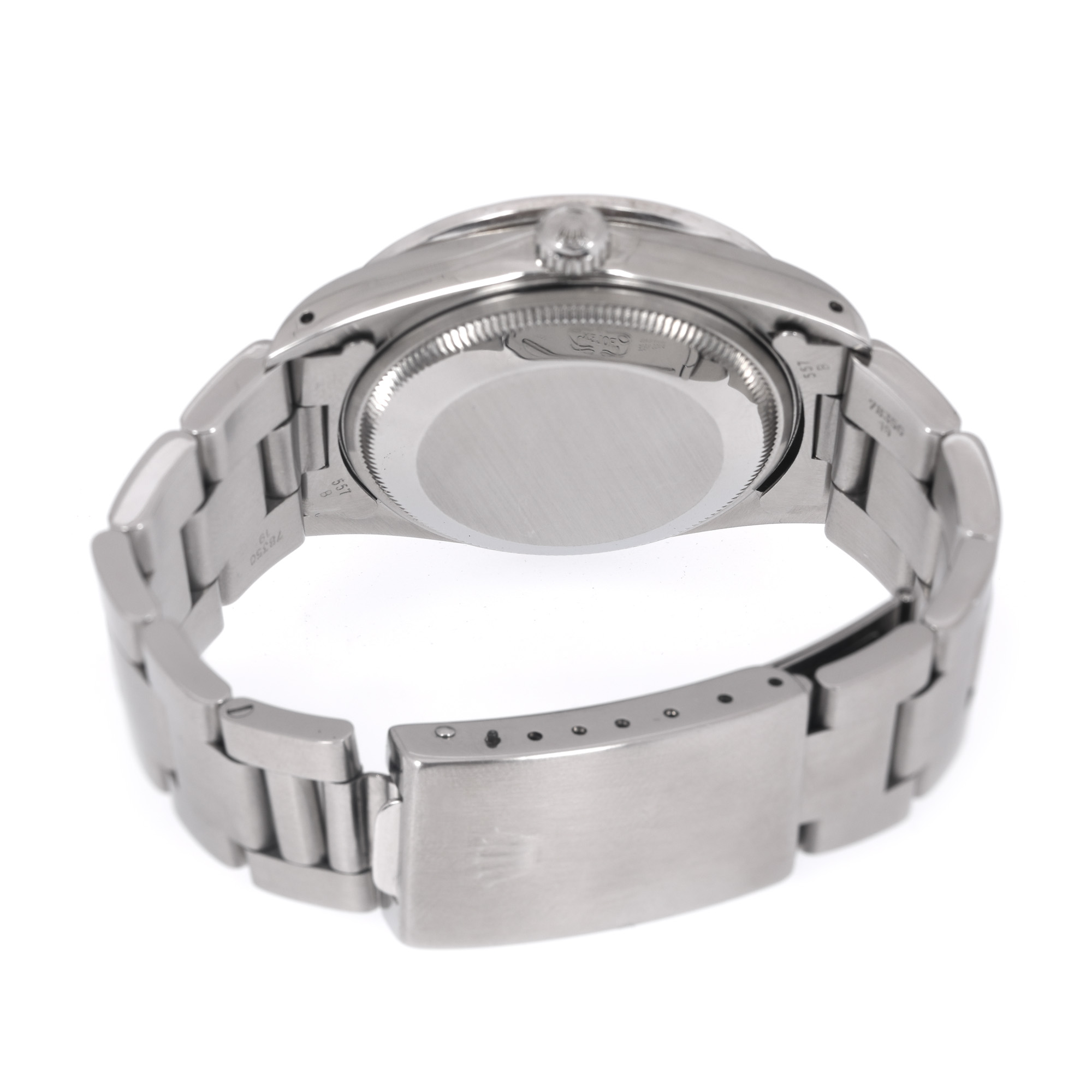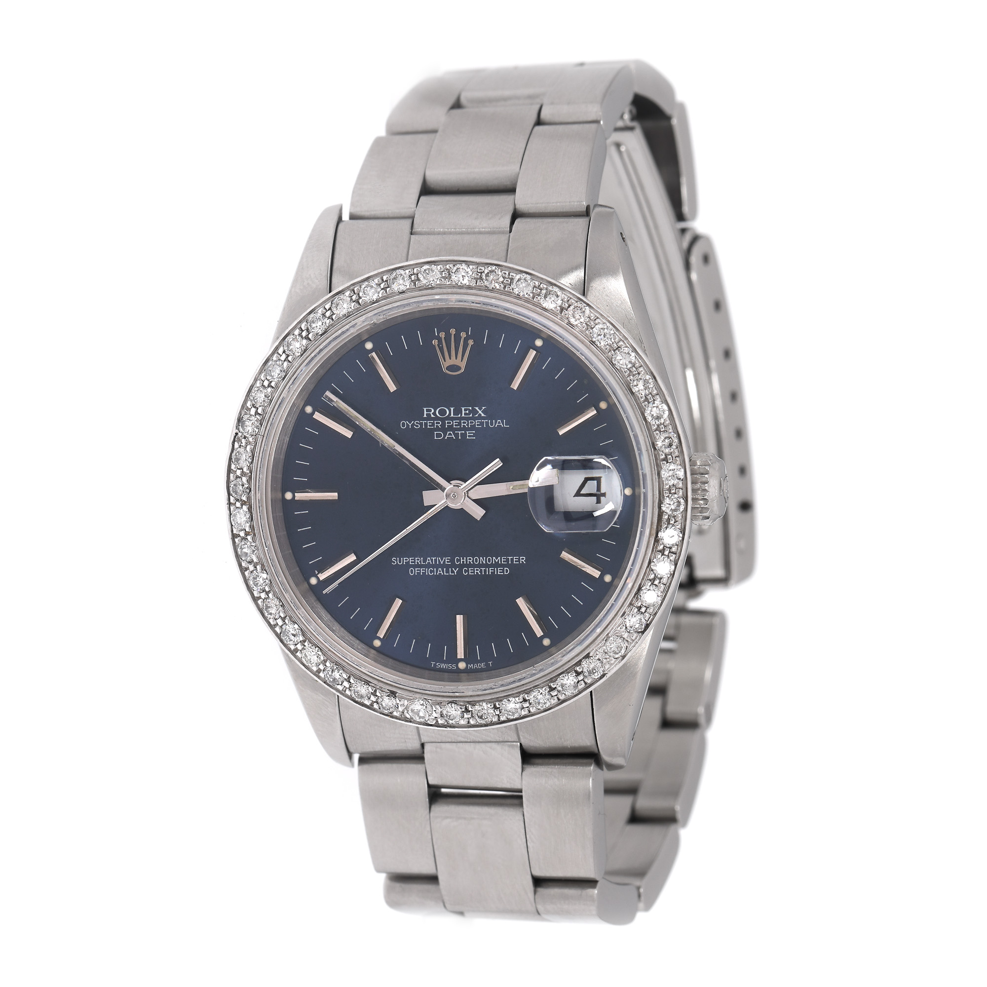 Ceas Rolex Oyster Perpetual Date, de mână, de damă, referință 15200, mecanism automatic, calibrul 3135. Bezel decorat integral cu diamante. Cadran de culoare albastru, cu indici orari baghetă din oțel inoxidabil și registru pentru dată, cu lupă, în dreptul orei 3. Brățară cu sistem de închidere tip deployant, originale.
