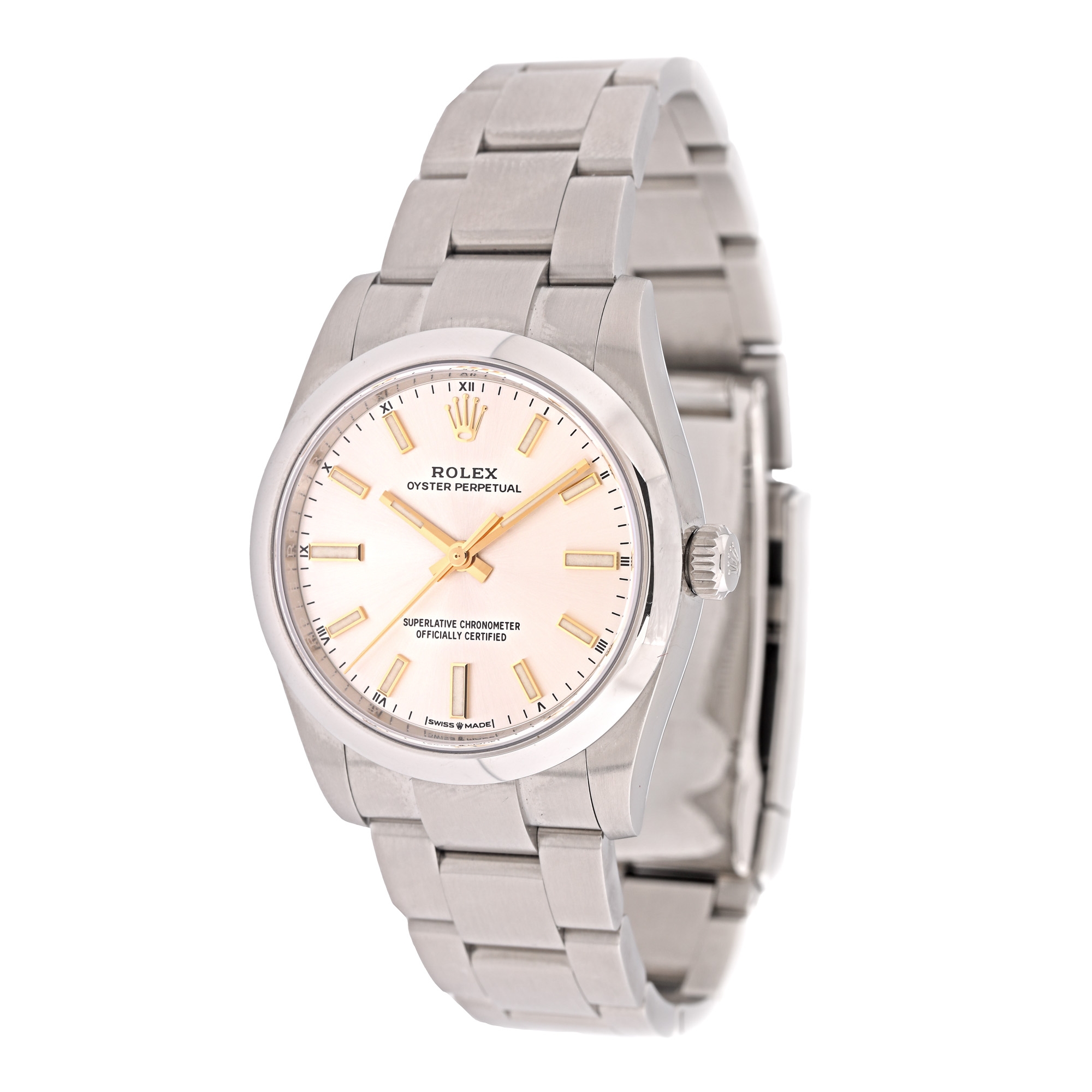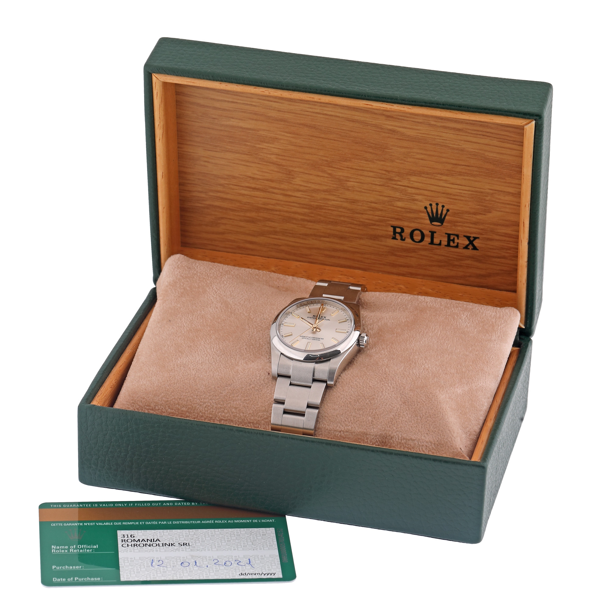 Ceas Rolex Oyster Perpetual din oțel inoxidabil, de mână, de damă, referință 126000, mecanism automatic. Cadran de culoare argintiu, cu indici orari luminiscenți. Brățară cu inchidere de tip deployant, originale. Accesorii: cutia originală, card de garanție.