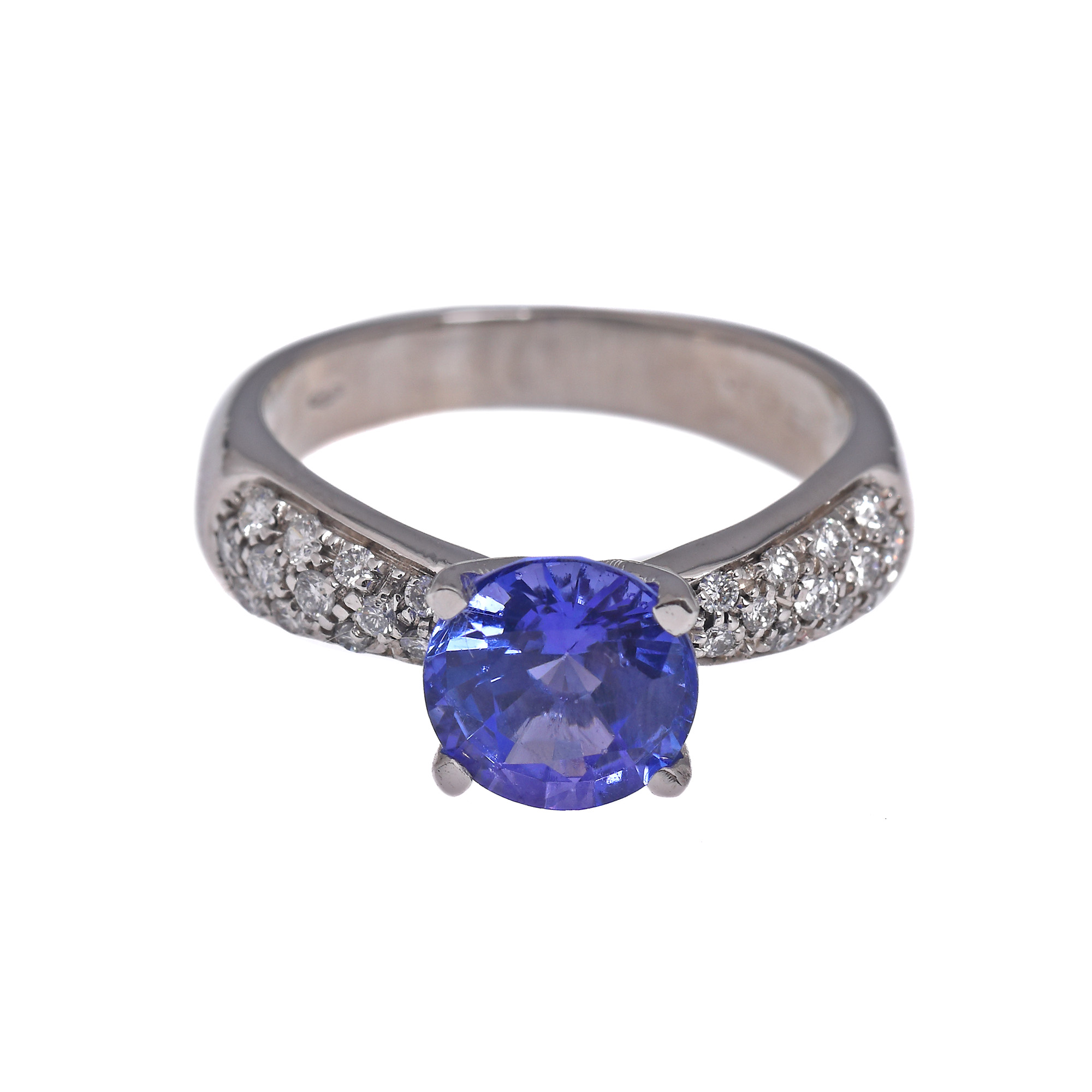 1 tanzanit rotund fațetat, culoare albastru, claritate eye-clean, cca. 2,10 ct. și 24 diamante rotunde briliant, culoare G-H, claritate VS1-VS2, cca. 0,30 ct.