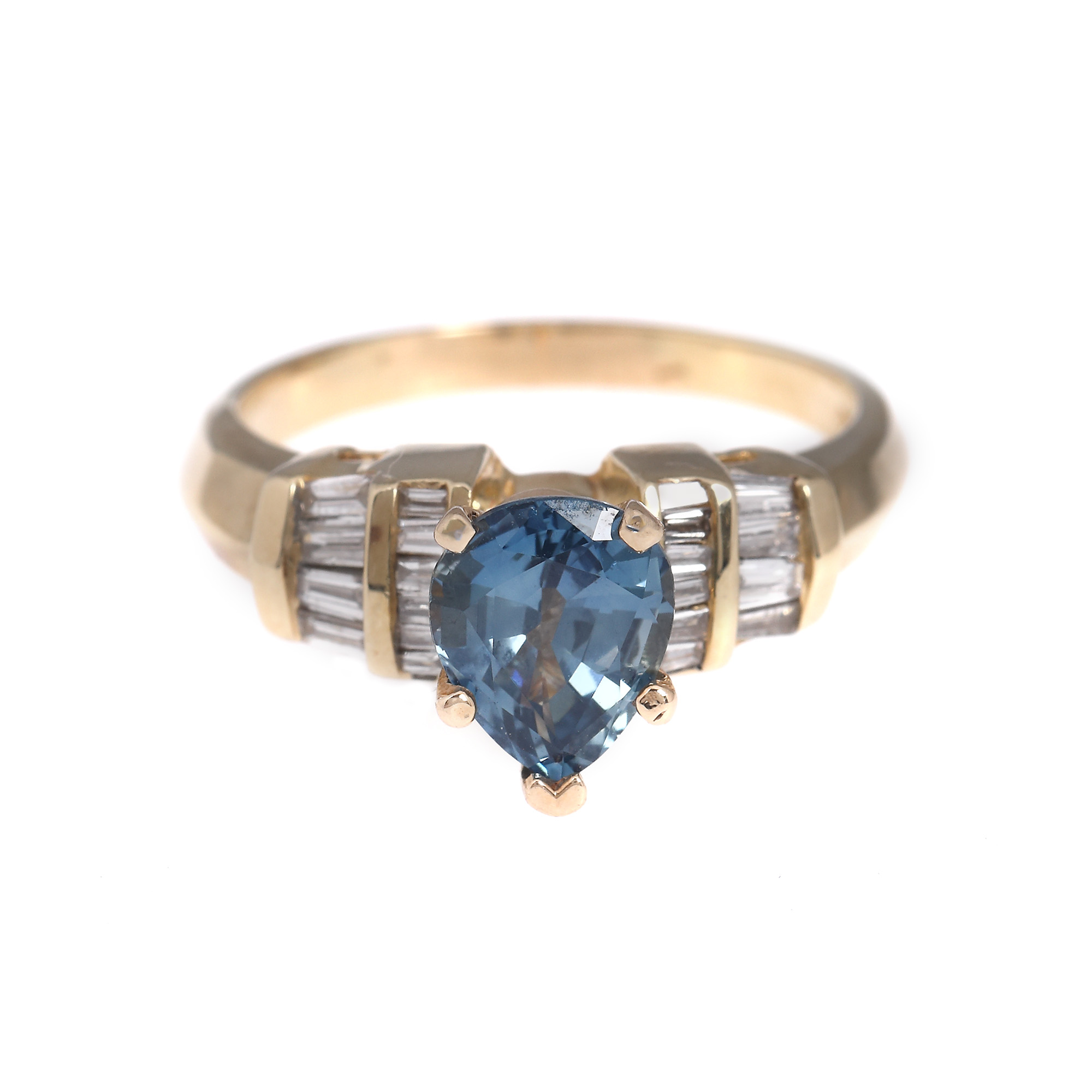 1 safir pară fațetat, culoare albastru, claritate eye-clean, cca. 1,45 ct. și 20 diamante baghete, culoare K-L, claritate SI1-I1, cca. 0,70 ct.