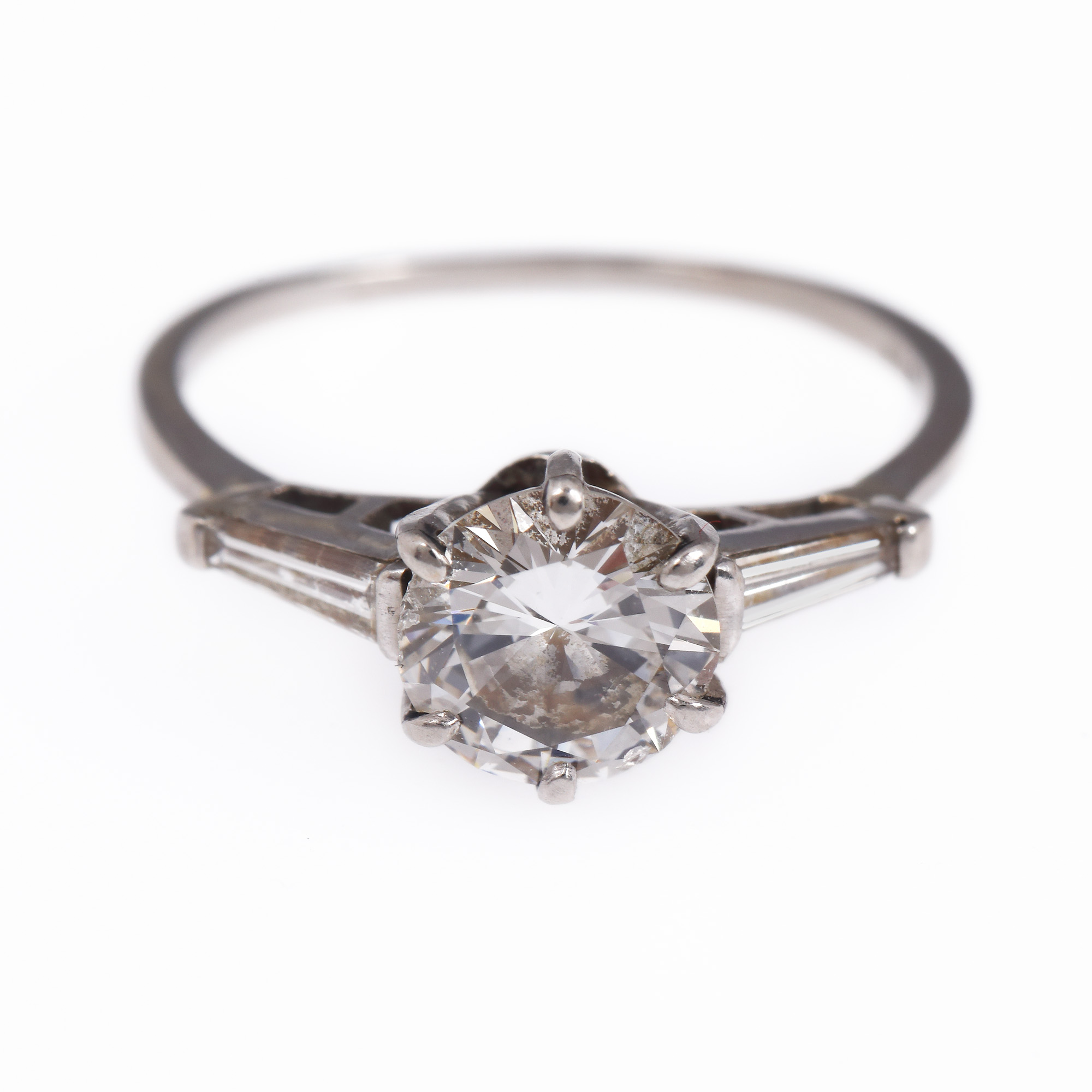 1 diamant rotund briliant, culoare J-K, claritate SI2, cca. 1,10 ct. și 2 diamante baghete, culoare I-J, claritate VS1-VS2, cca. 0,28 ct. Diamantul central prezintă mici ciobituri pe rondistă.