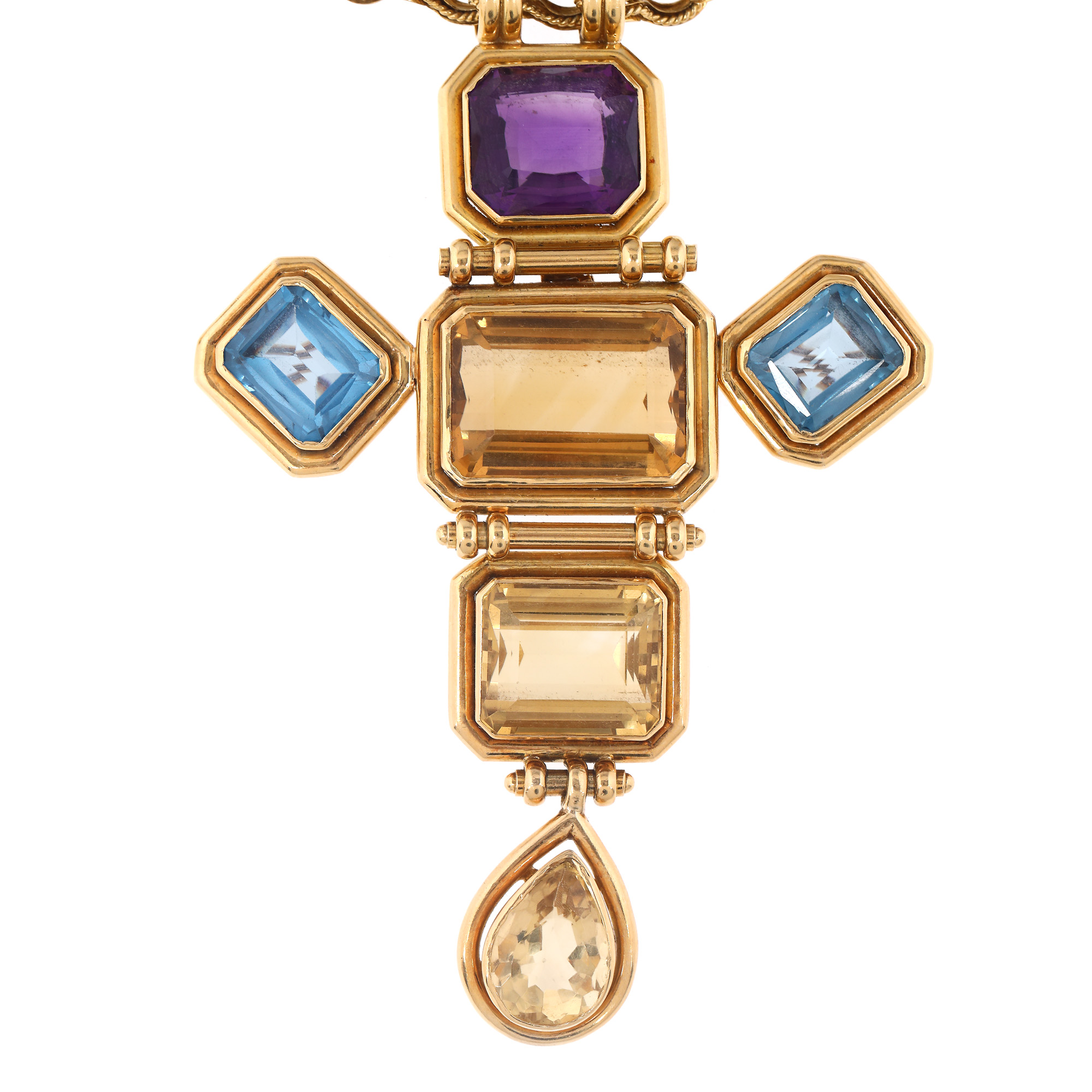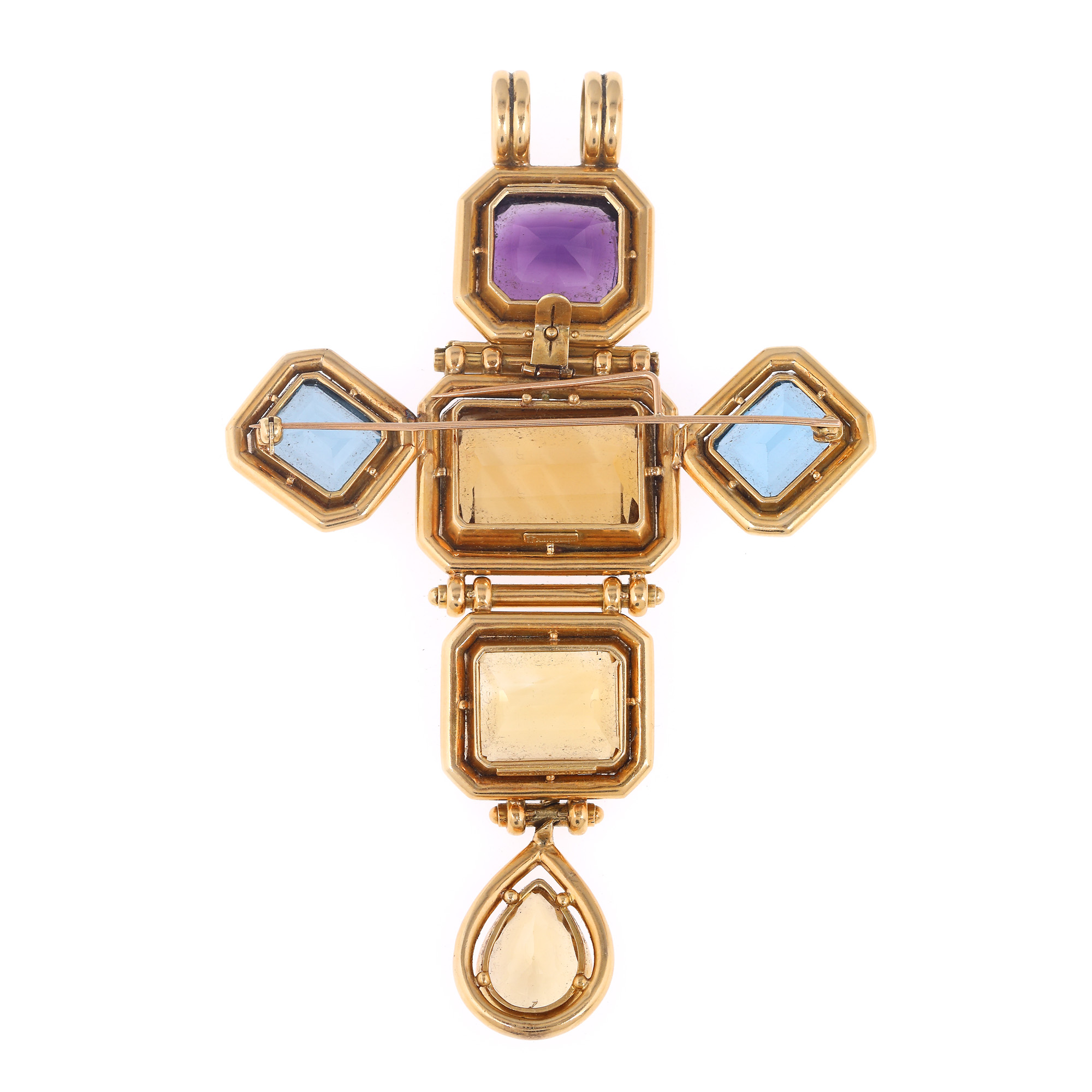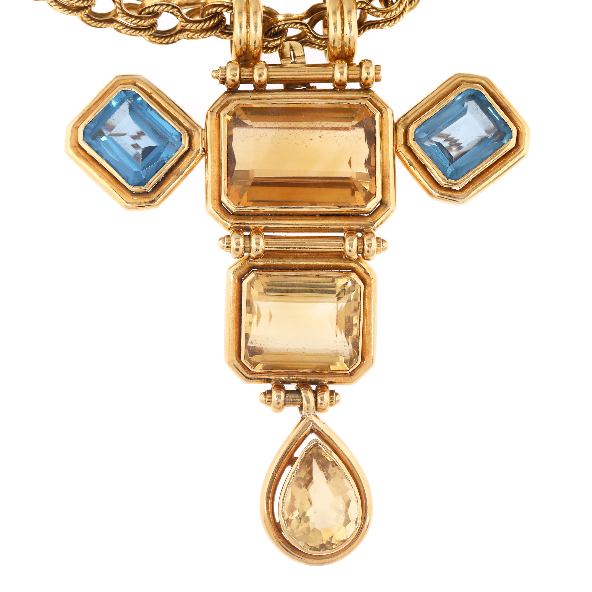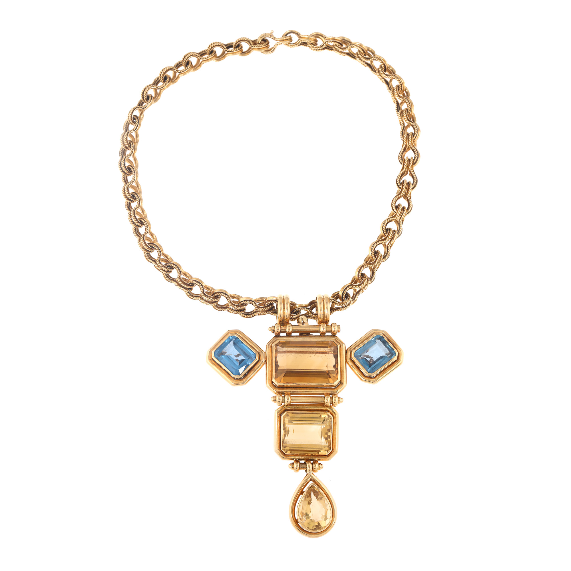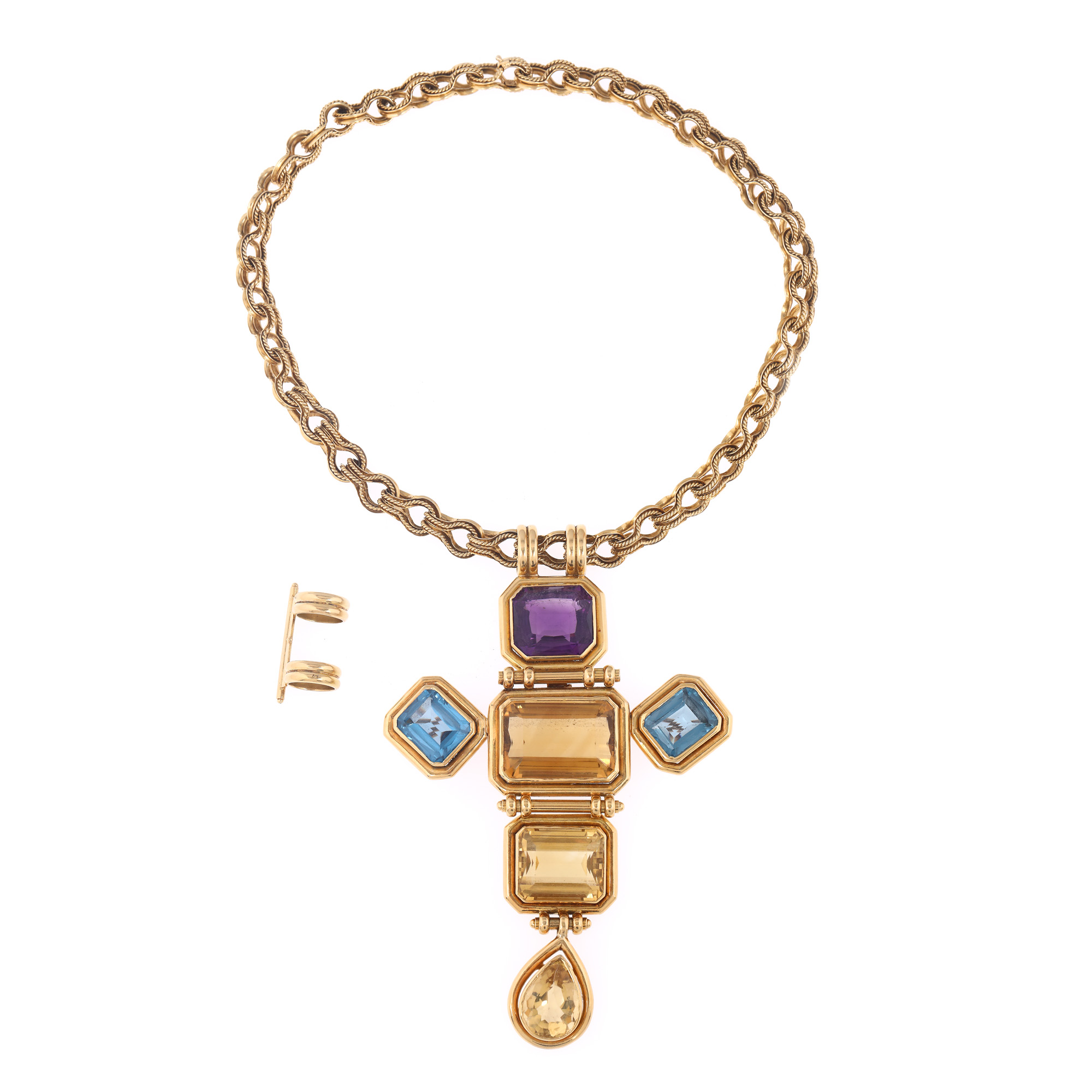 109. Rar colier Maramenos & Pateras din aur, cu pandantiv-broșă cu două modalități de purtare, decorat cu citrine, ametist și pietre ornamentale, provine din colecția Marinei Dimitropoulos