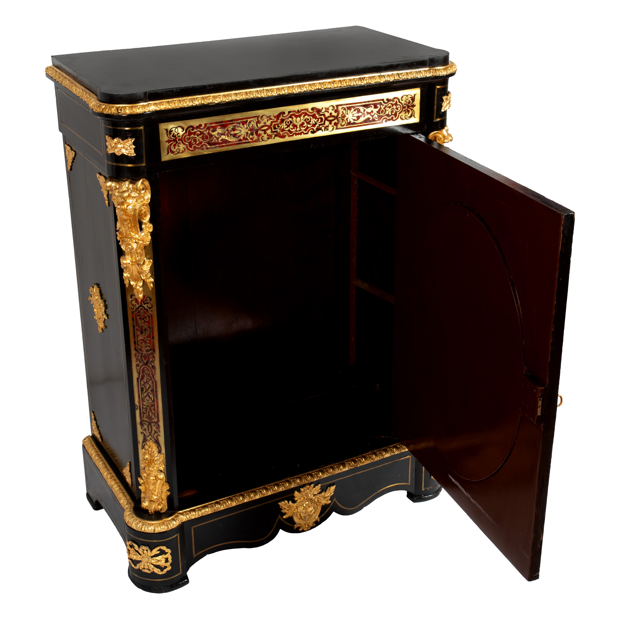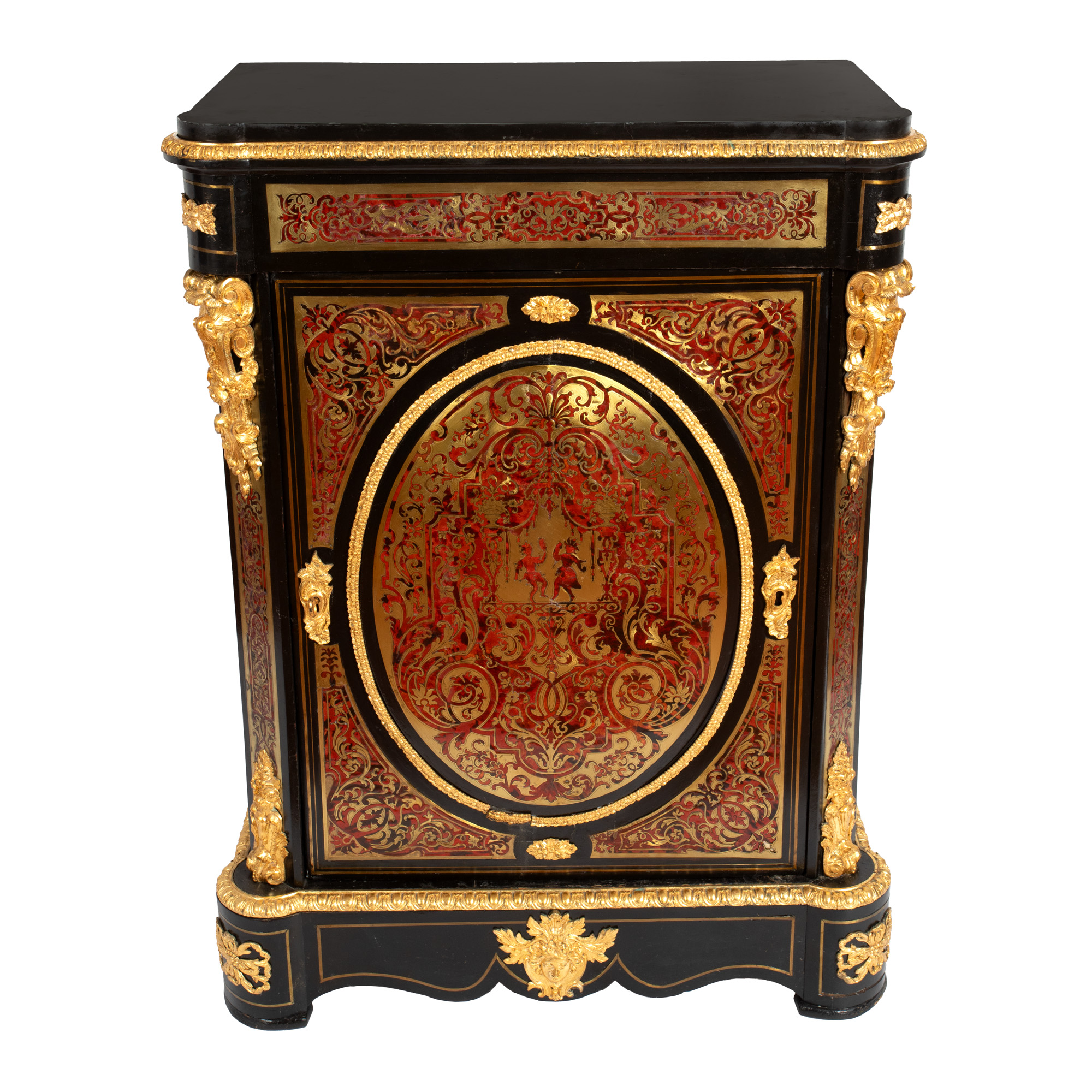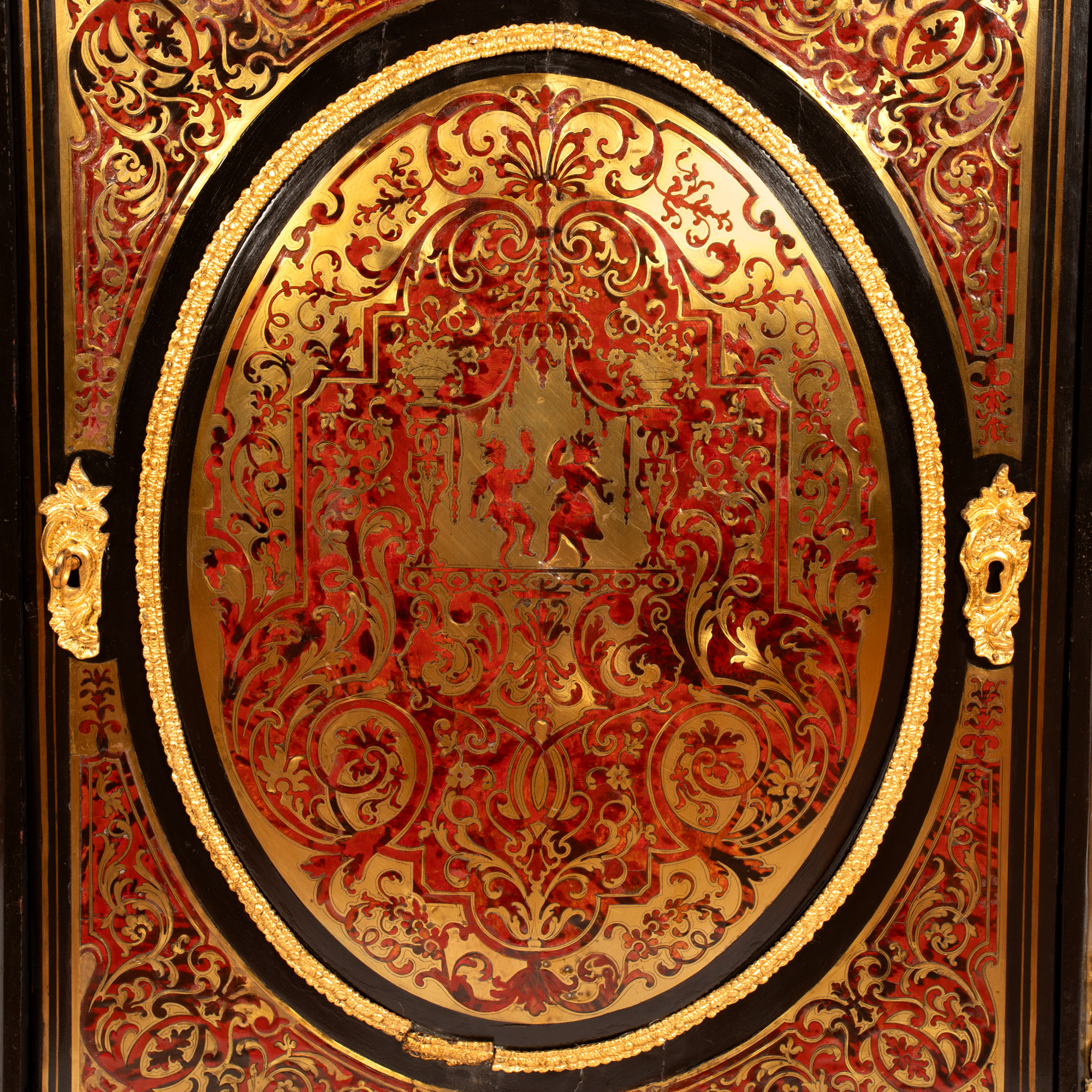 80. Comodă tip Boulle în stil Napoleon III, ornată cu intarsii și decorațiuni din bronz, semnată ”A.R. Boulogne”, Paris, sfârșitul sec. XIX, piesă de colecție