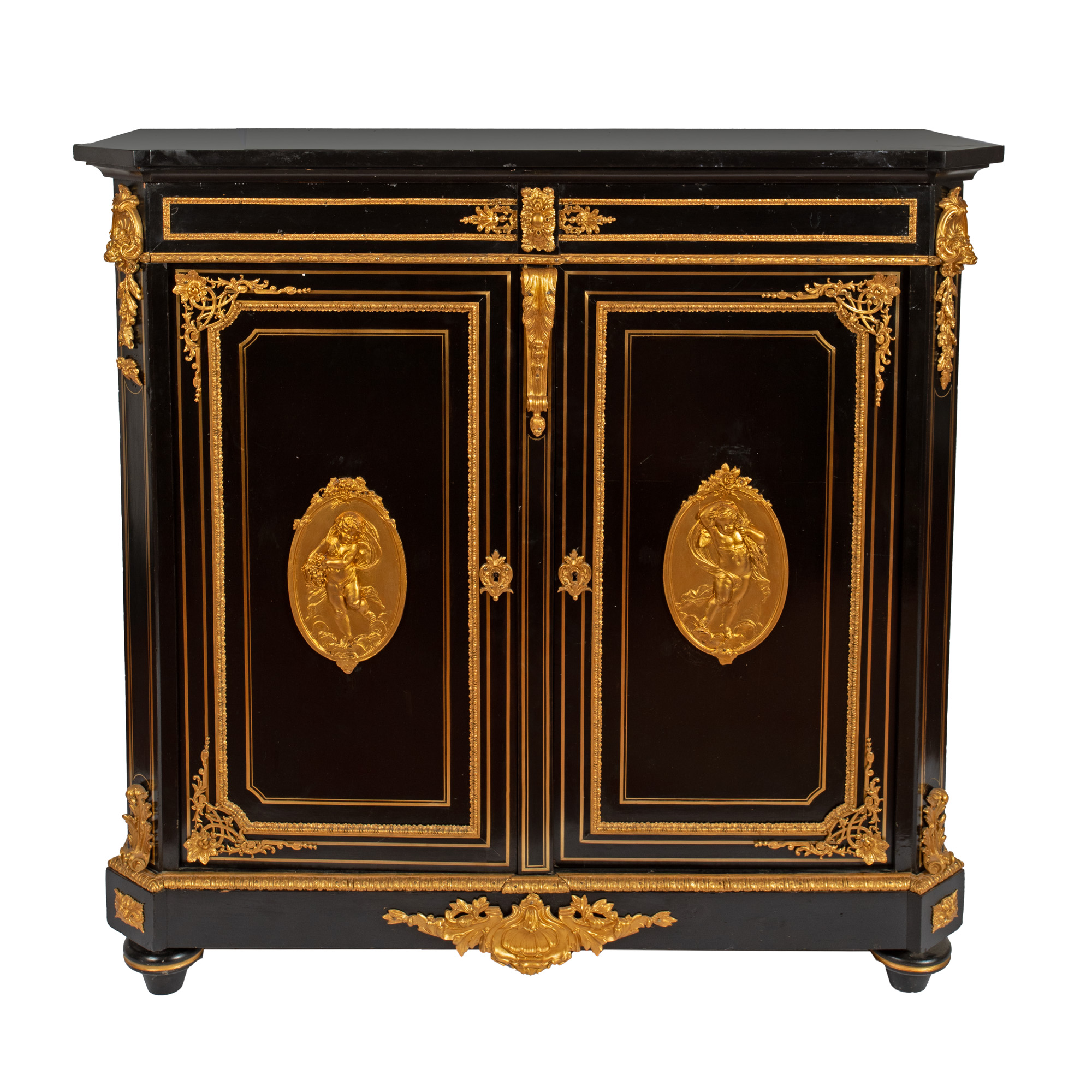 79. Comodă tip Boulle în stil Napoleon III, ornată cu intarsii și decorațiuni din bronz, sfârșitul sec. XIX