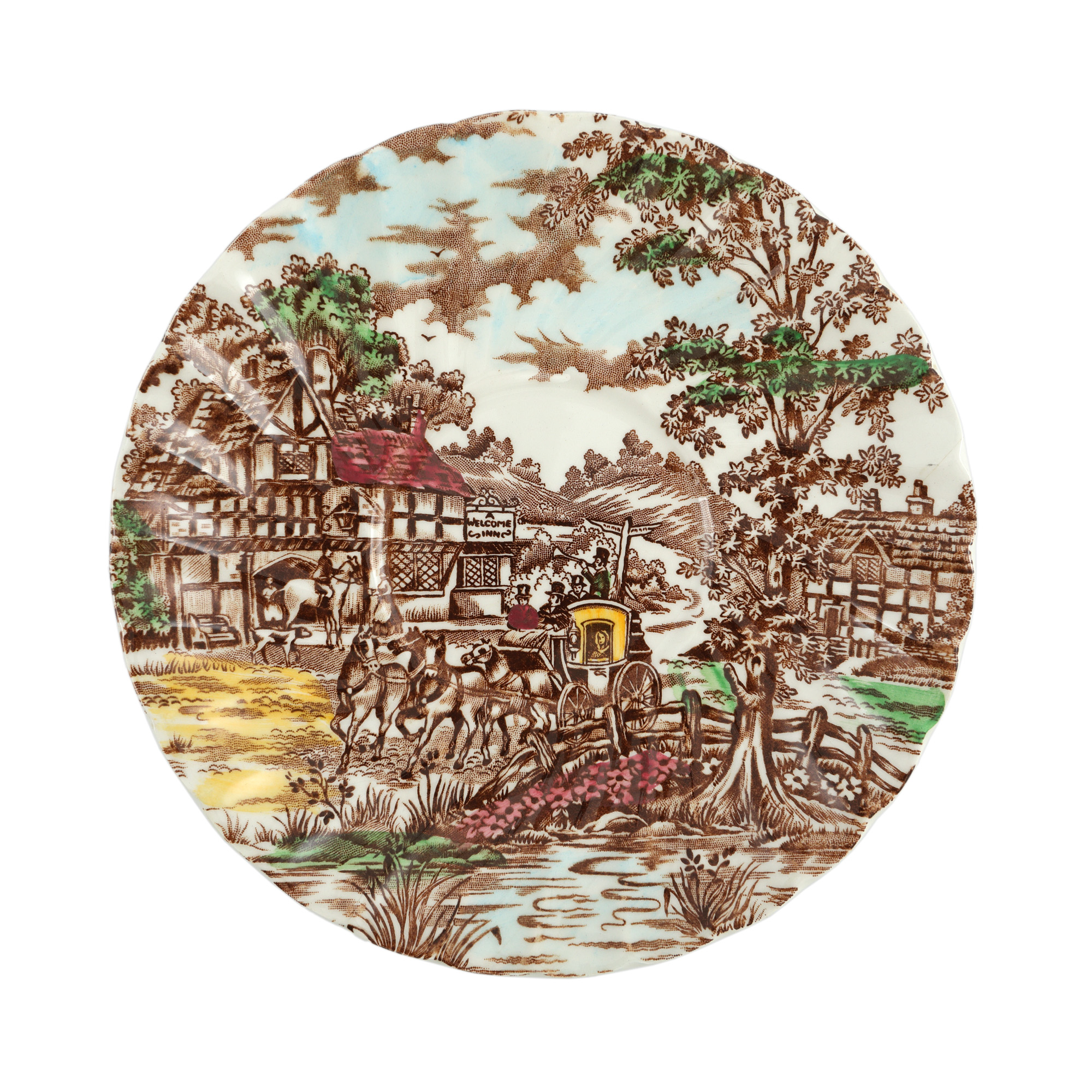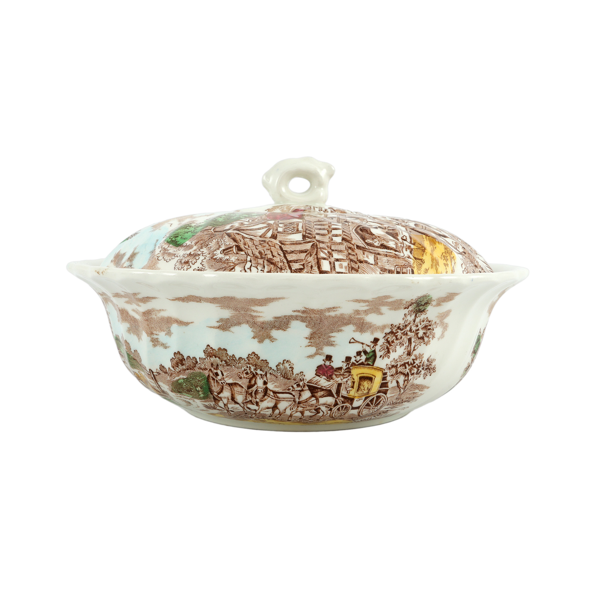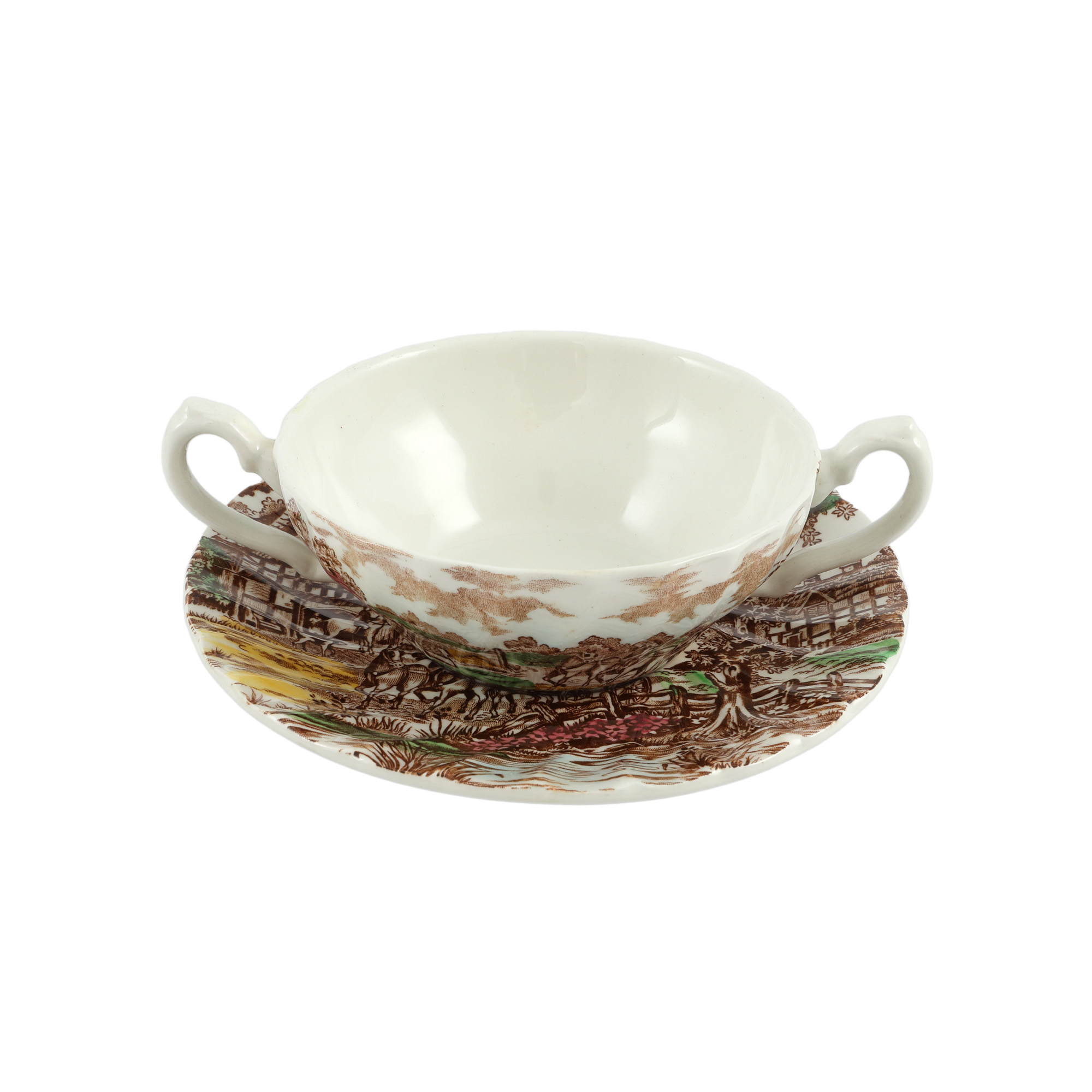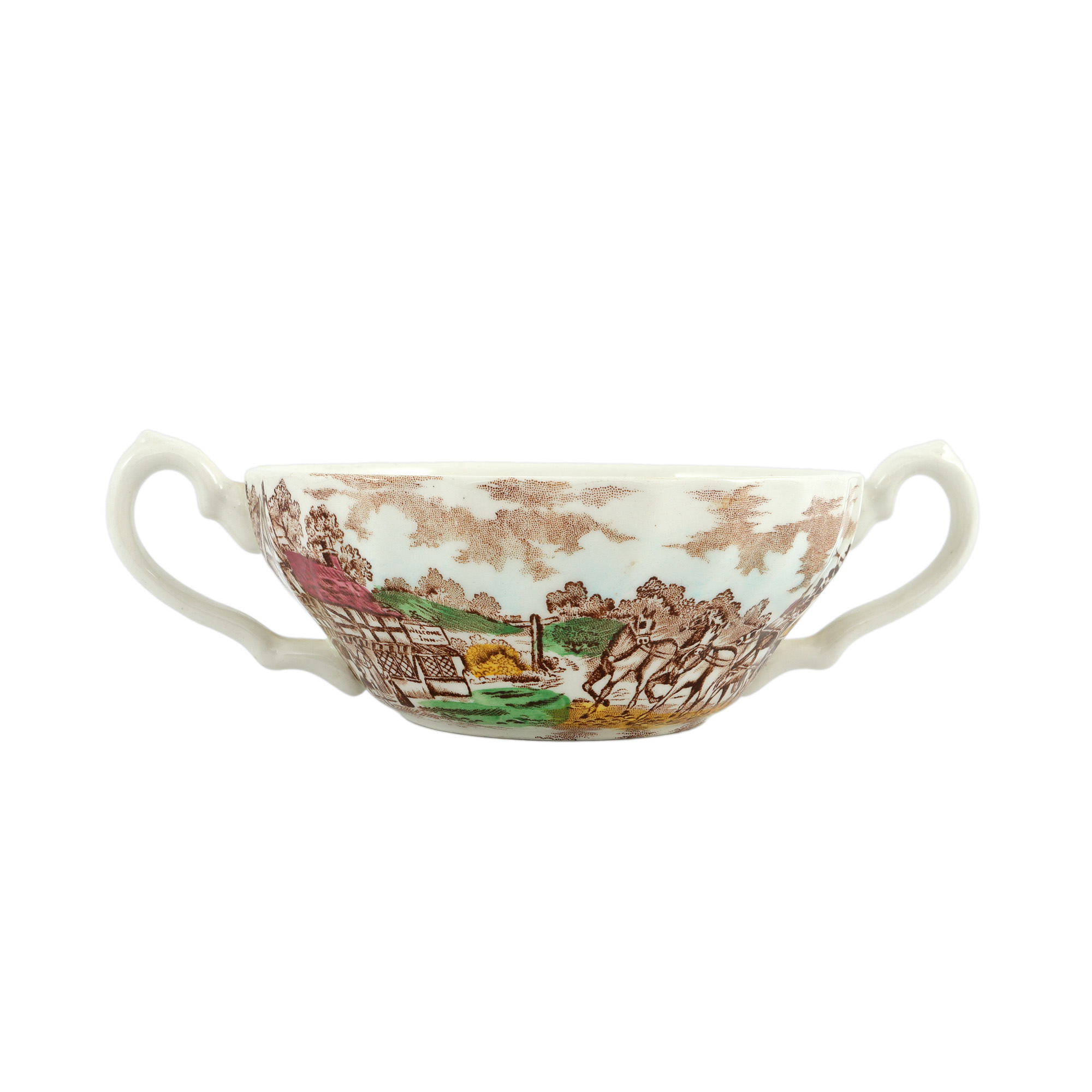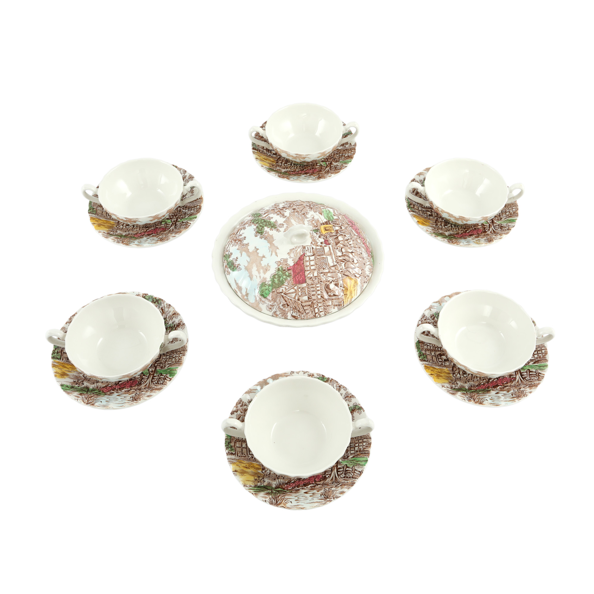 143. Serviciu din porțelan pentru supă cremă, pentru șase persoane, format din castroane, farfurii și supieră, decorate cu peisaje bucolice englezești, cca. 1950