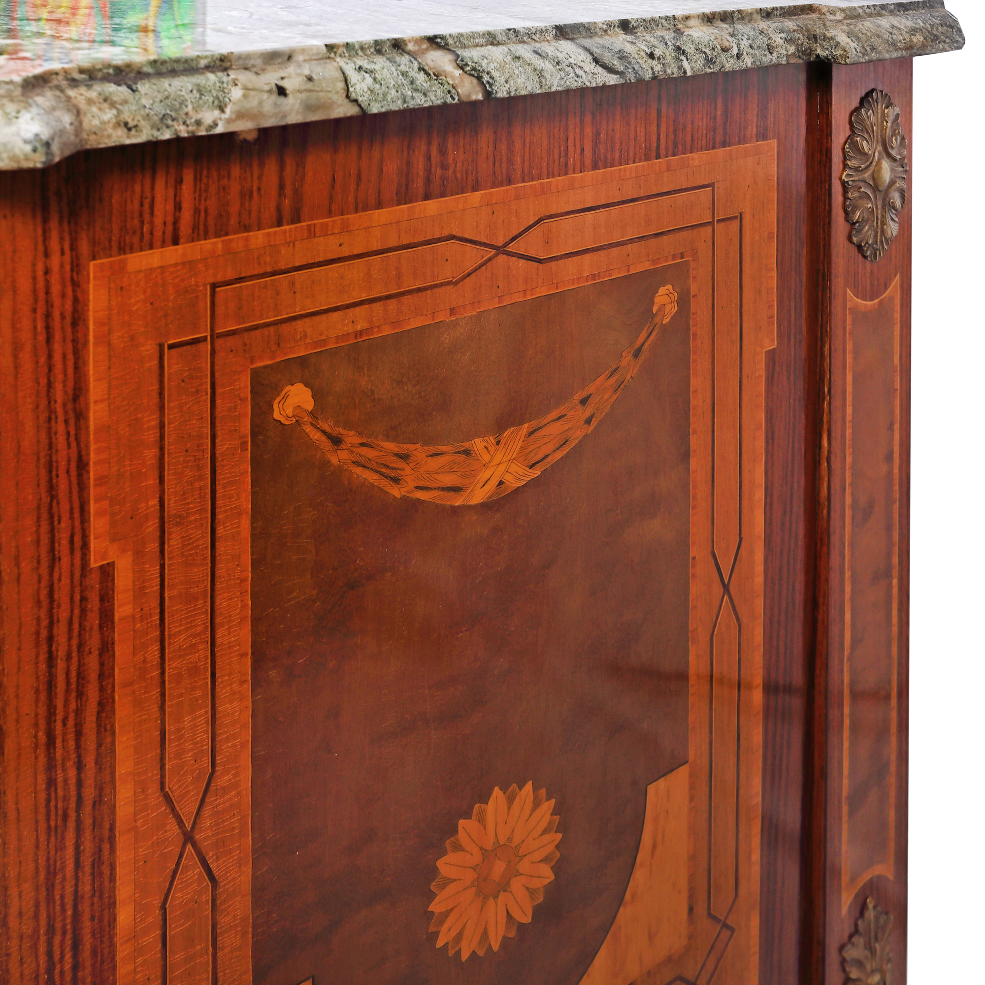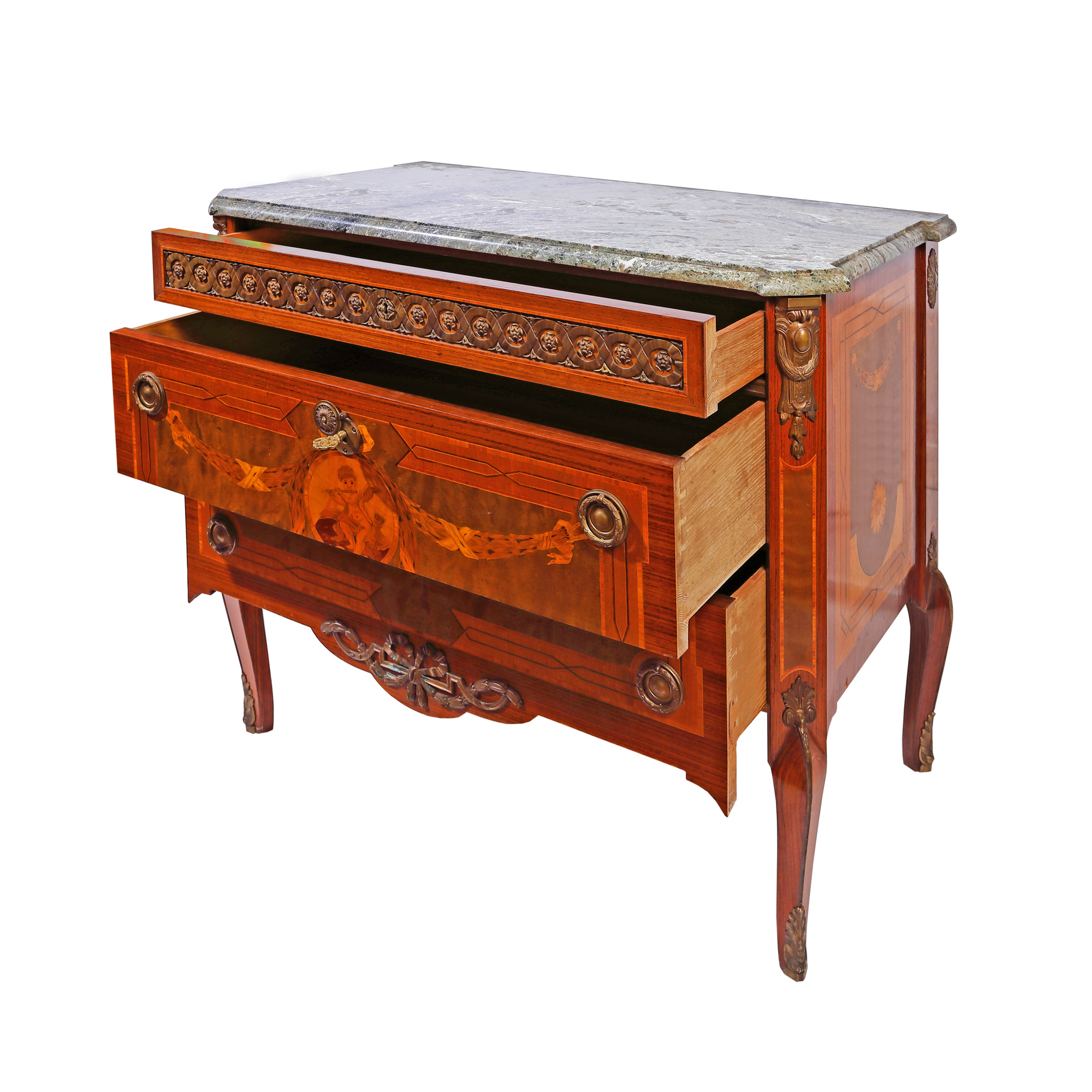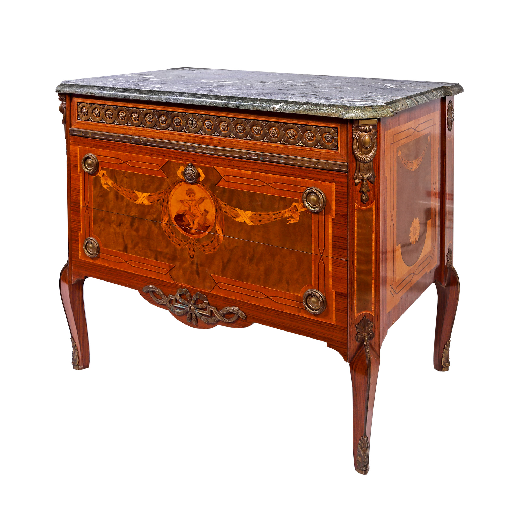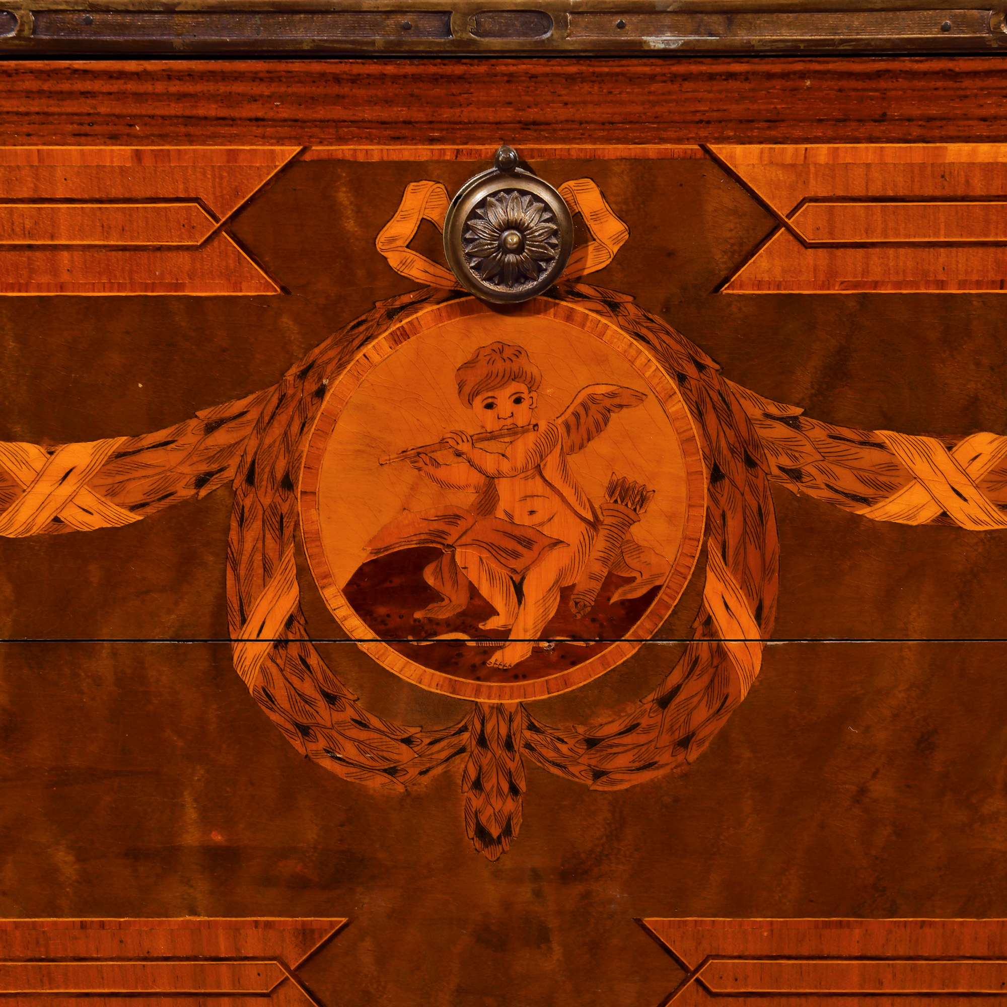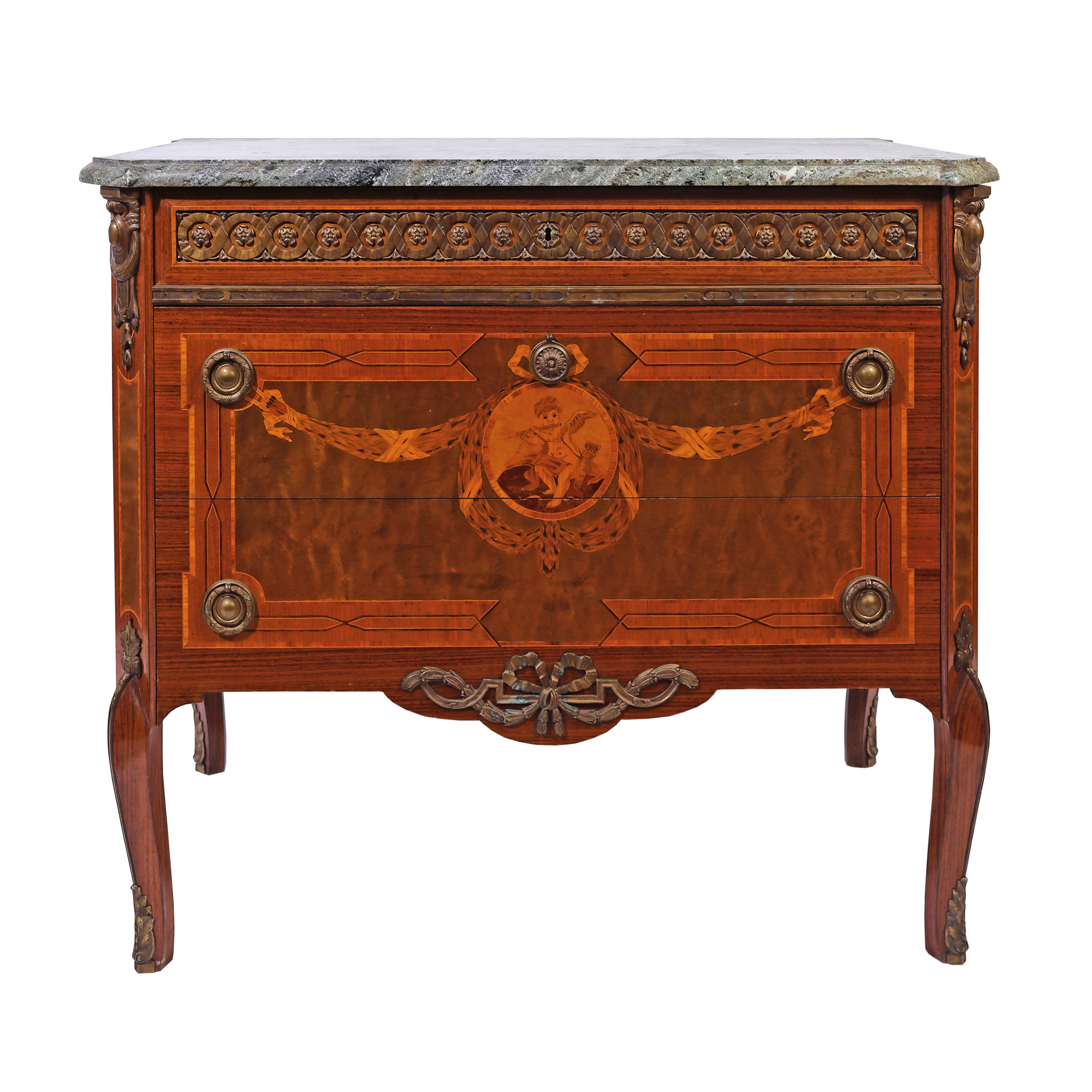 85. Comodă în manieră Regence, decorată cu marchetărie ilustrându-l pe Eros cântând la flaut, sfârșitul sec. XIX
