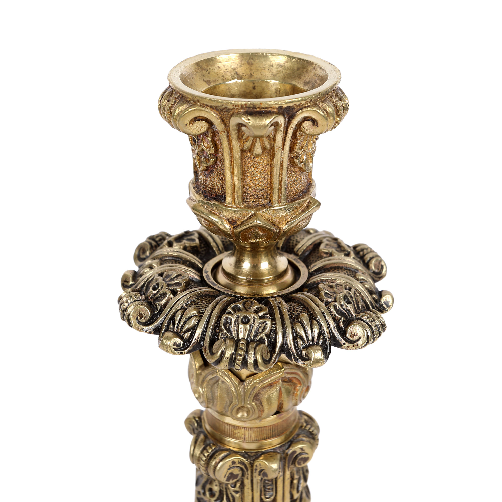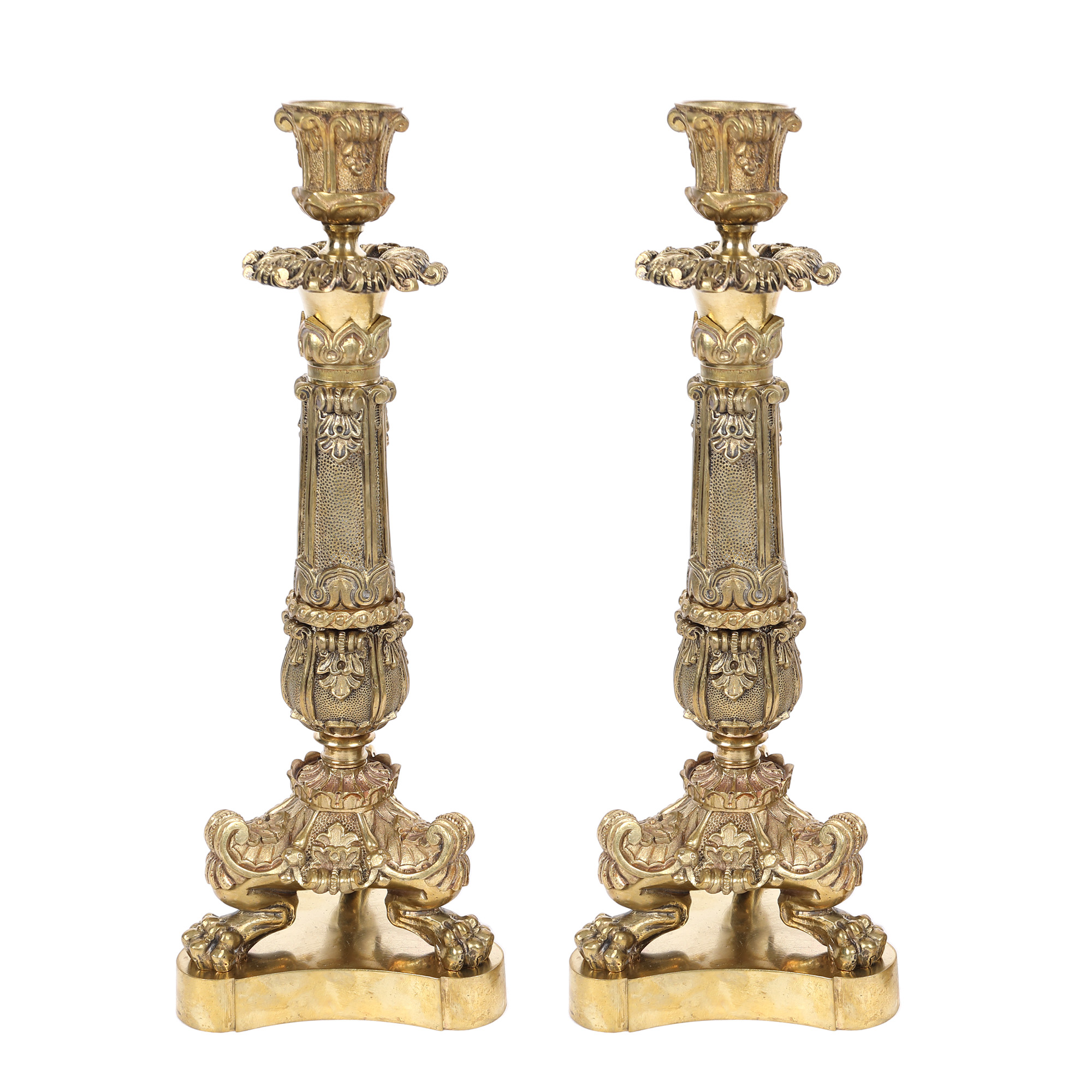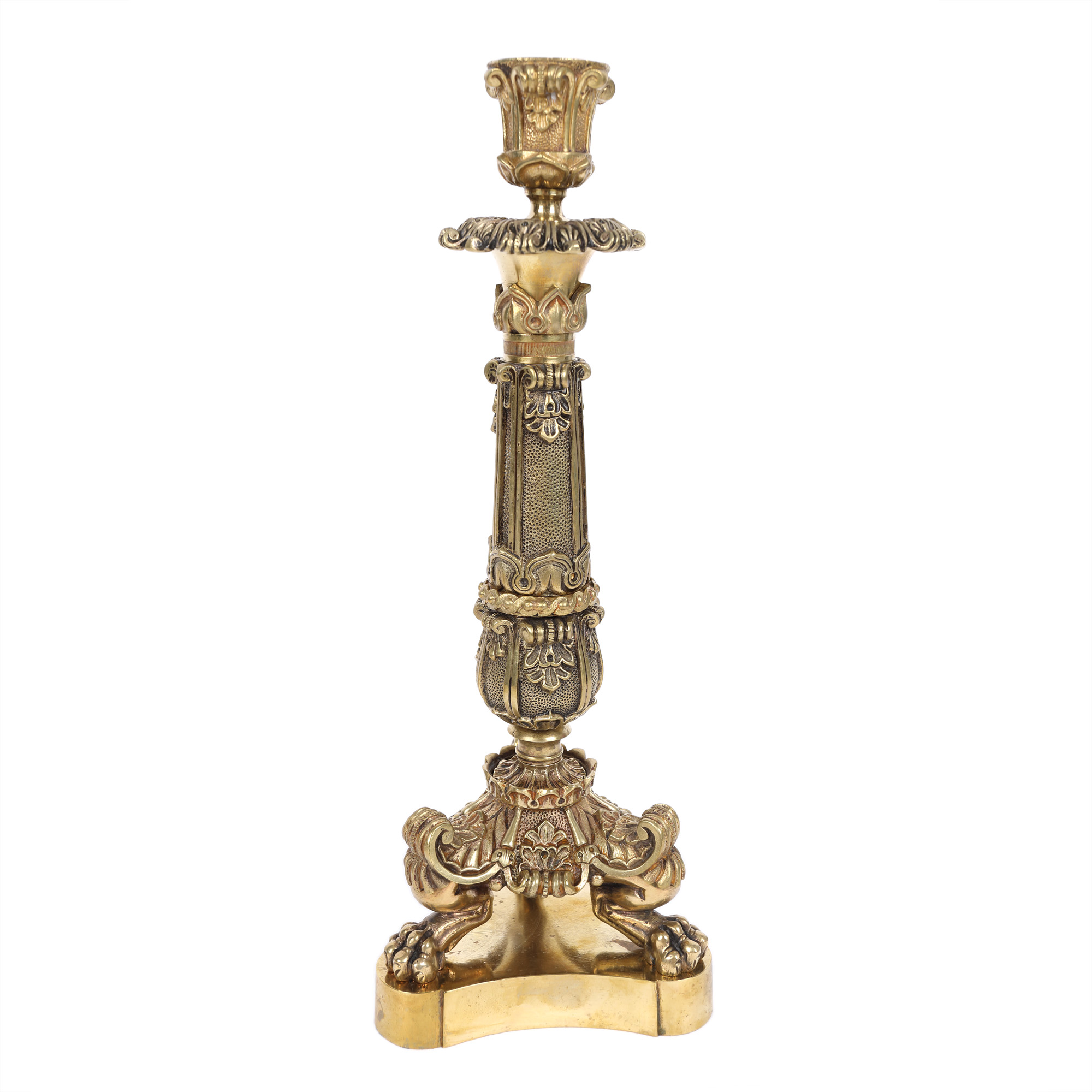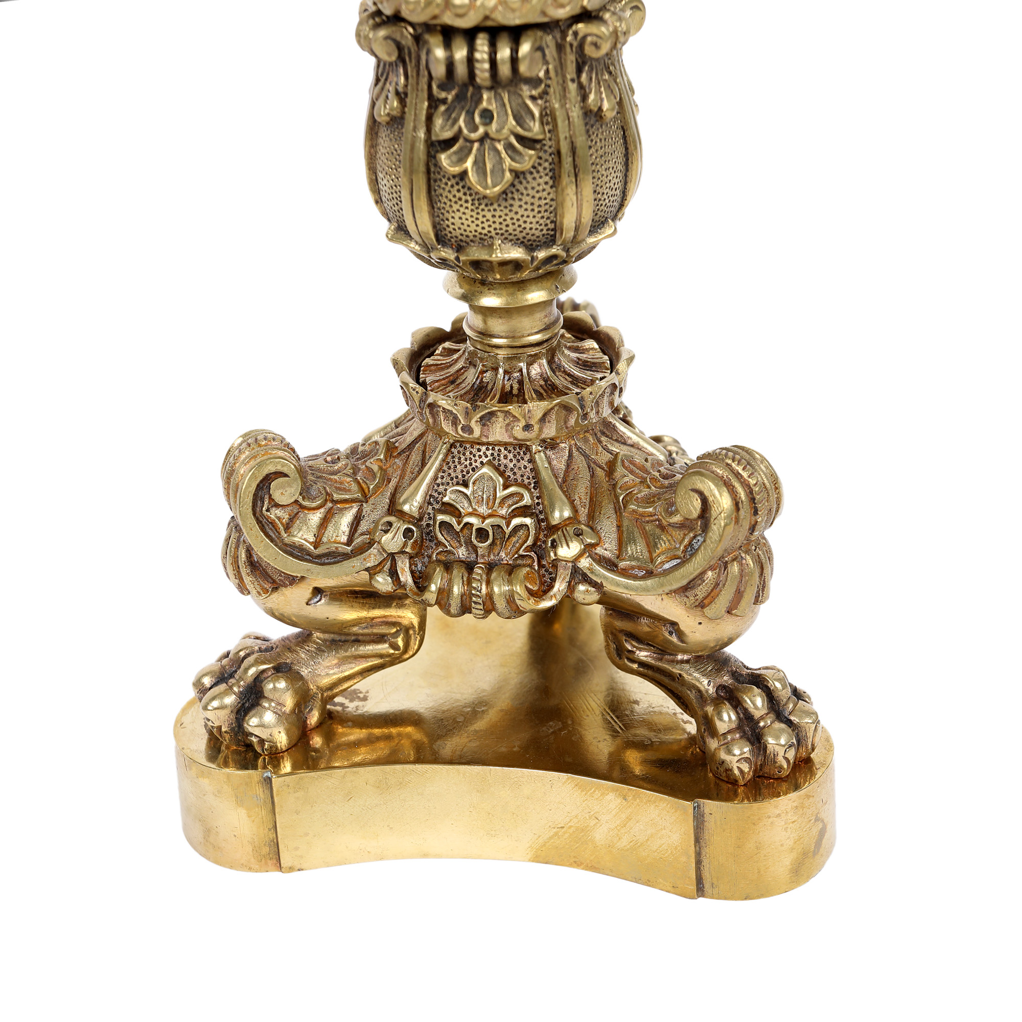 163. Pereche de sfeșnice în stil Empire, din bronz, decorate cu picioare de leu, atribuit atelier Ravrio, cca. 1820, provine din colecția Maria Victoria Dimo