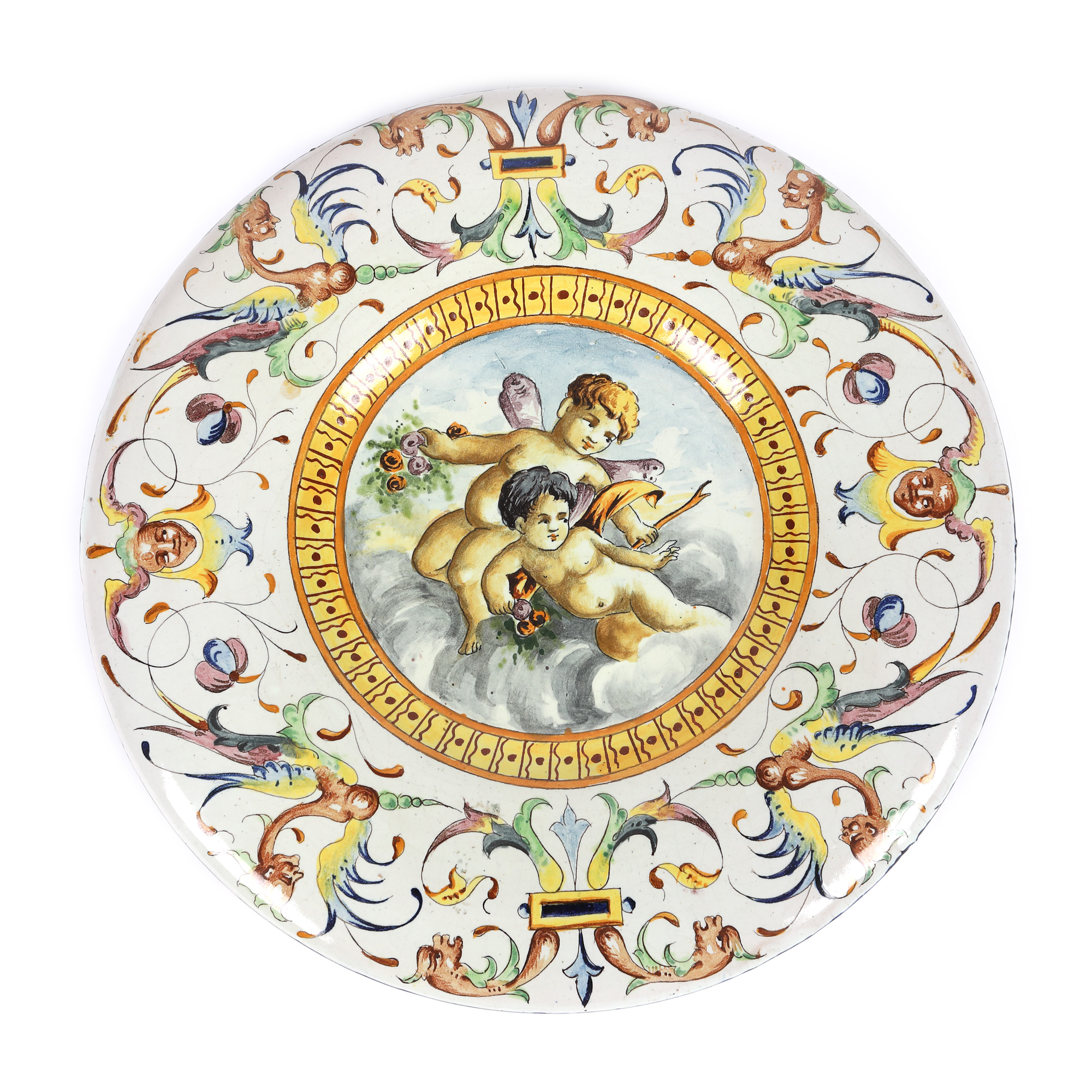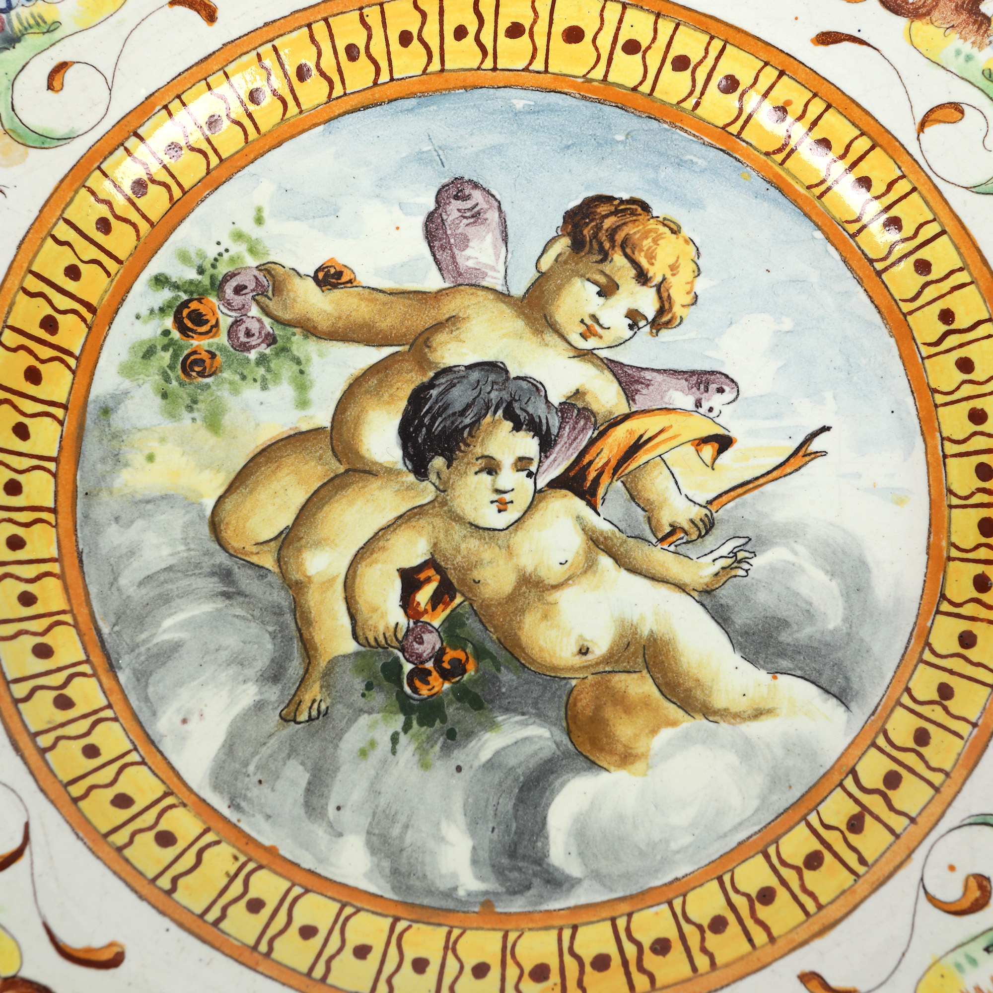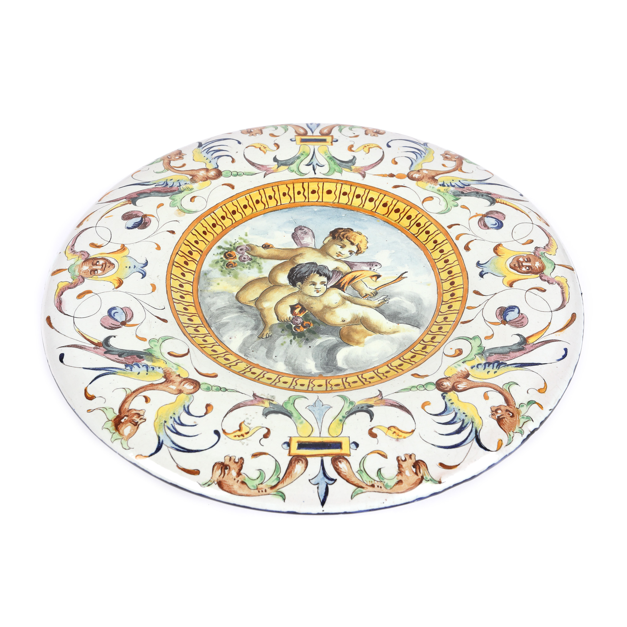 102. Platou decorativ din ceramică, pictat manual cu decor renascentist, atribuit Angelo Minghetti, sec. XIX