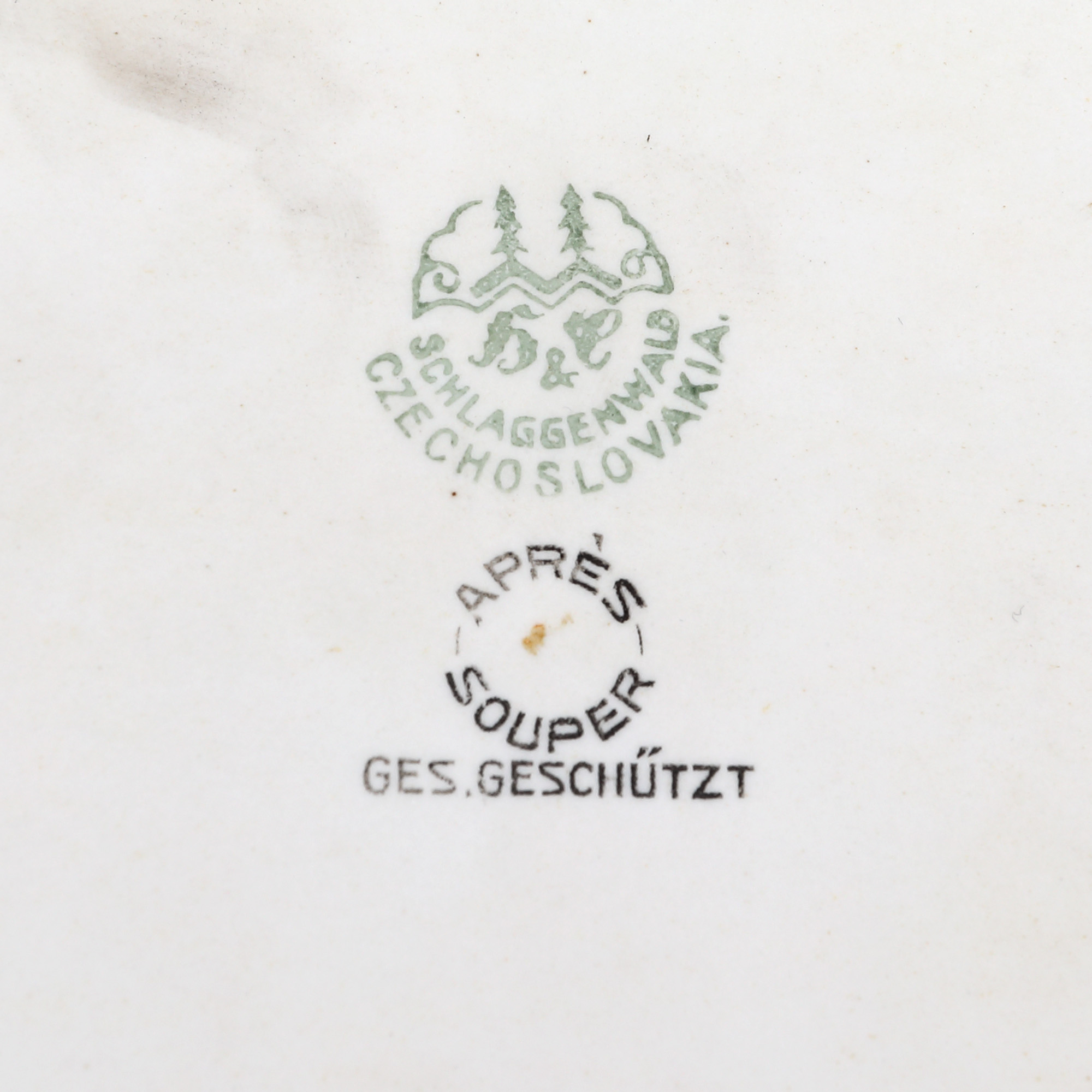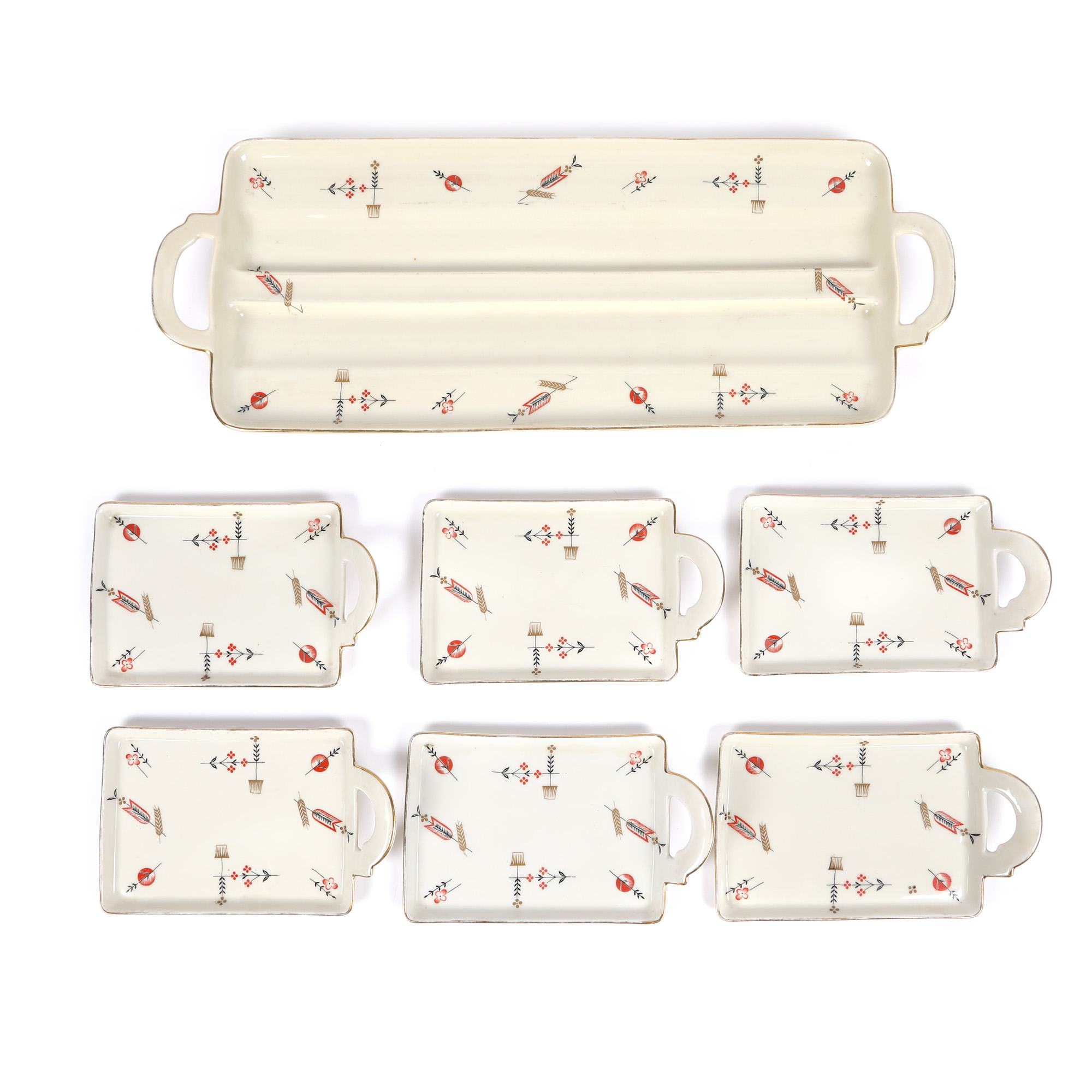 164. Serviciu Art Deco, pentru aperitive, din porțelan Haas & Czjzek (Schlaggenwald), format din platou și șase platouri pentru servit, decorat Art Deco, cca. 1920-1930, provine din colecția Maria Victoria Dimo