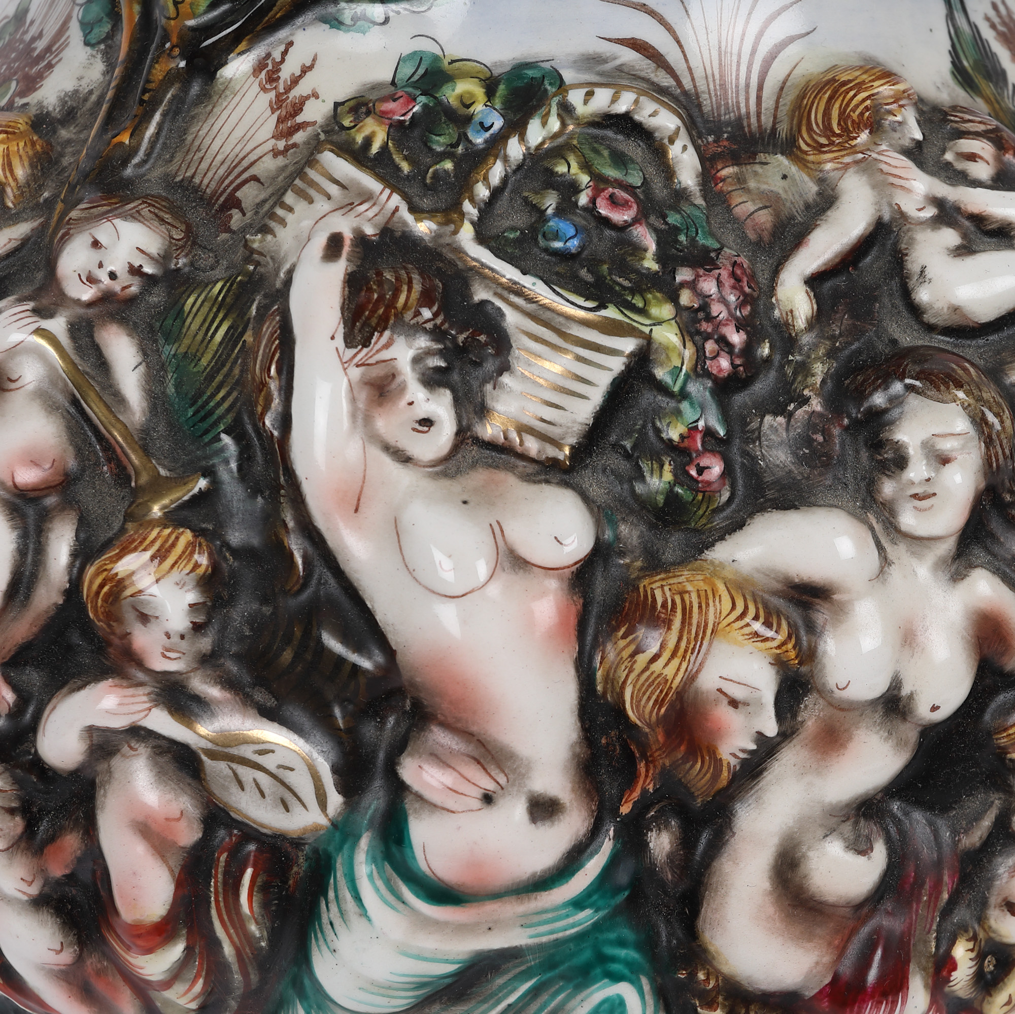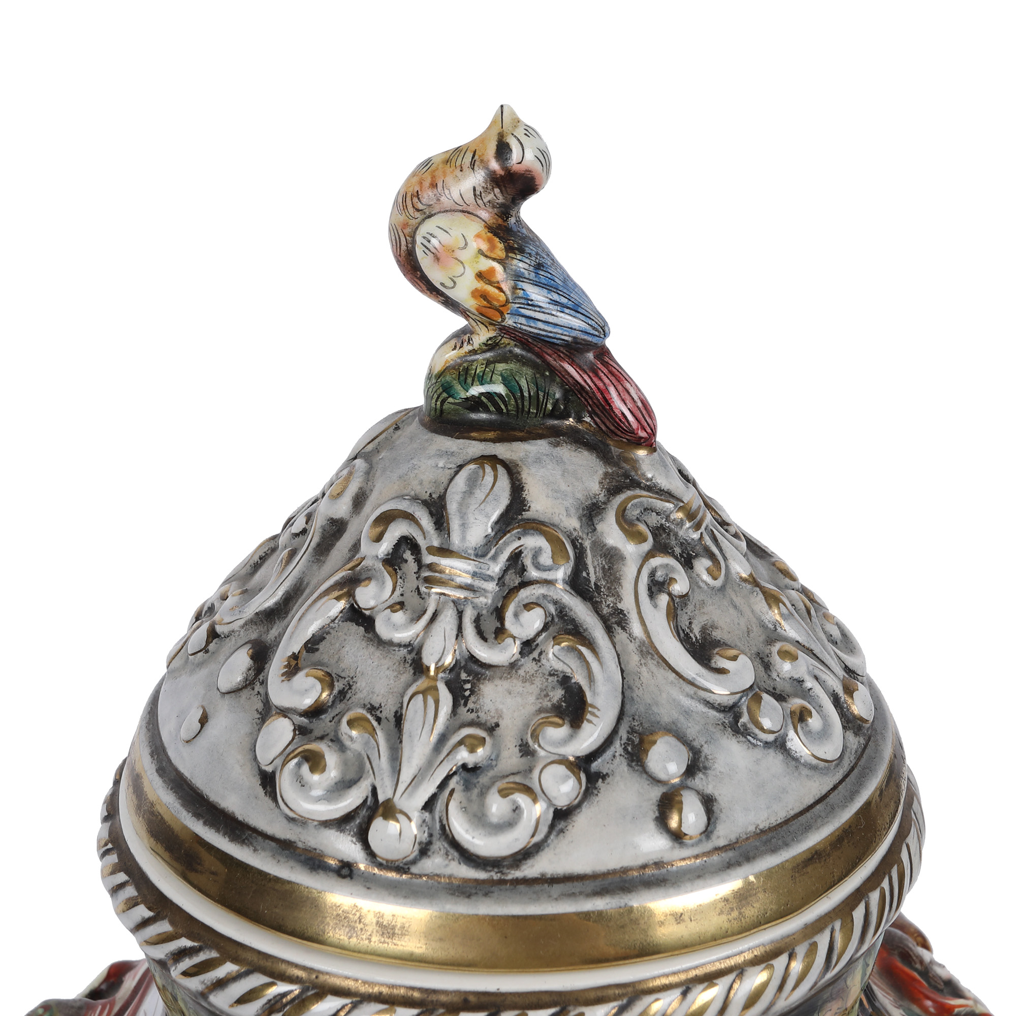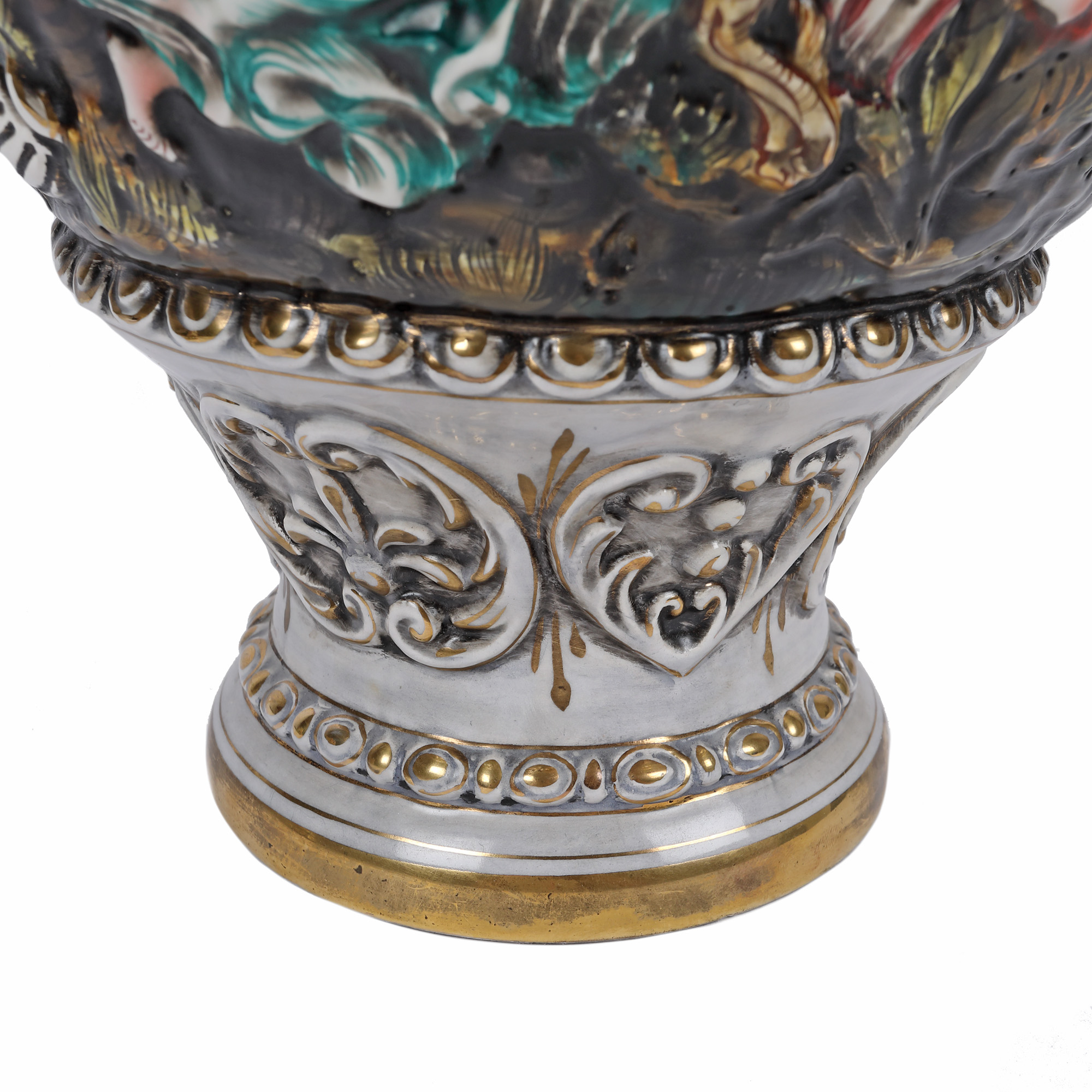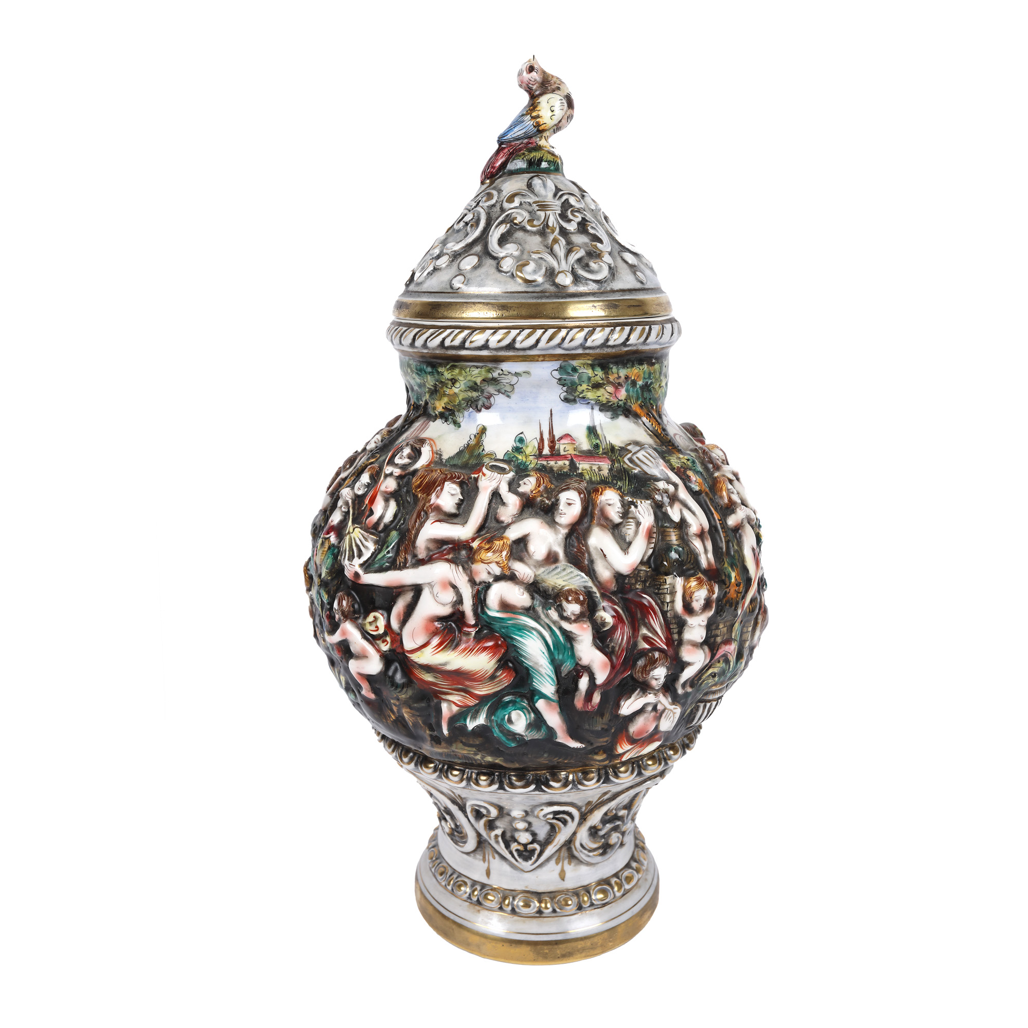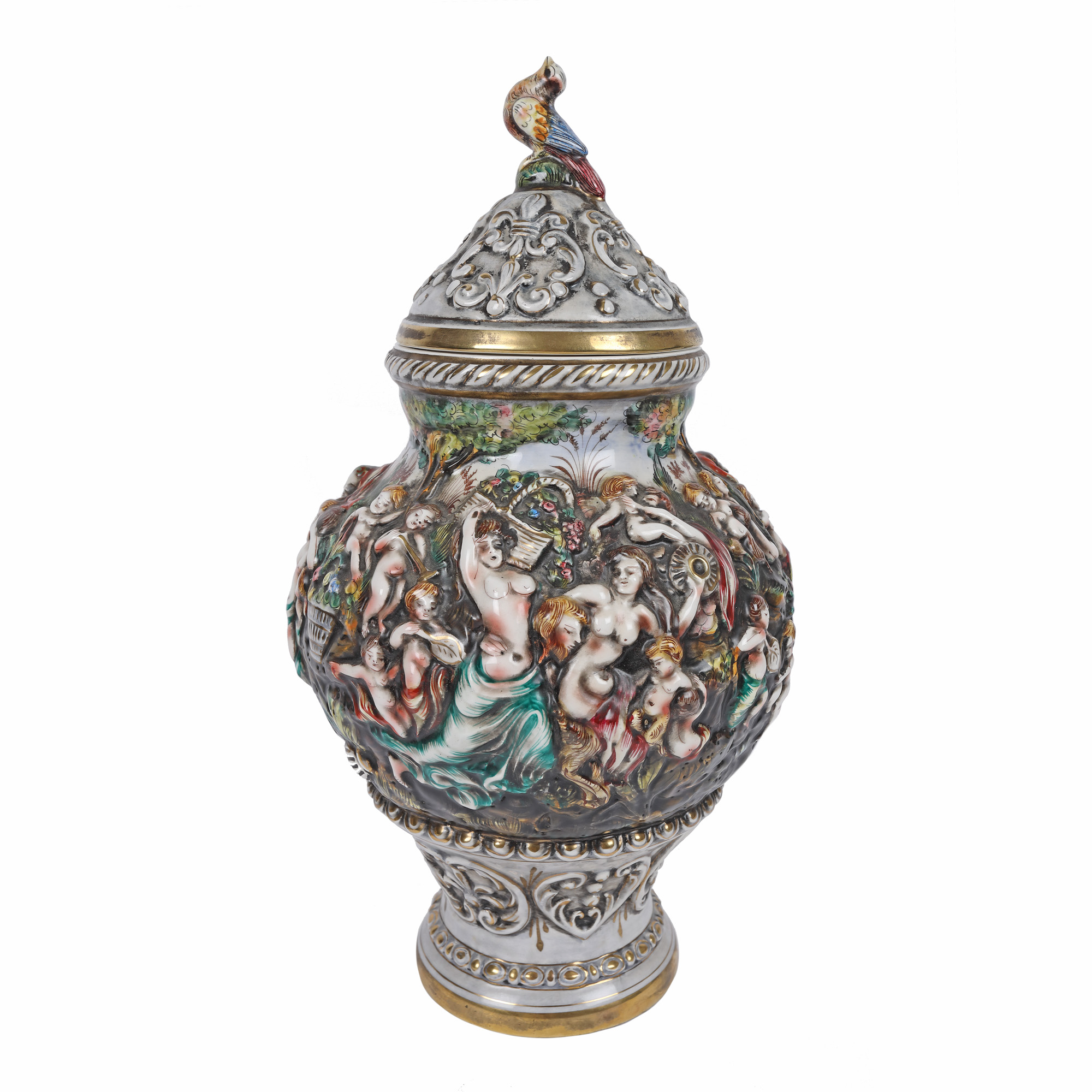 139. Vas cu capac din porțelan Capodimonte, decorat cu scenă de festivitate în relief [A doua jumătate a sec. XX]