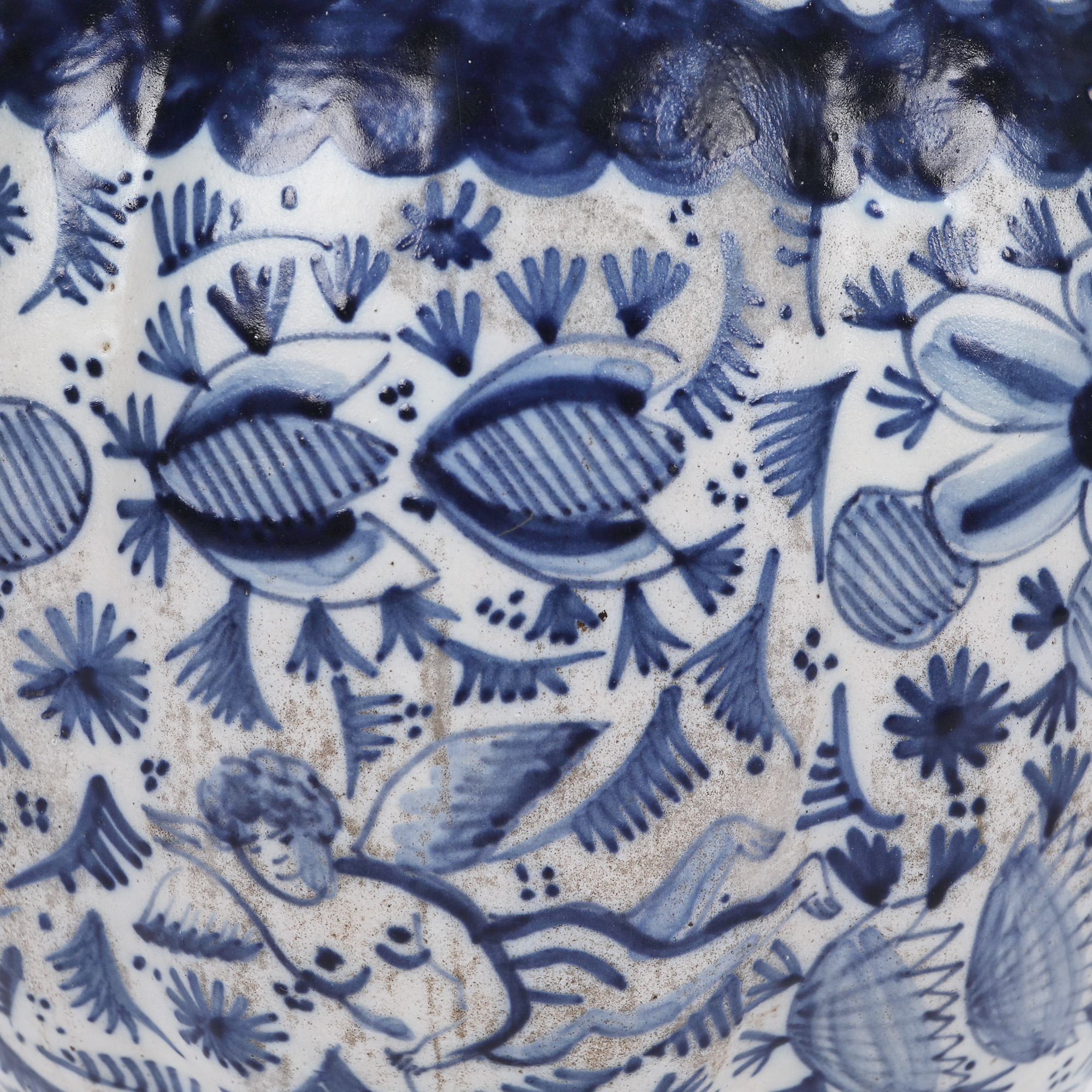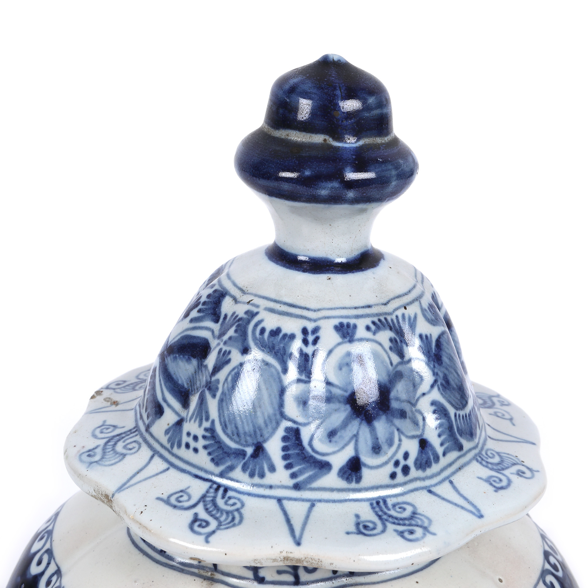 101. Vas Delft cu capac din ceramică pictată manual, decorat cu îngeri și lalele, atelier Lysbet van Schoonhoven, 1702, provine din colecția Garabet Avachian