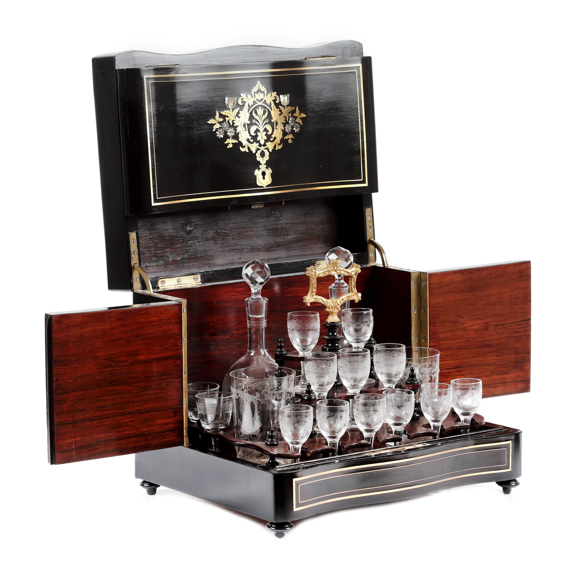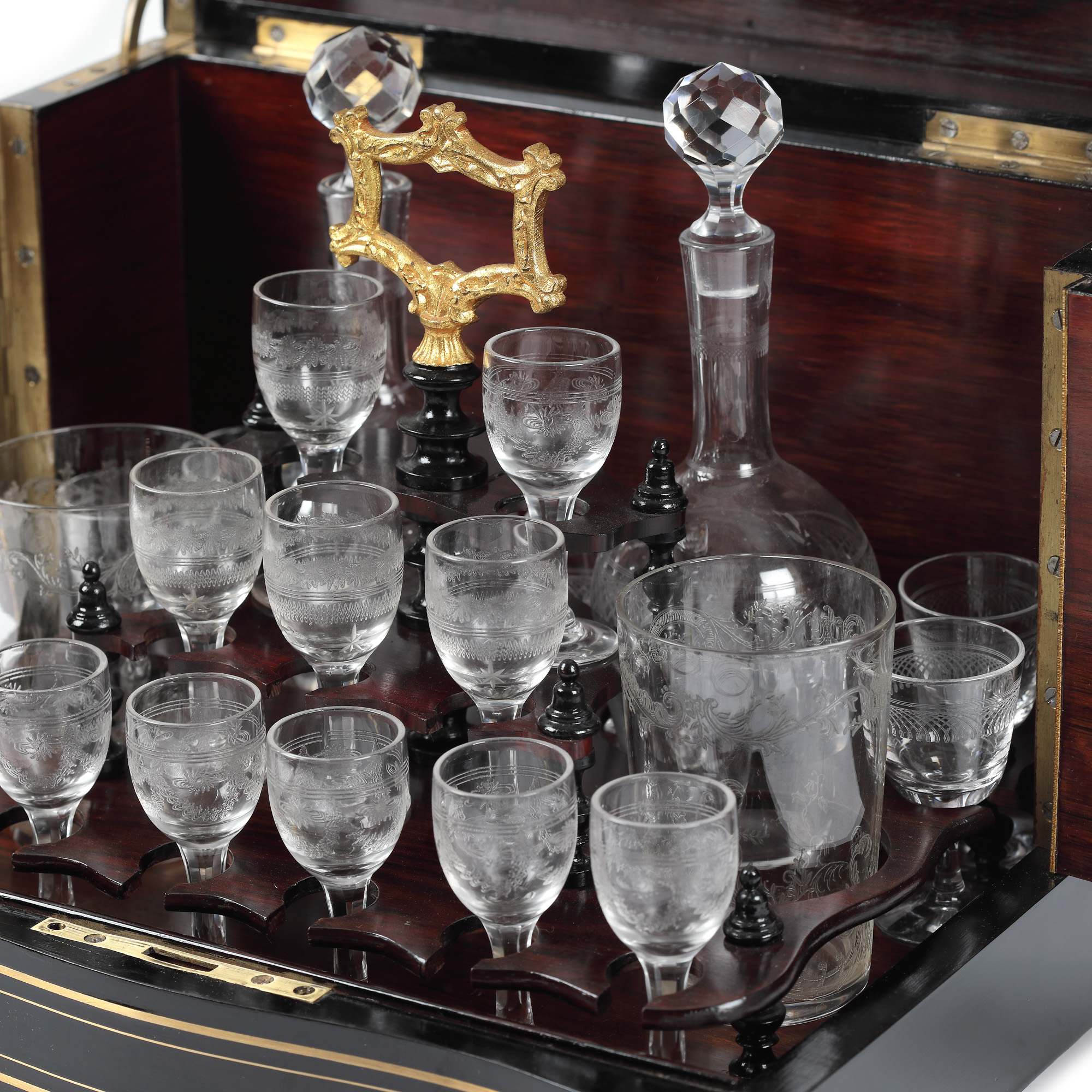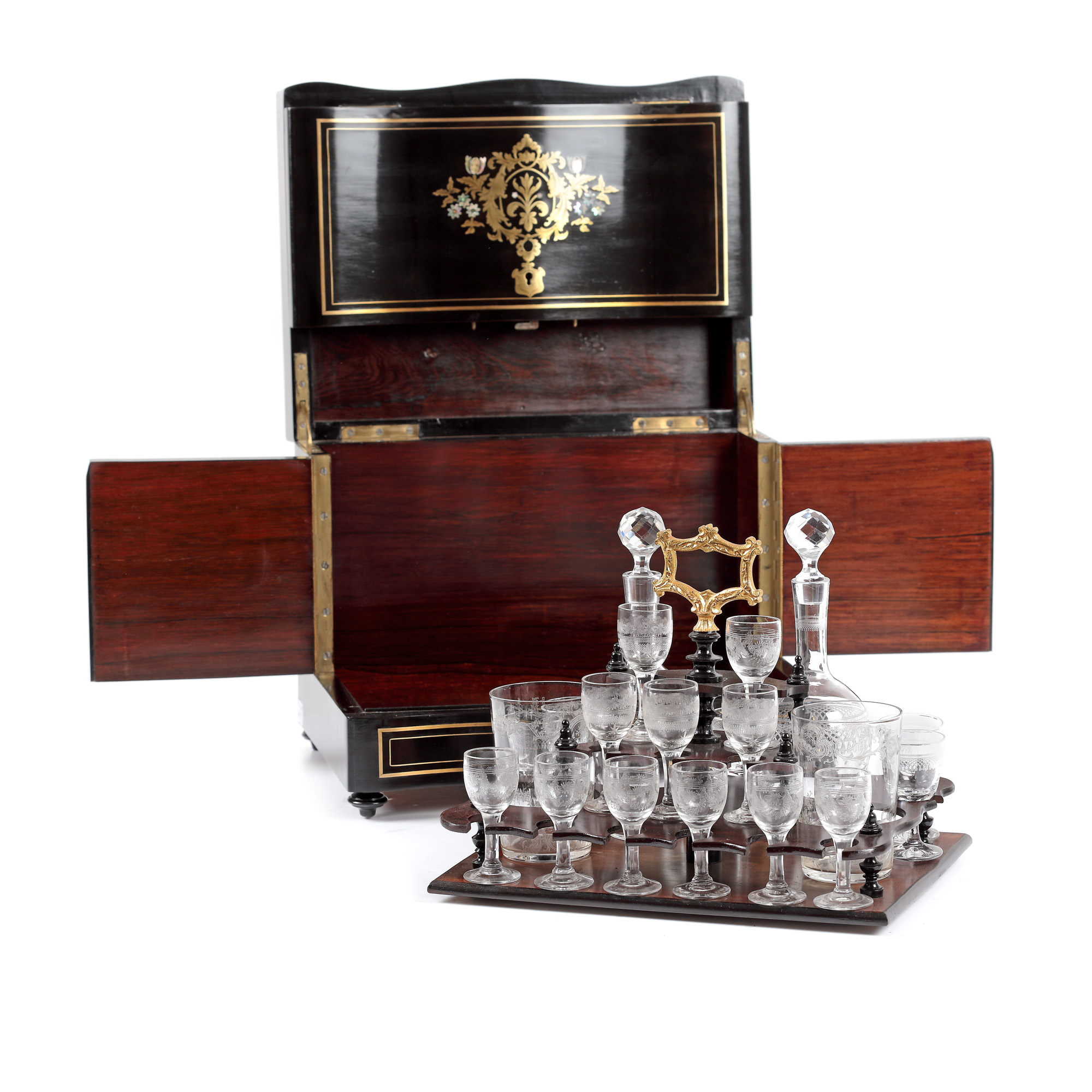 69. Bar de călătorie, în manieră Napoleon III, conține pahare și flacoane din cristal Baccarat, pentru băuturi licoroase, sfârșitul sec. XIX
