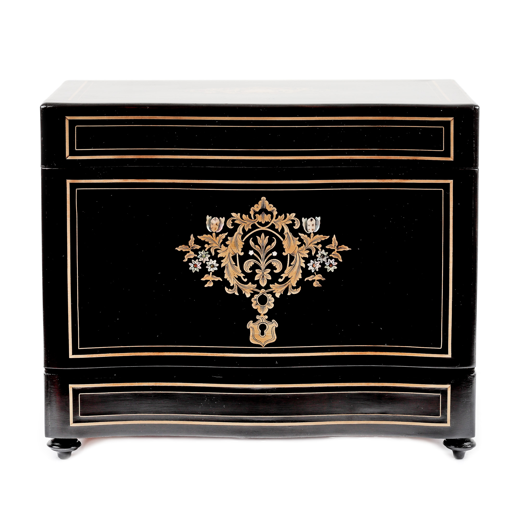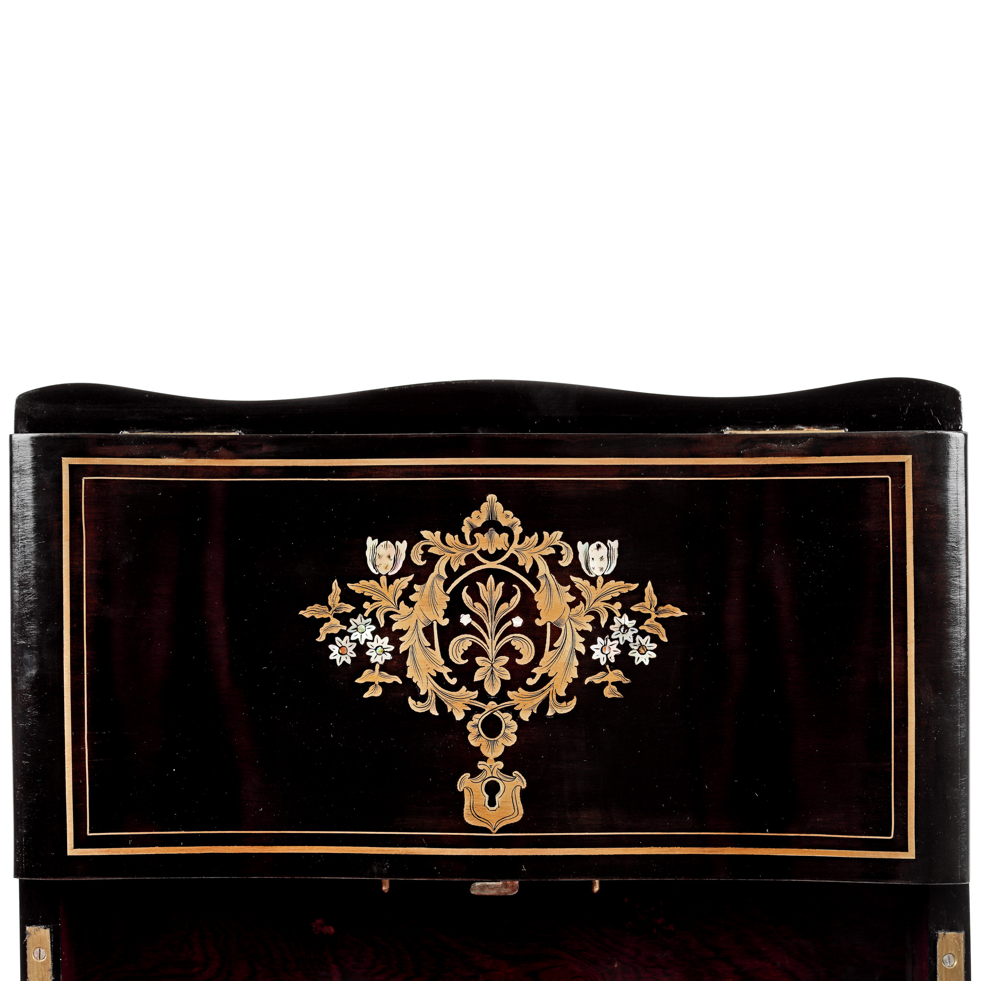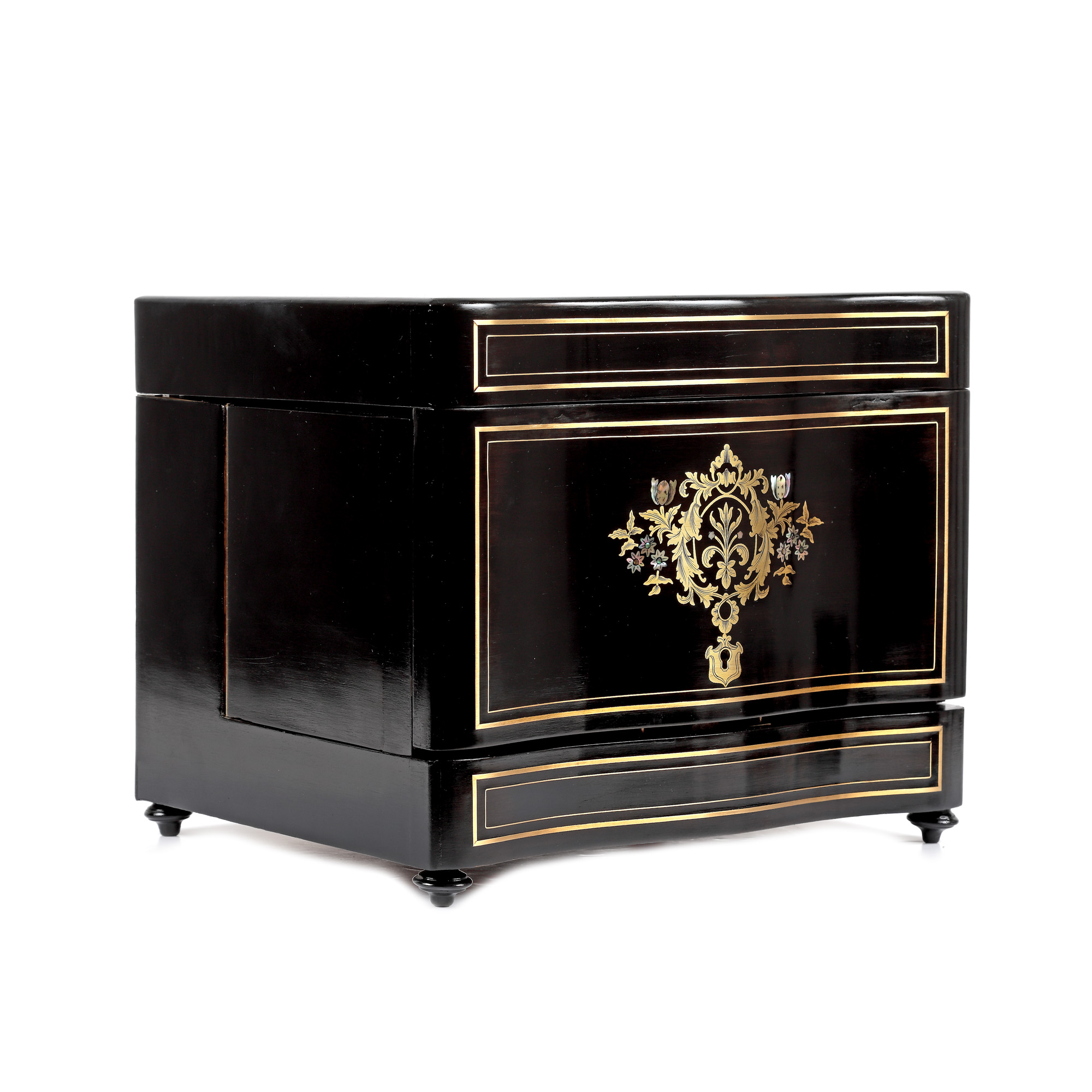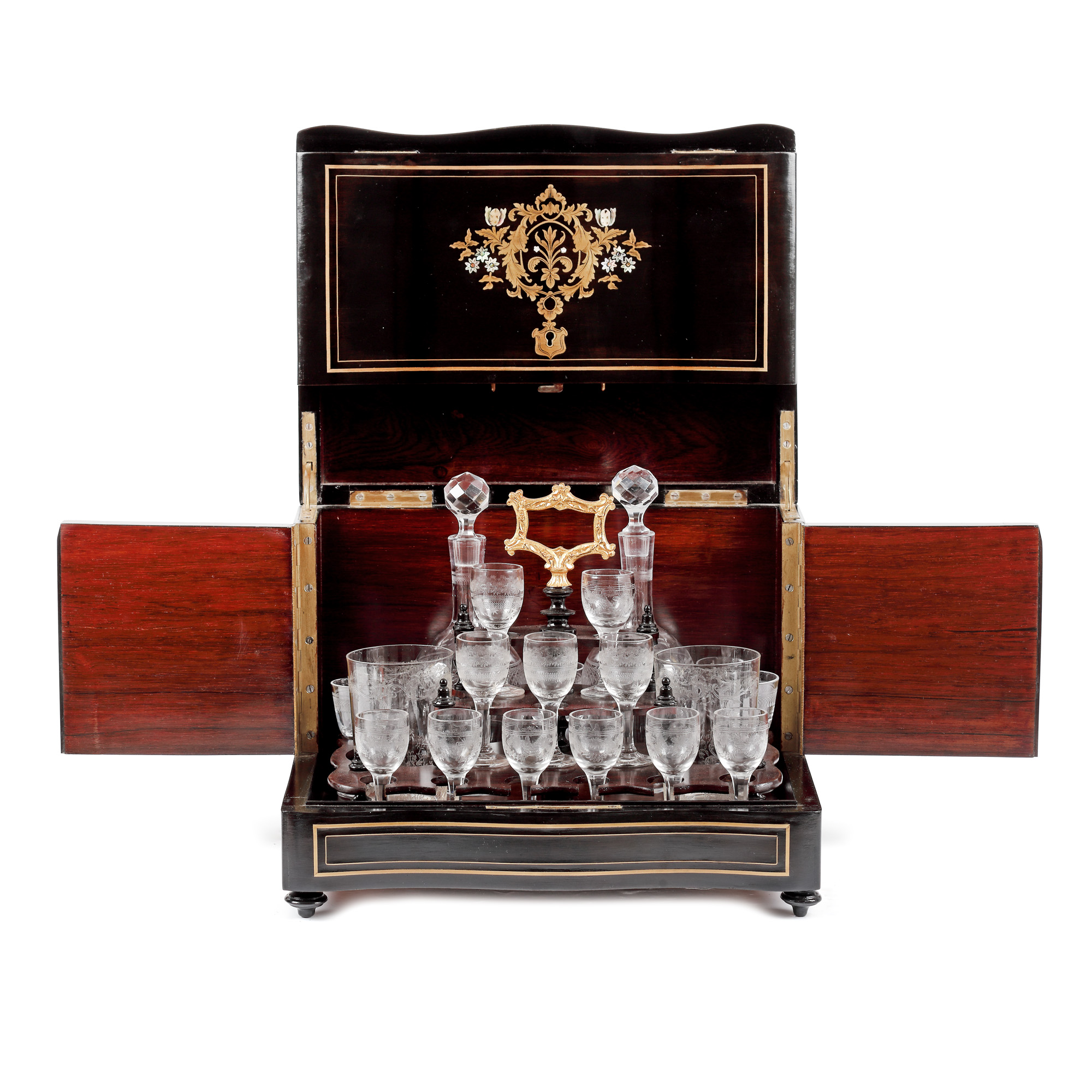 69. Bar de călătorie, în manieră Napoleon III, conține pahare și flacoane din cristal Baccarat, pentru băuturi licoroase, sfârșitul sec. XIX