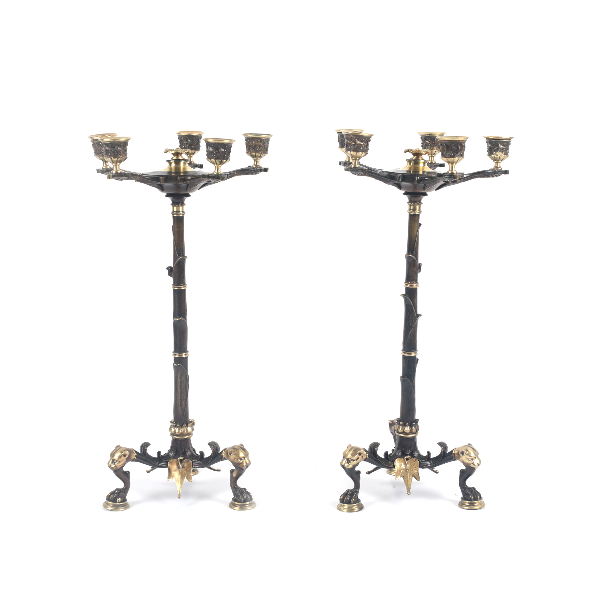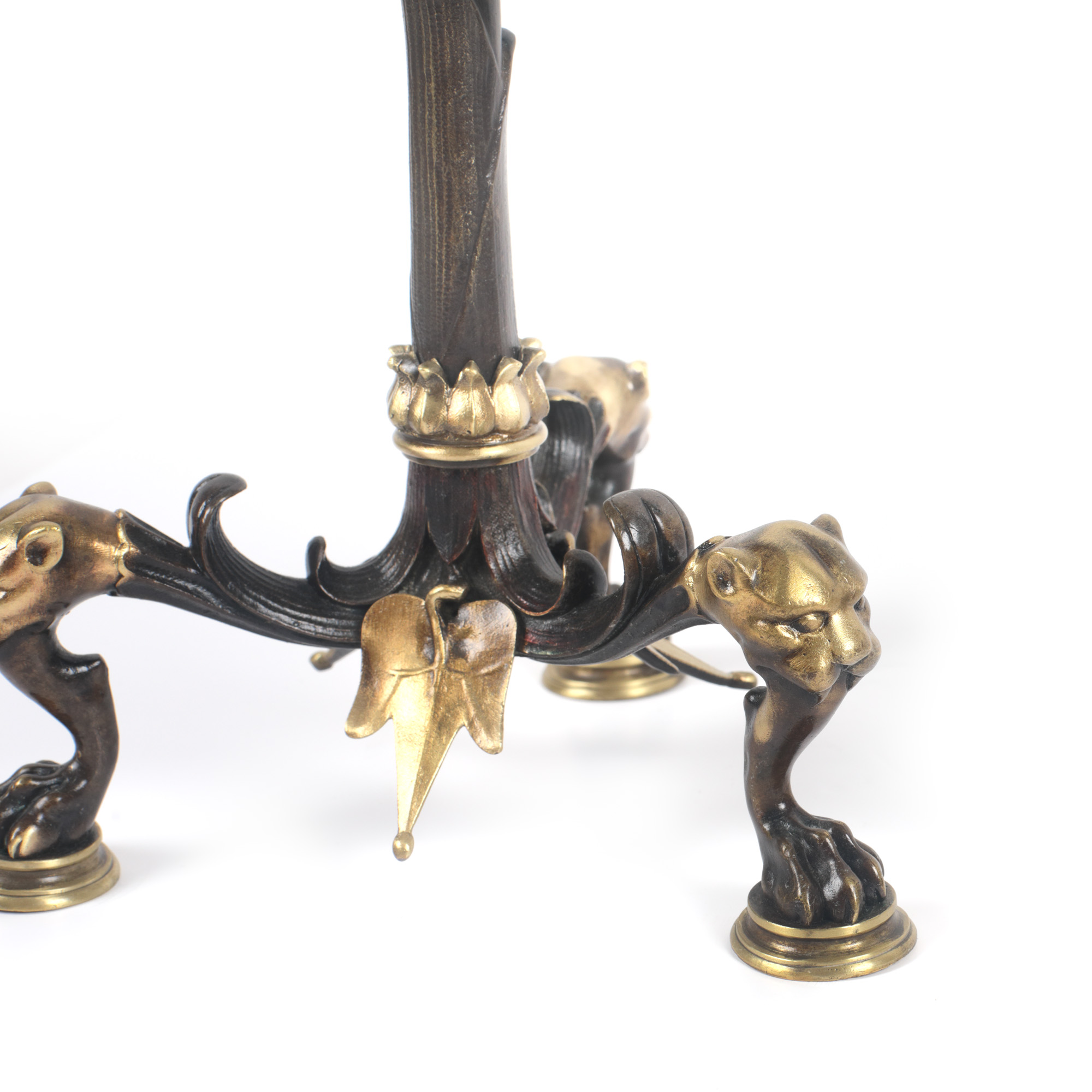 72. Pereche de sfeșnice Maison Marnyhac din bronz aurit și parțial patinat, decorată cu capete de leopard, sec. XIX