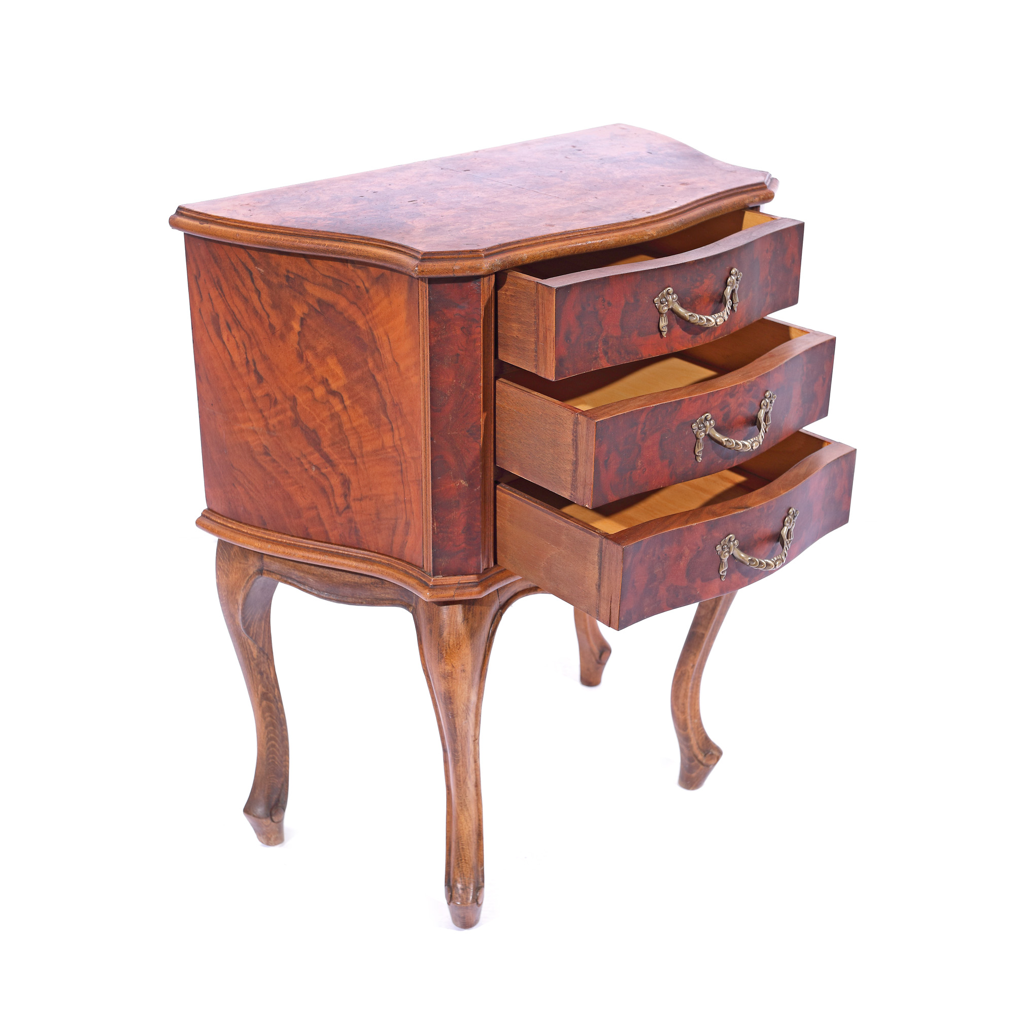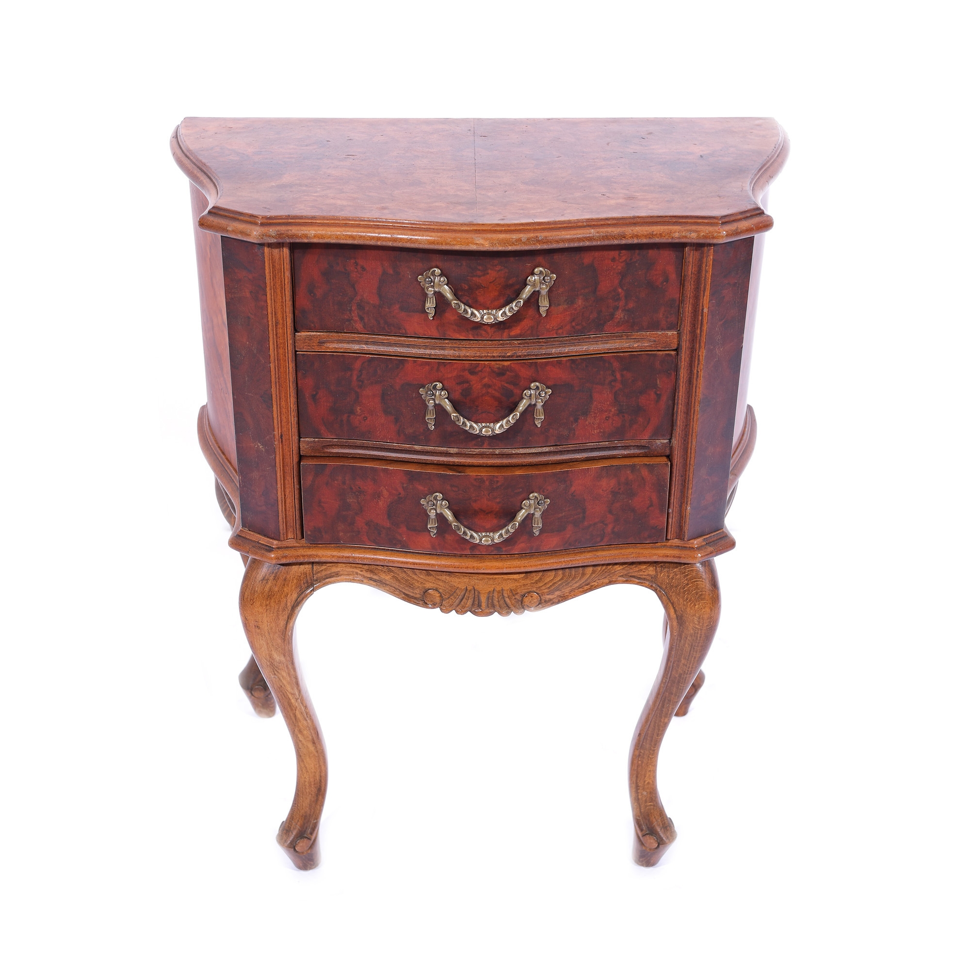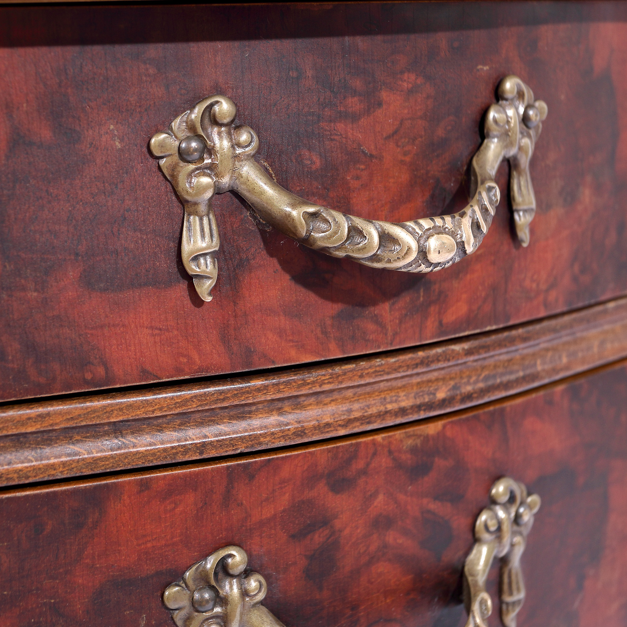186. Comodă cu trei sertare în manieră Louis XV, decorată cu furnir de nuc, începutul sec. XX