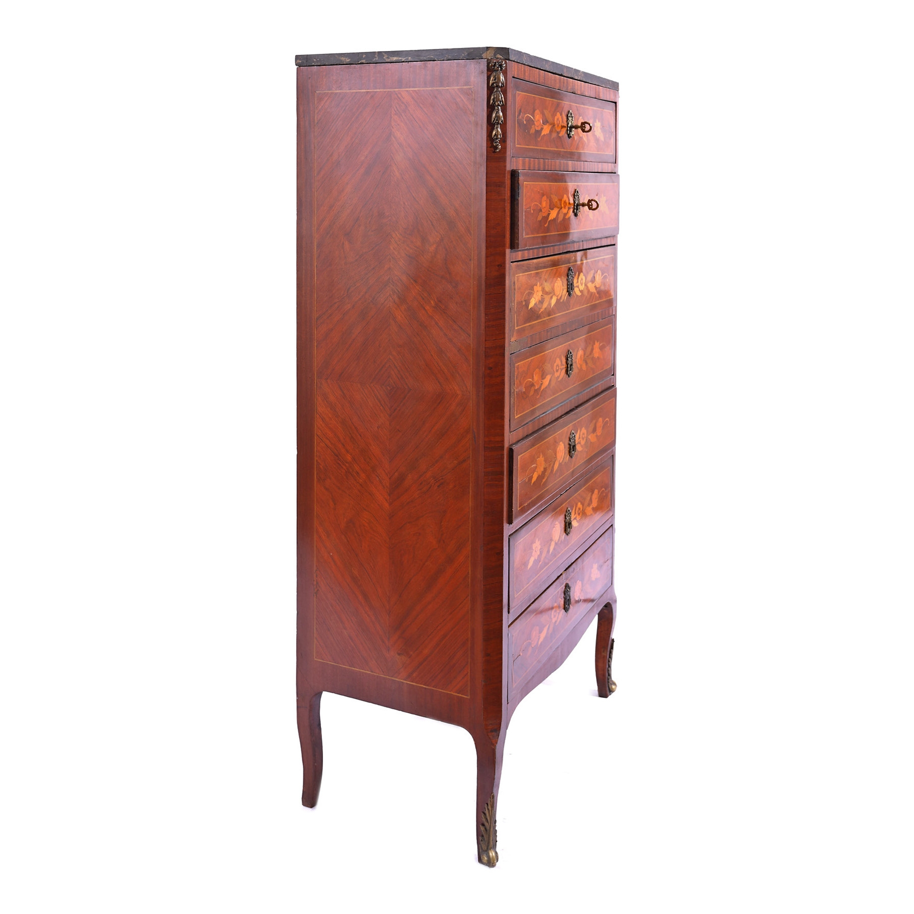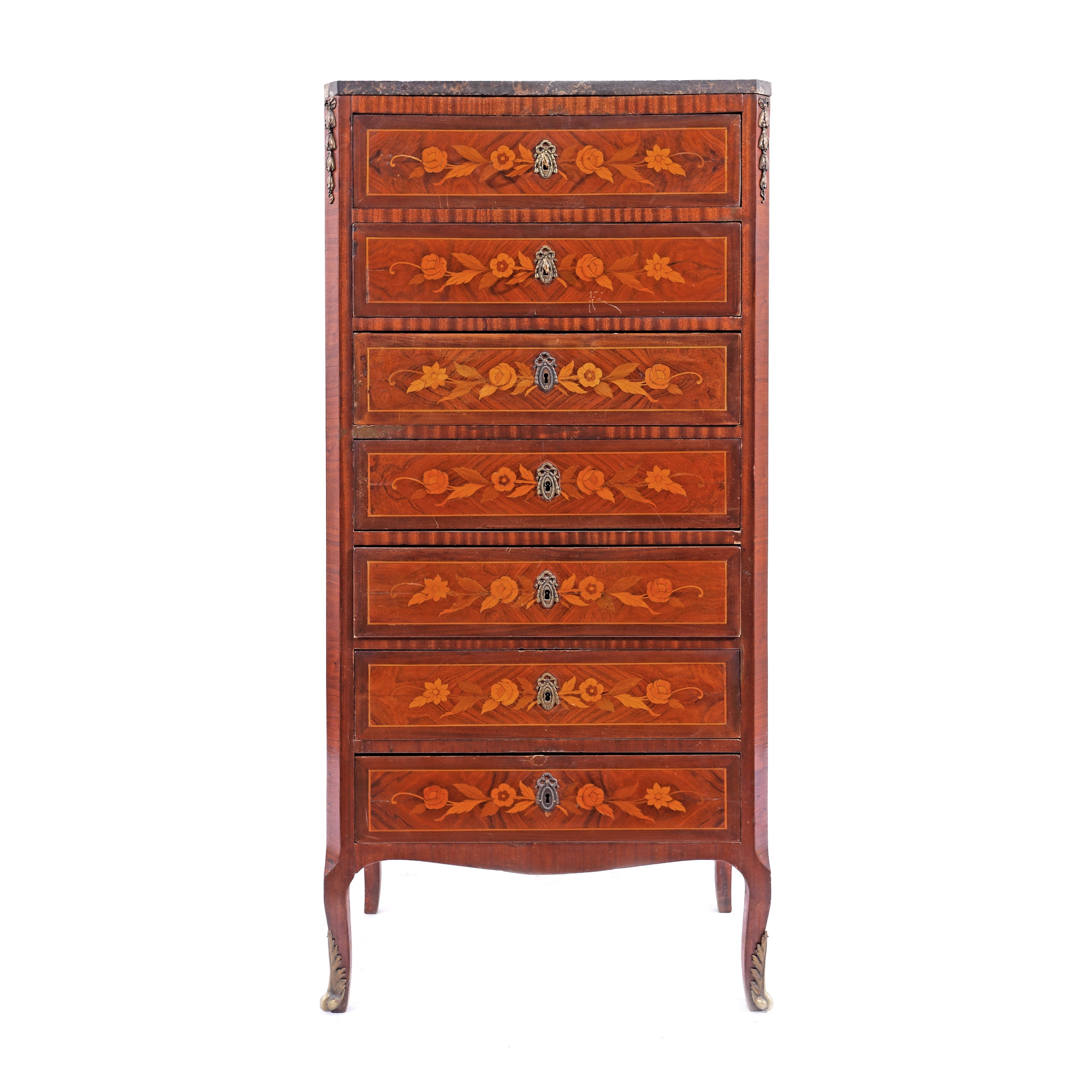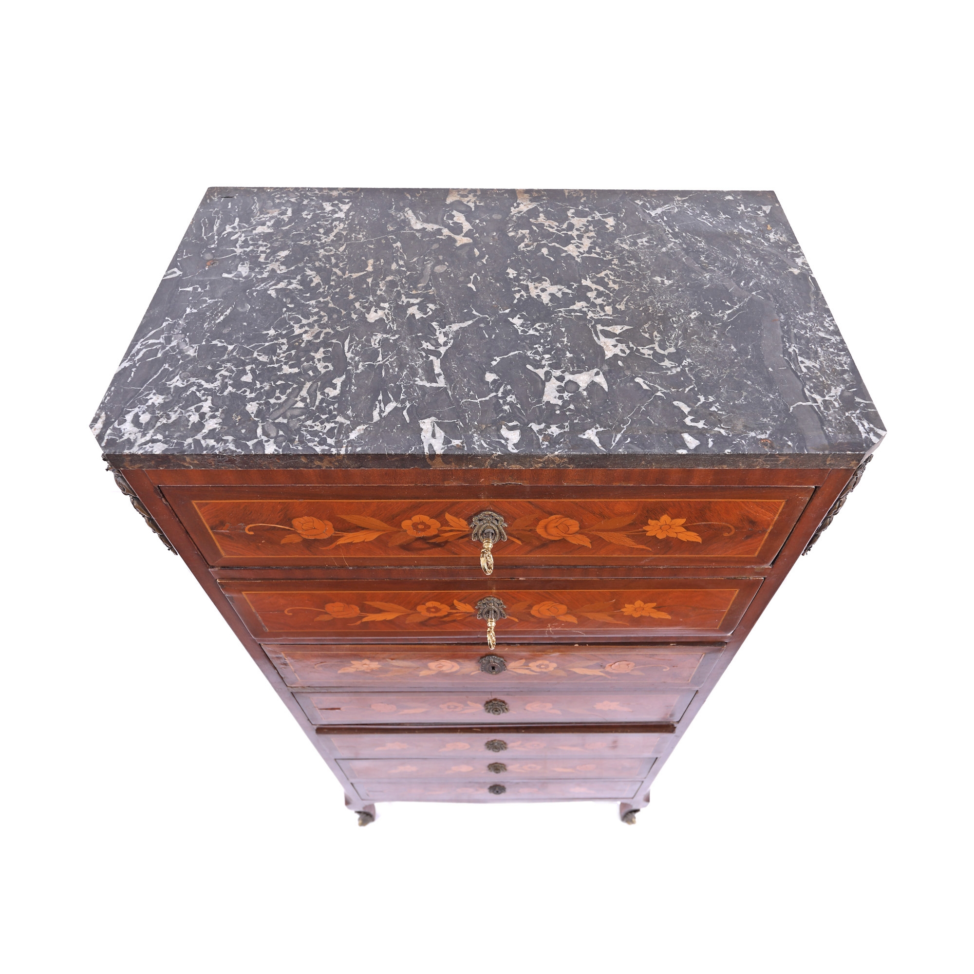 127. Comodă-semainier în stil Transition, cu marchetărie florală și blat de marmură, sec. XIX, provine din colecția familiei prezentatorului Emanuel Isopescu