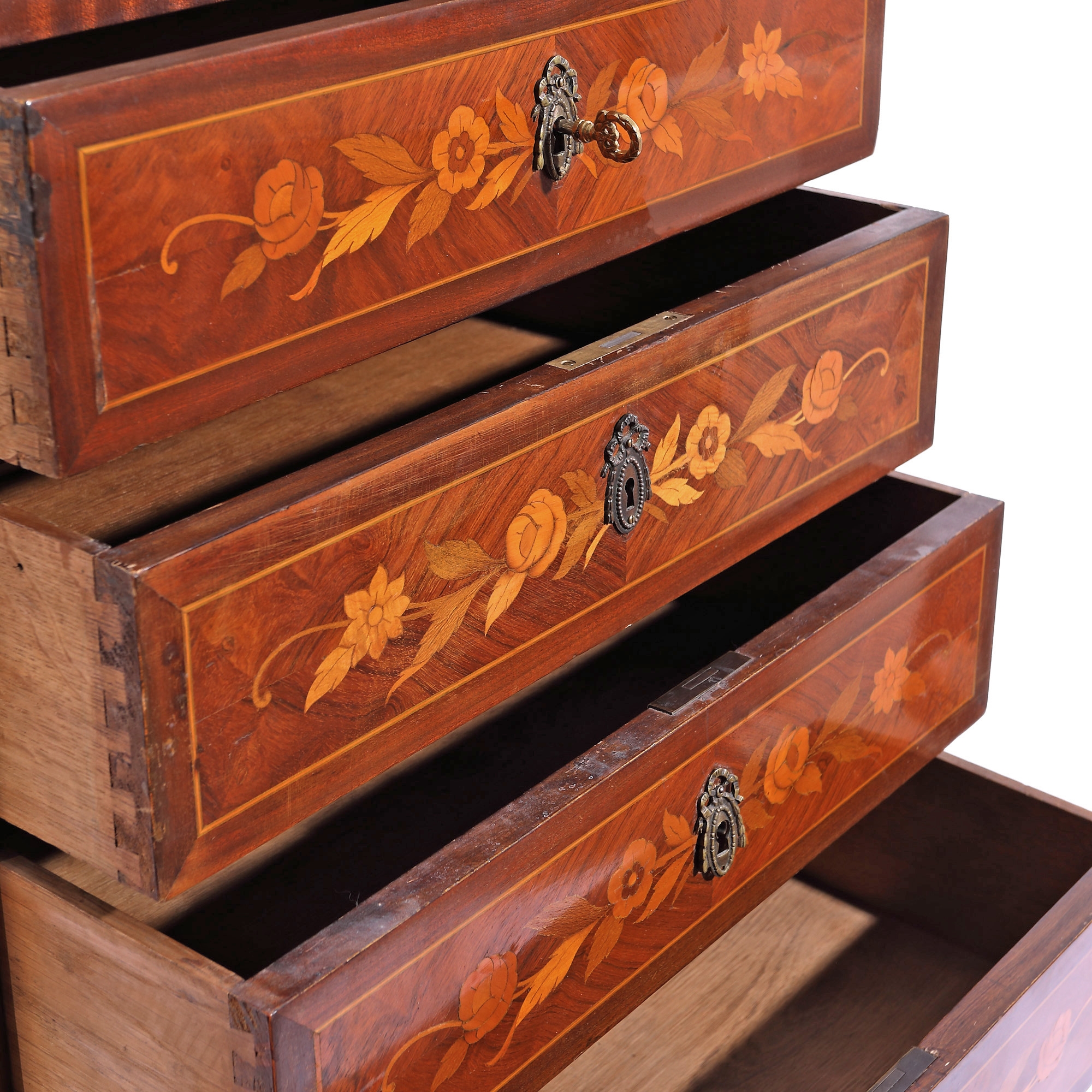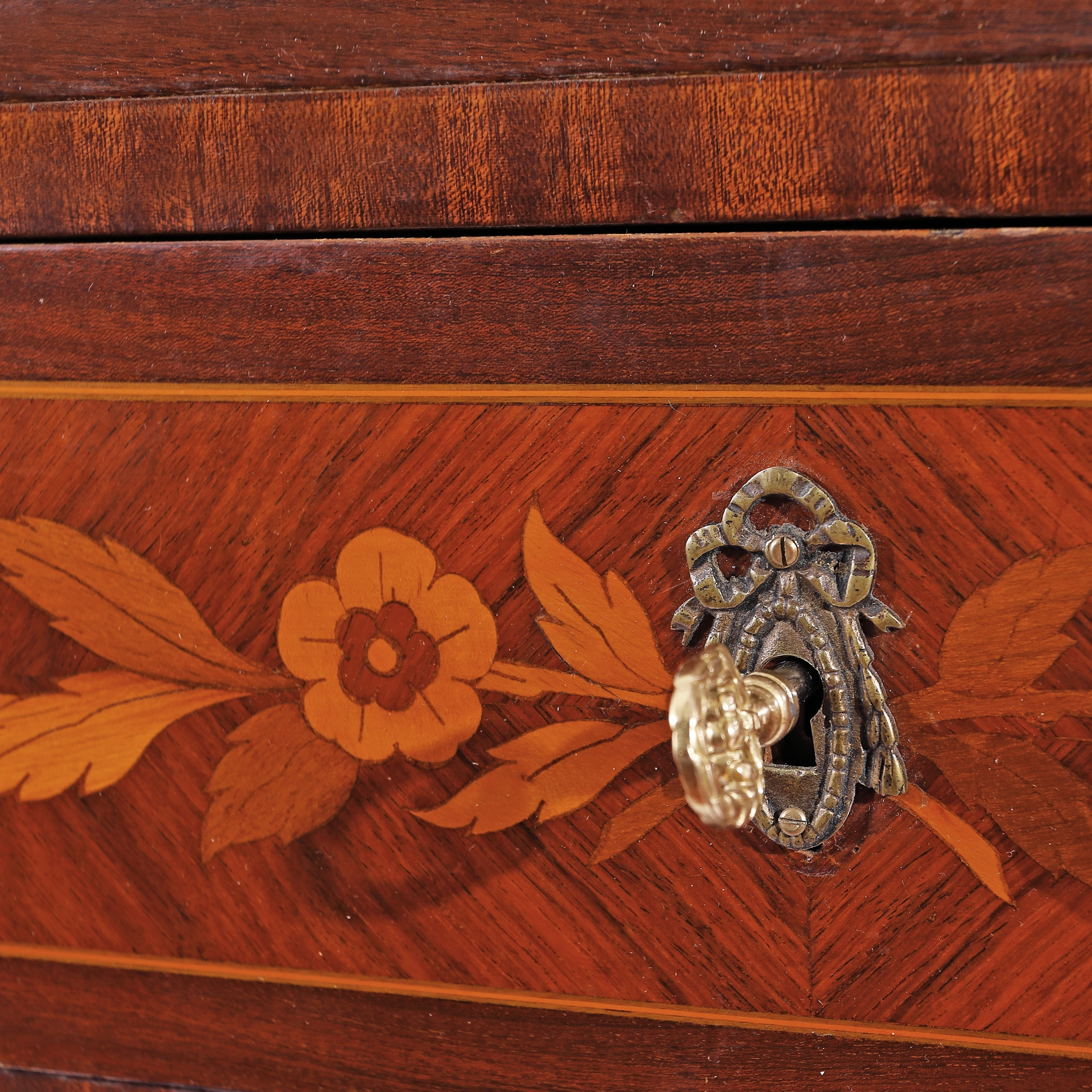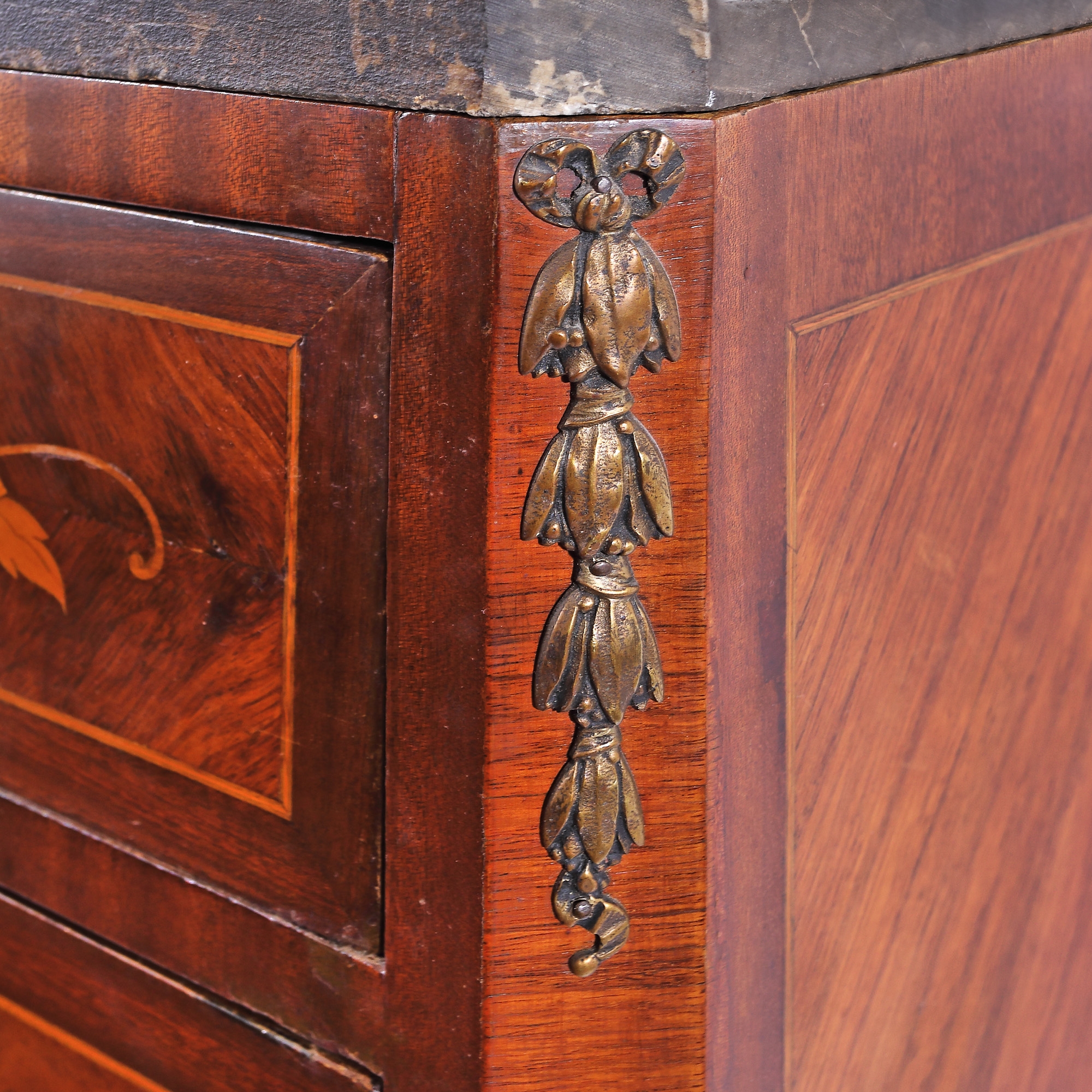 127. Comodă-semainier în stil Transition, cu marchetărie florală și blat de marmură, sec. XIX, provine din colecția familiei prezentatorului Emanuel Isopescu