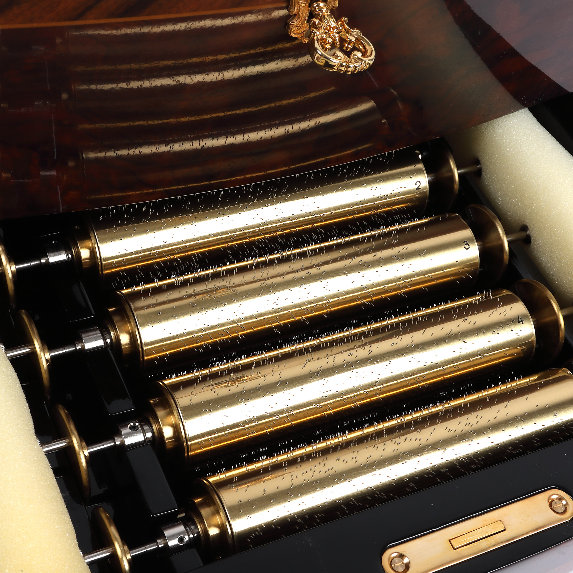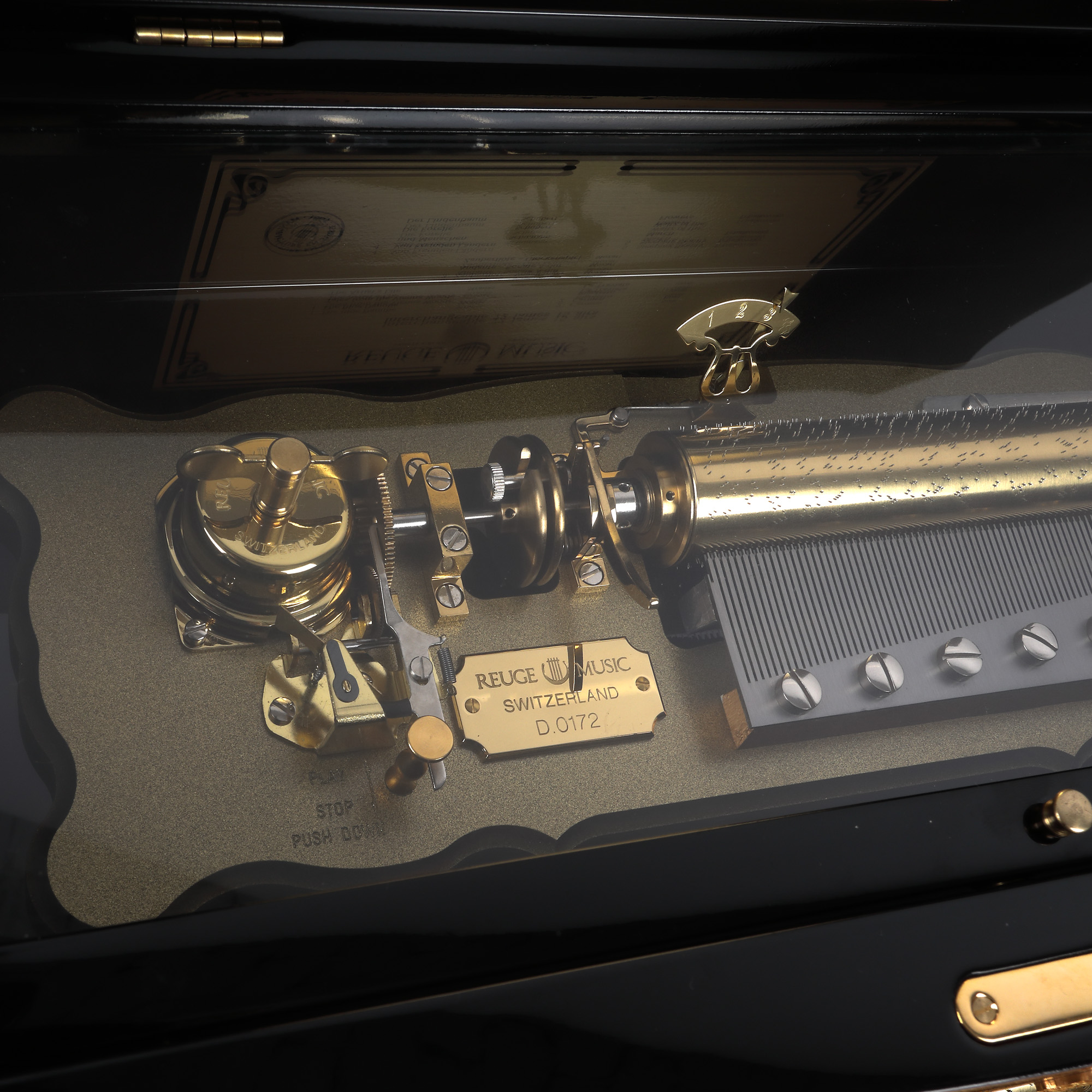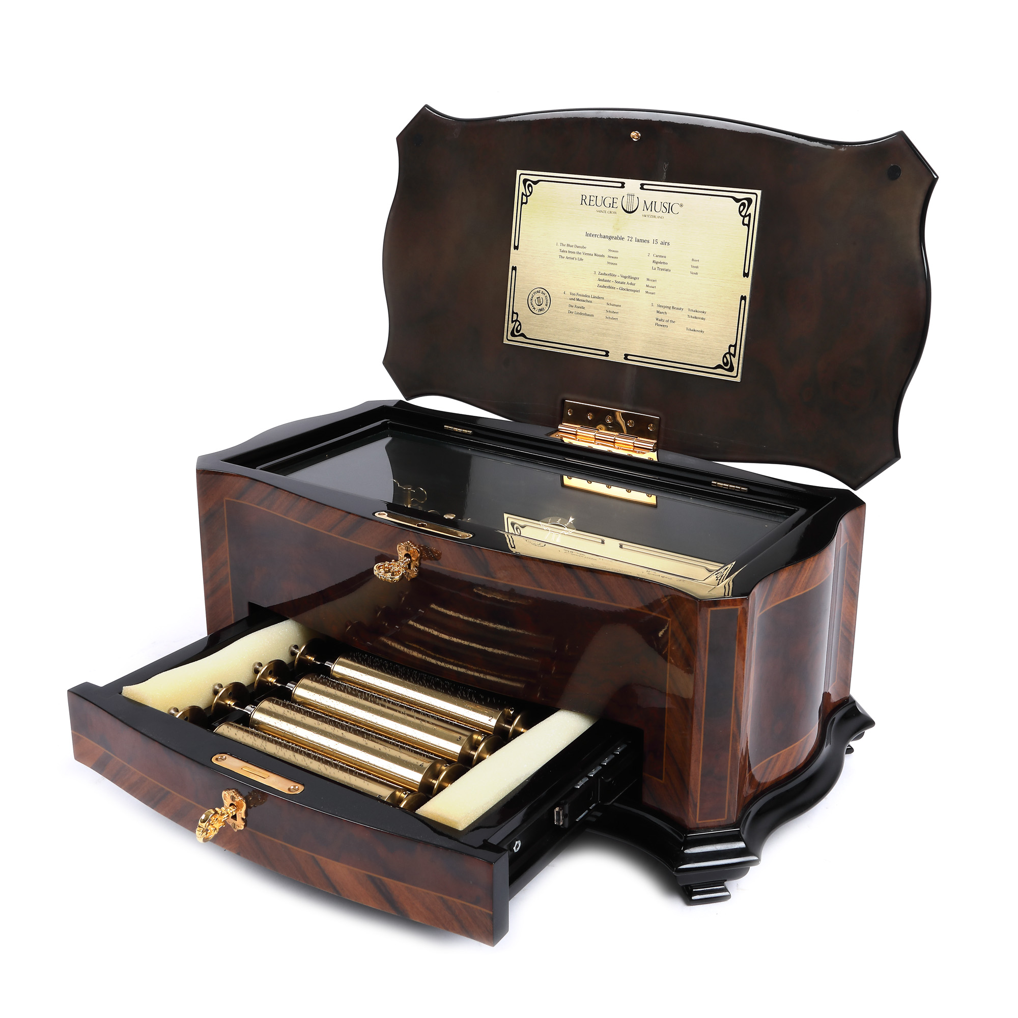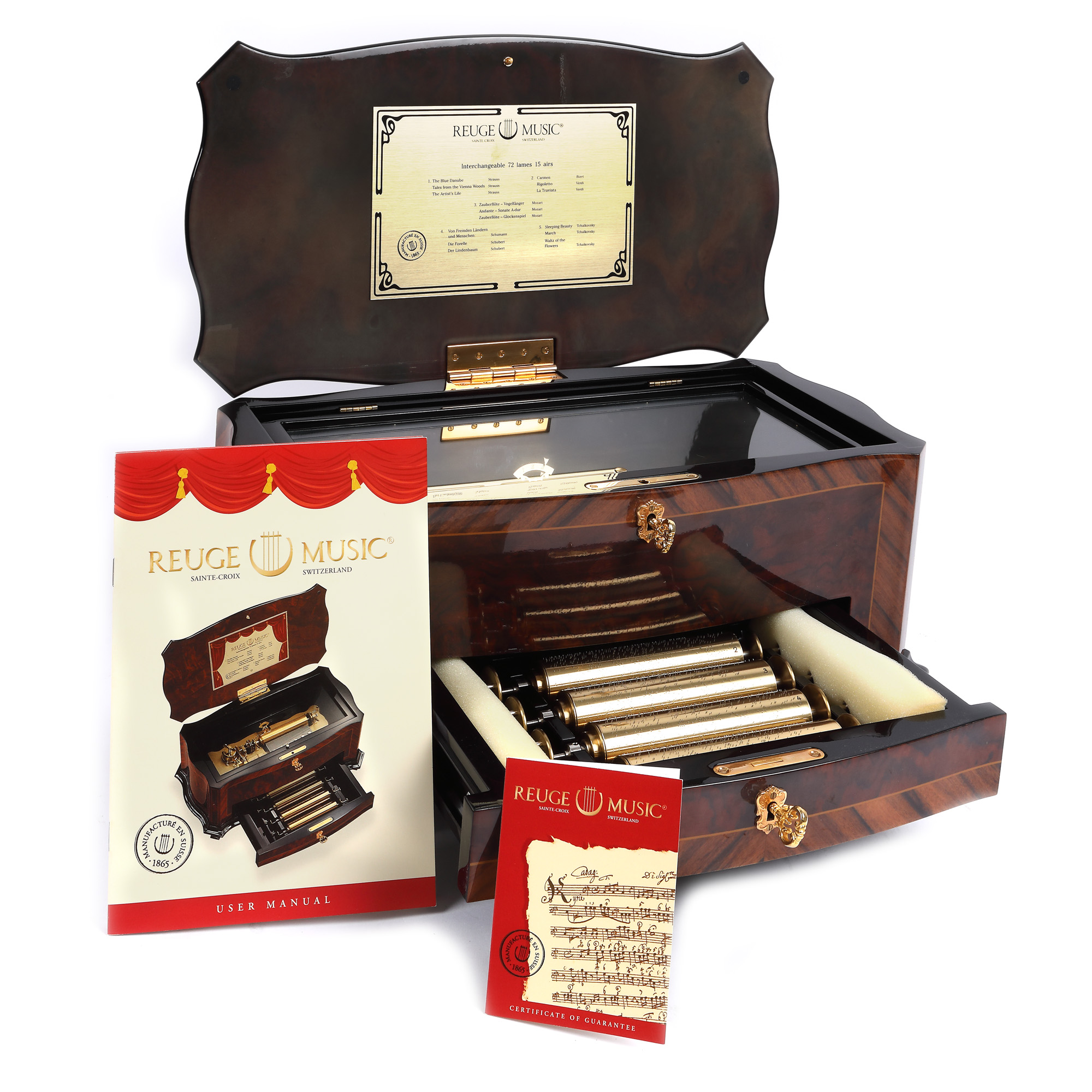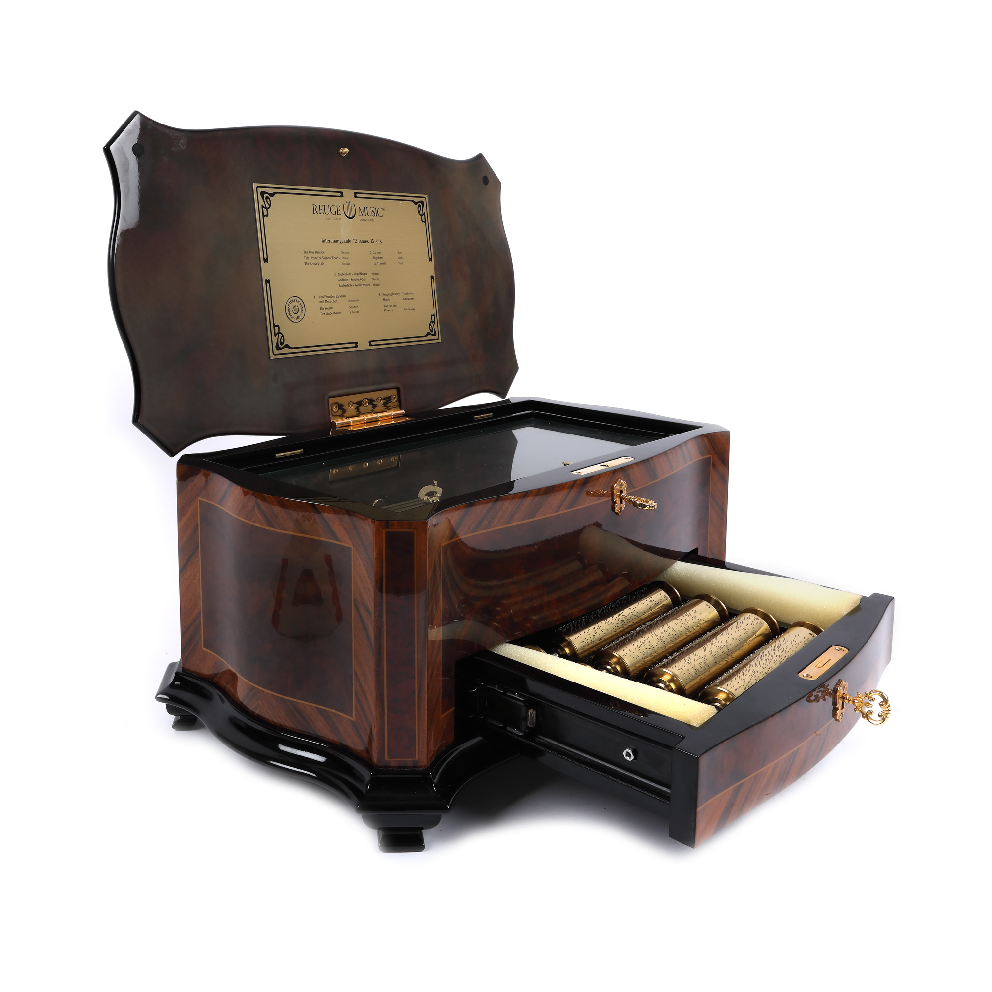 131. Elegantă cutie muzicală Reuge Music, din lemn de ulm, ce redă 15 melodii clasice, însoțită de acte de proveniență [2000]