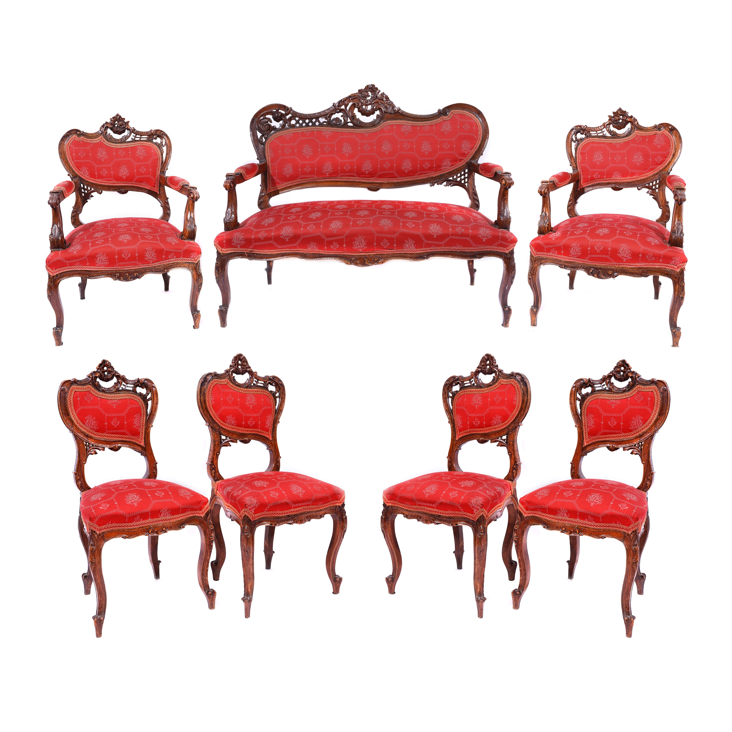 115. Garnitură de salon în stil Rococo, formată din canapea, două fotolii și patru scaune, sfârșitul sec. XIX