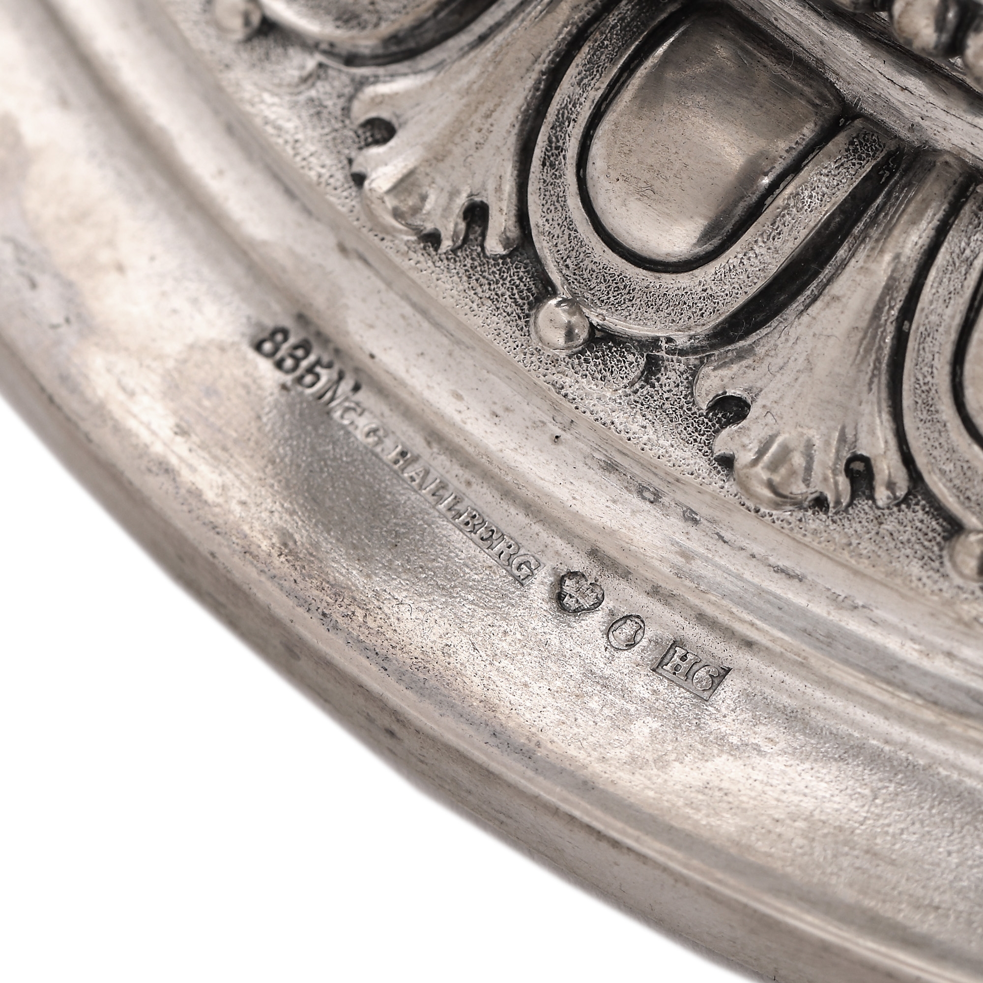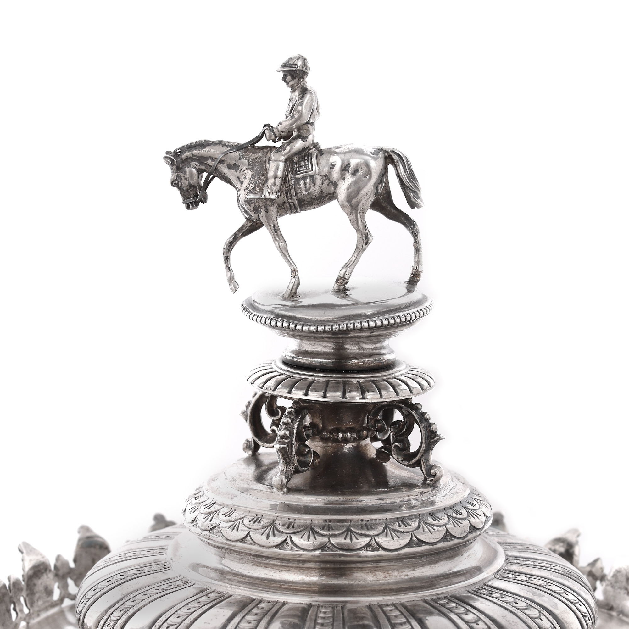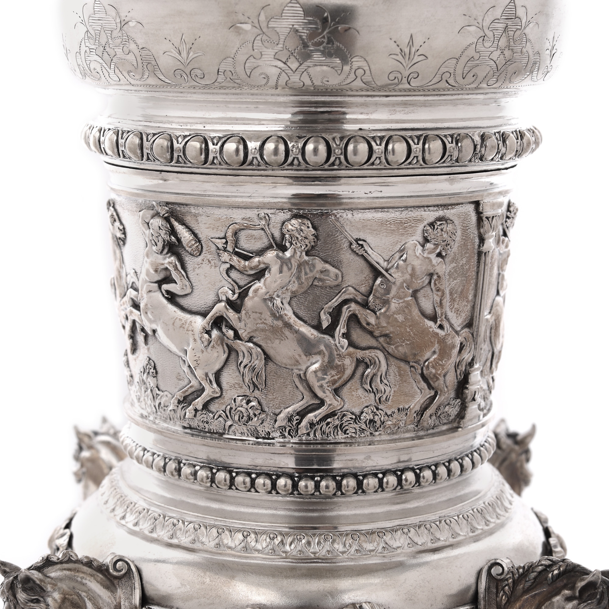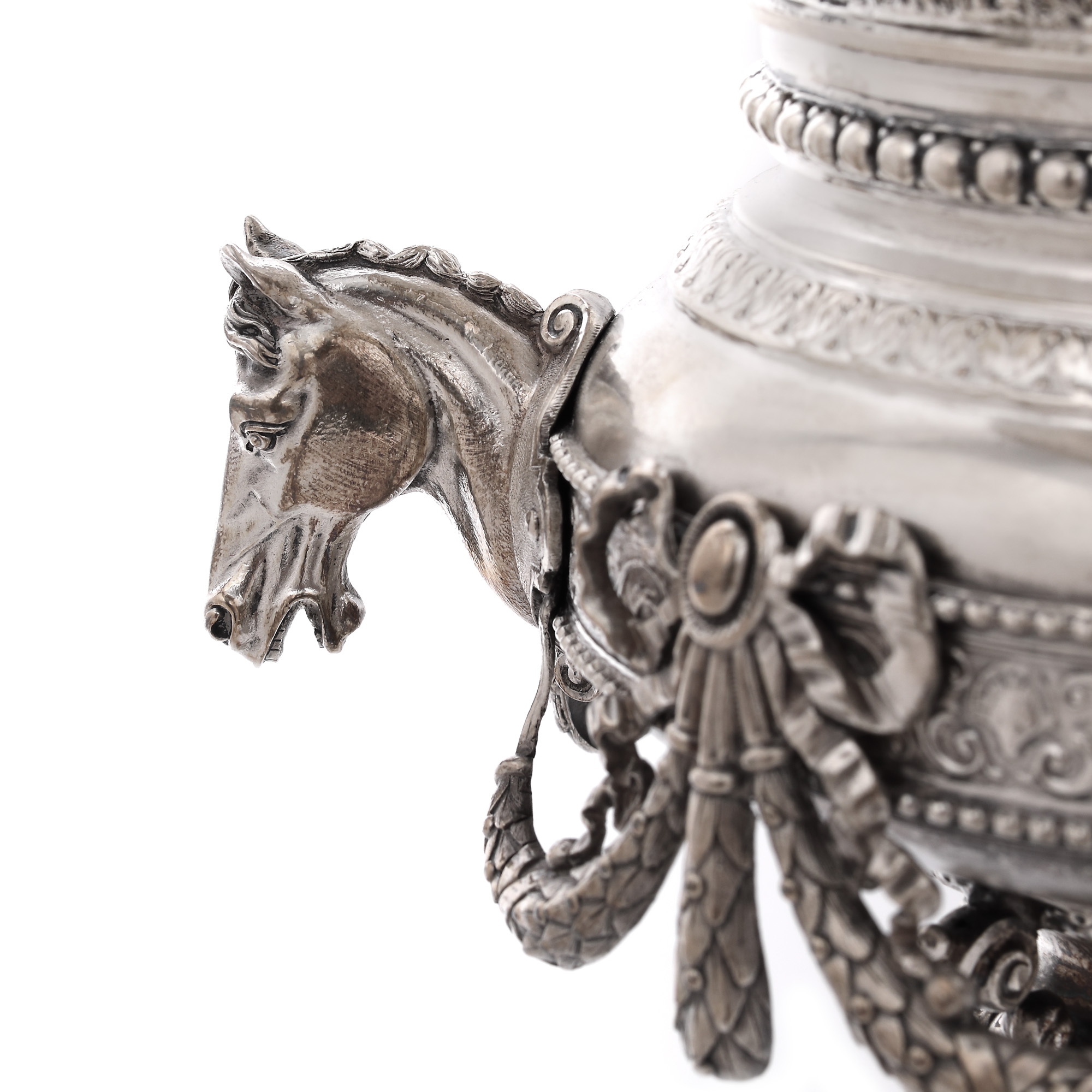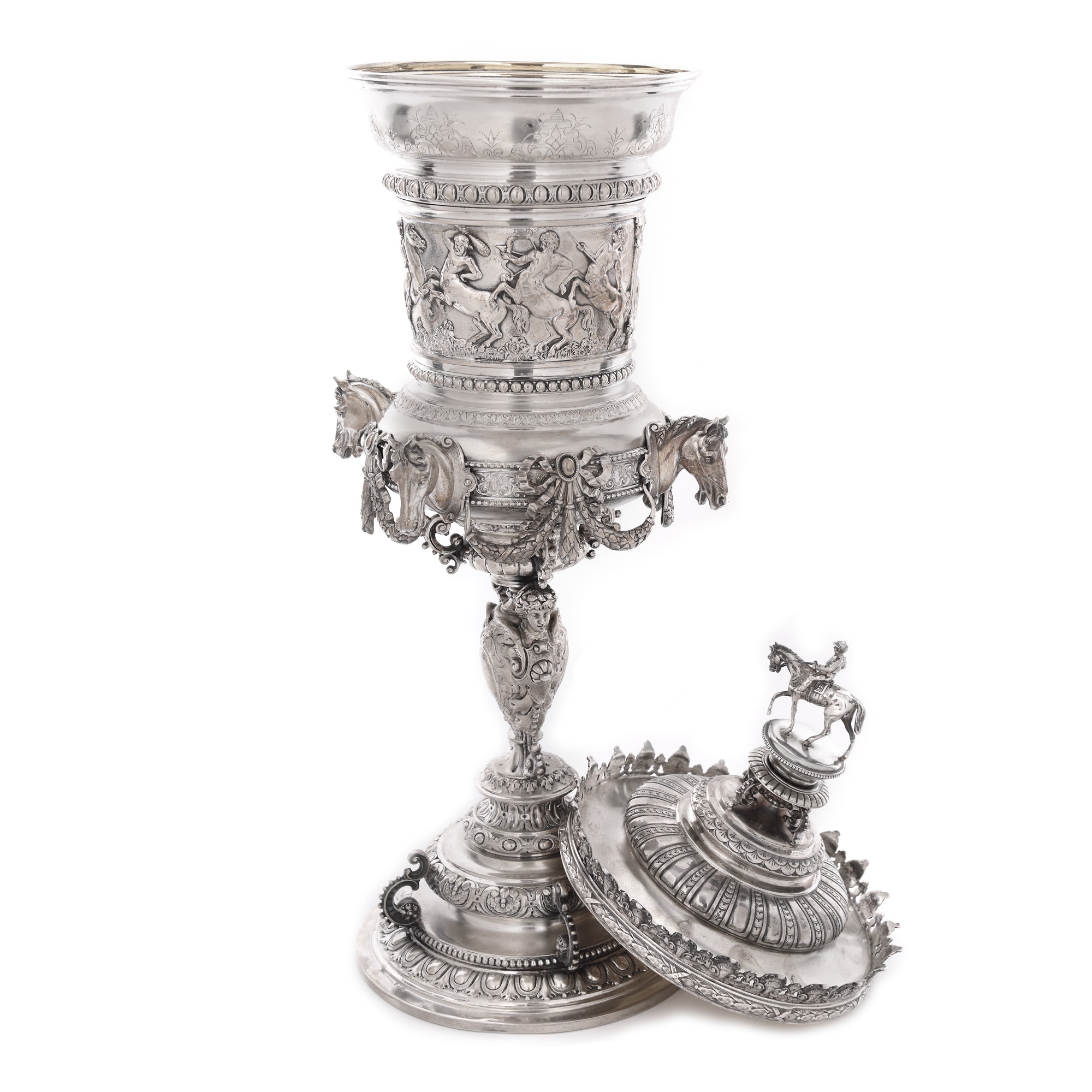 77. Impresionantă cupă din argint Carl Gustav Hallberg, de inspirație Neo-Clasică, decorată cu scene de luptă, ghirlande de lauri și motive hipice, 1886