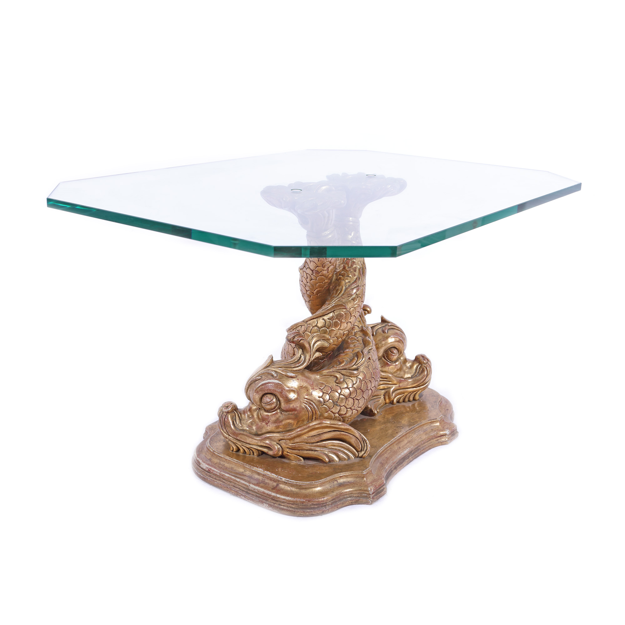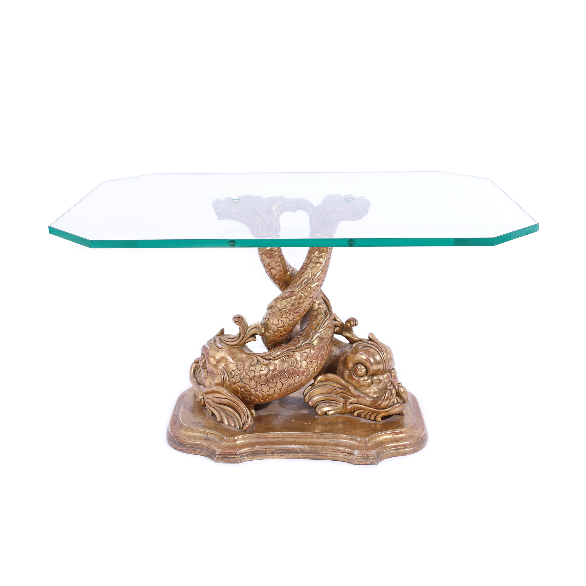 80. Masă de cafea în stil Hollywood Regency, cu blat din cristal, decorată cu pești koi stilizați [Cca. 1970-1980]