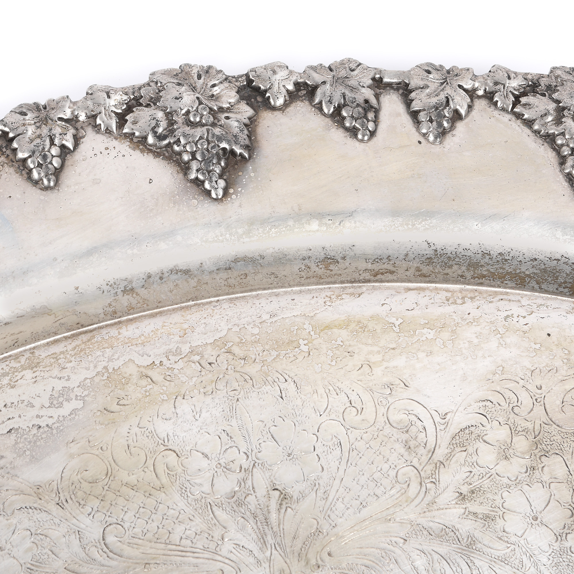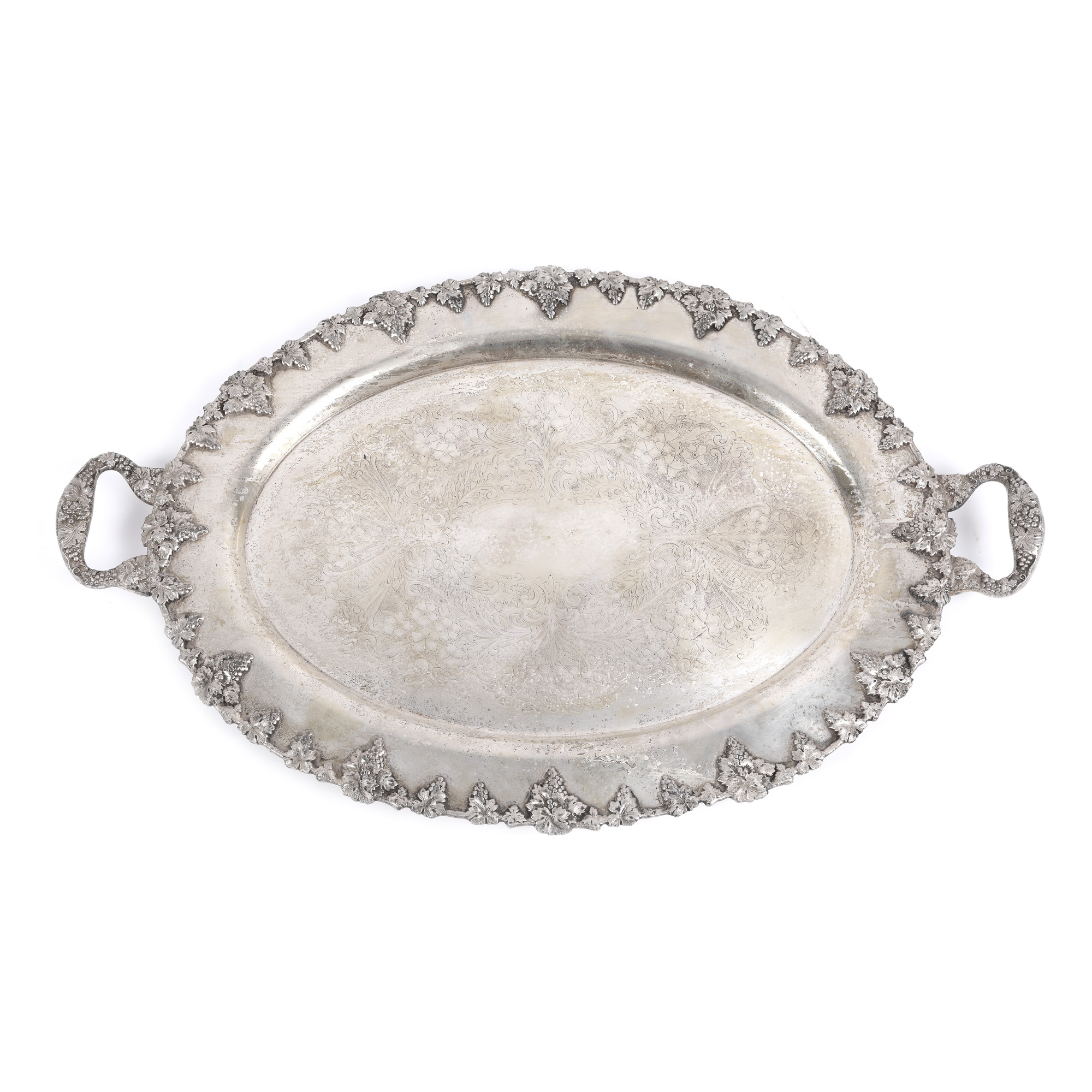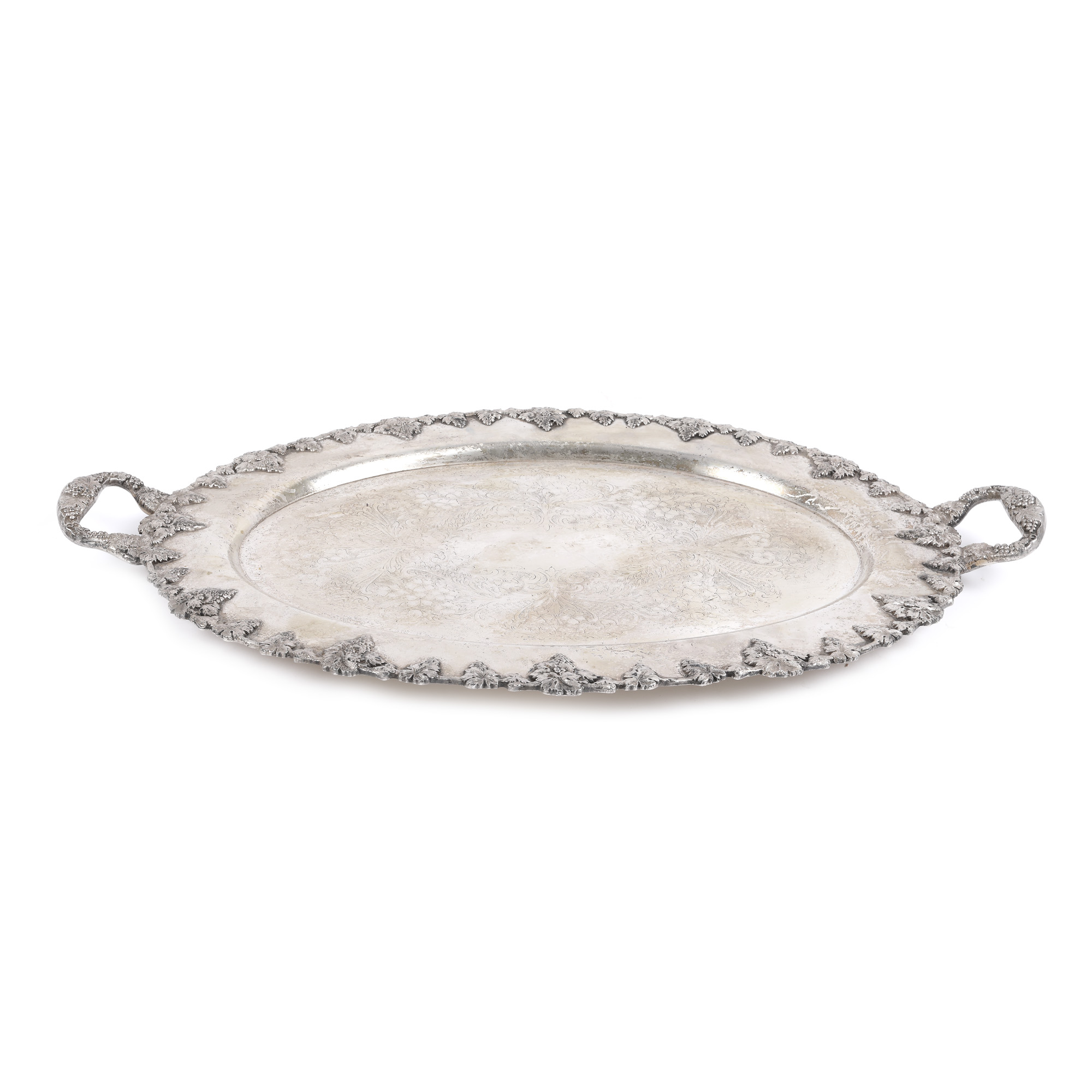 168. Monumentală tavă argintată, decorată cu viță-de-vie, struguri și flori, provine din colecția Marinei Dimitropoulos