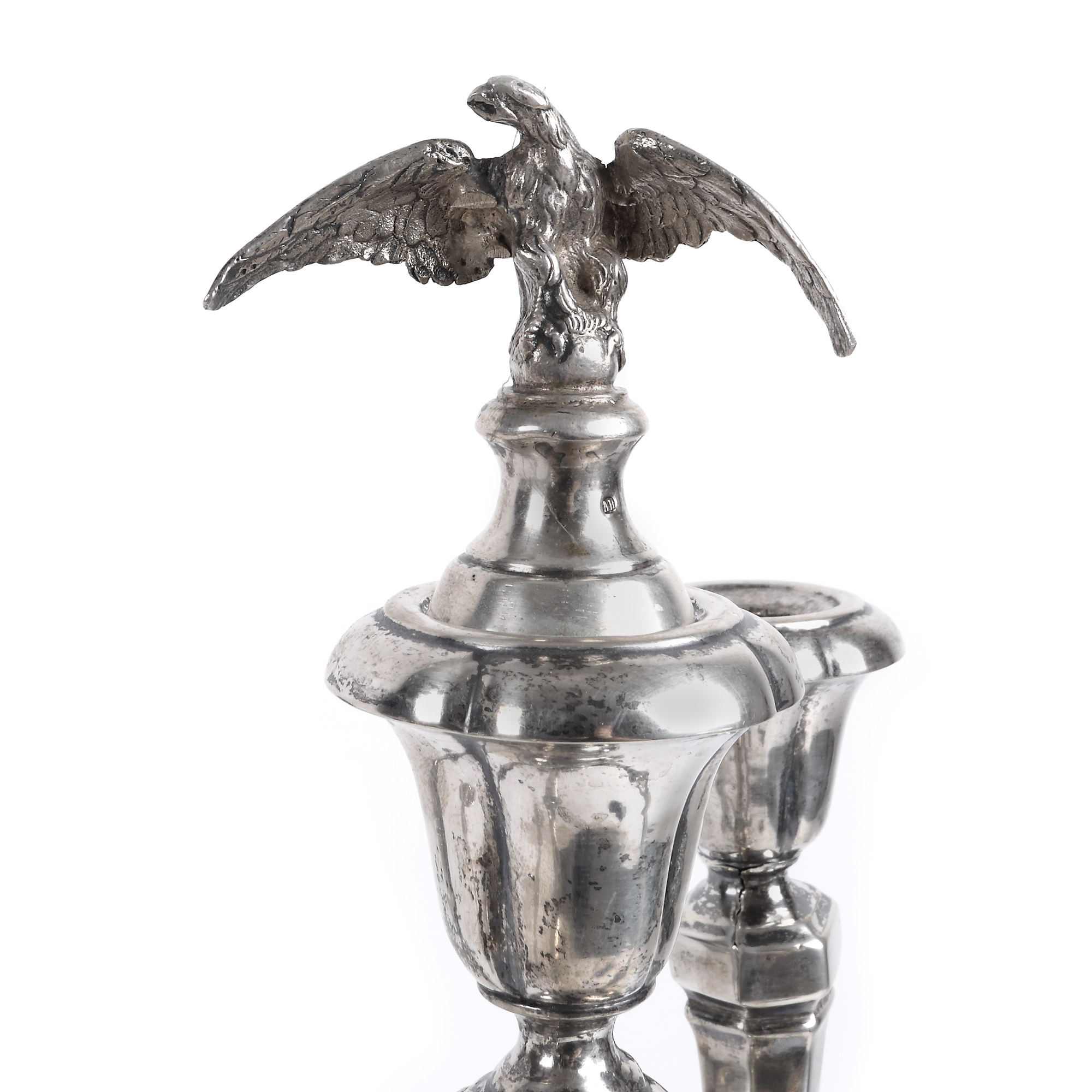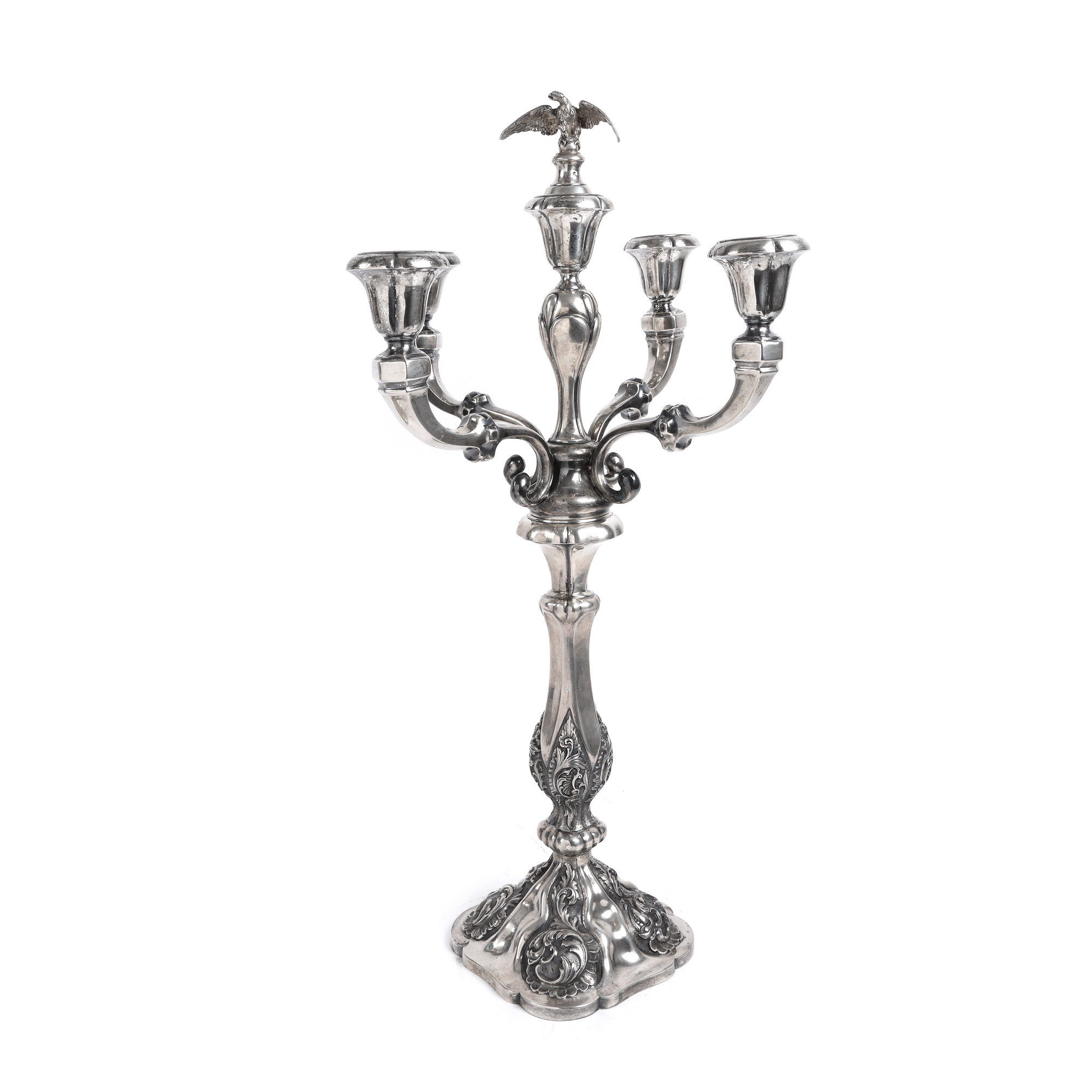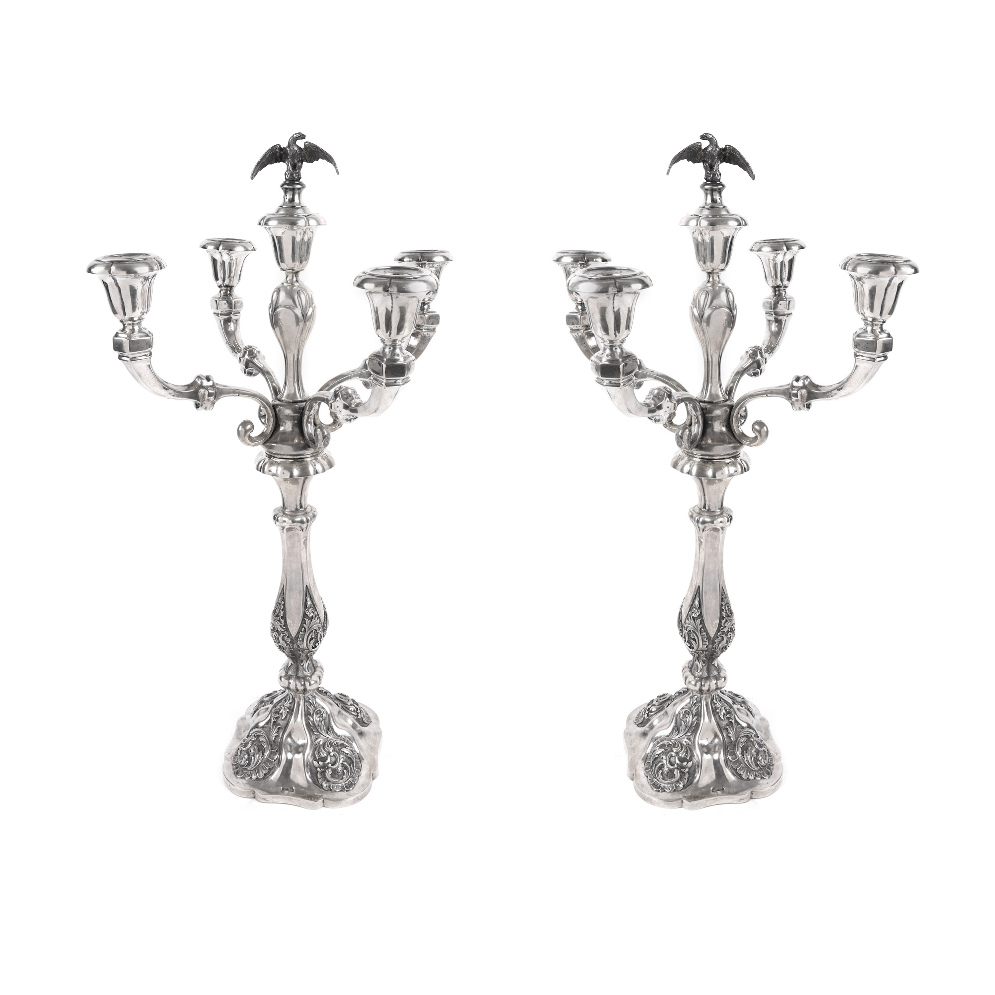 138. Pereche de sfeșnice din argint, cu brațe demontabile, ornată cu acvilă și vrejuri vegetale stilizate, 1863