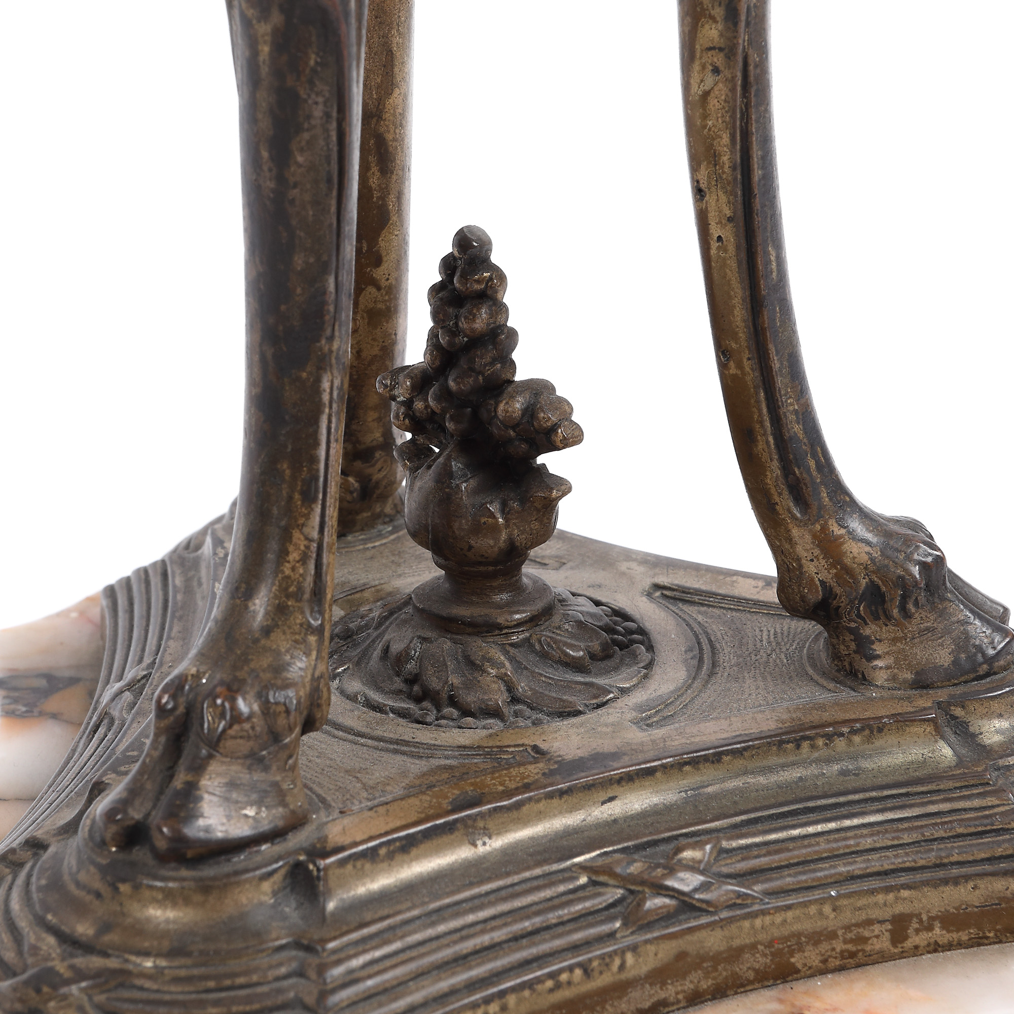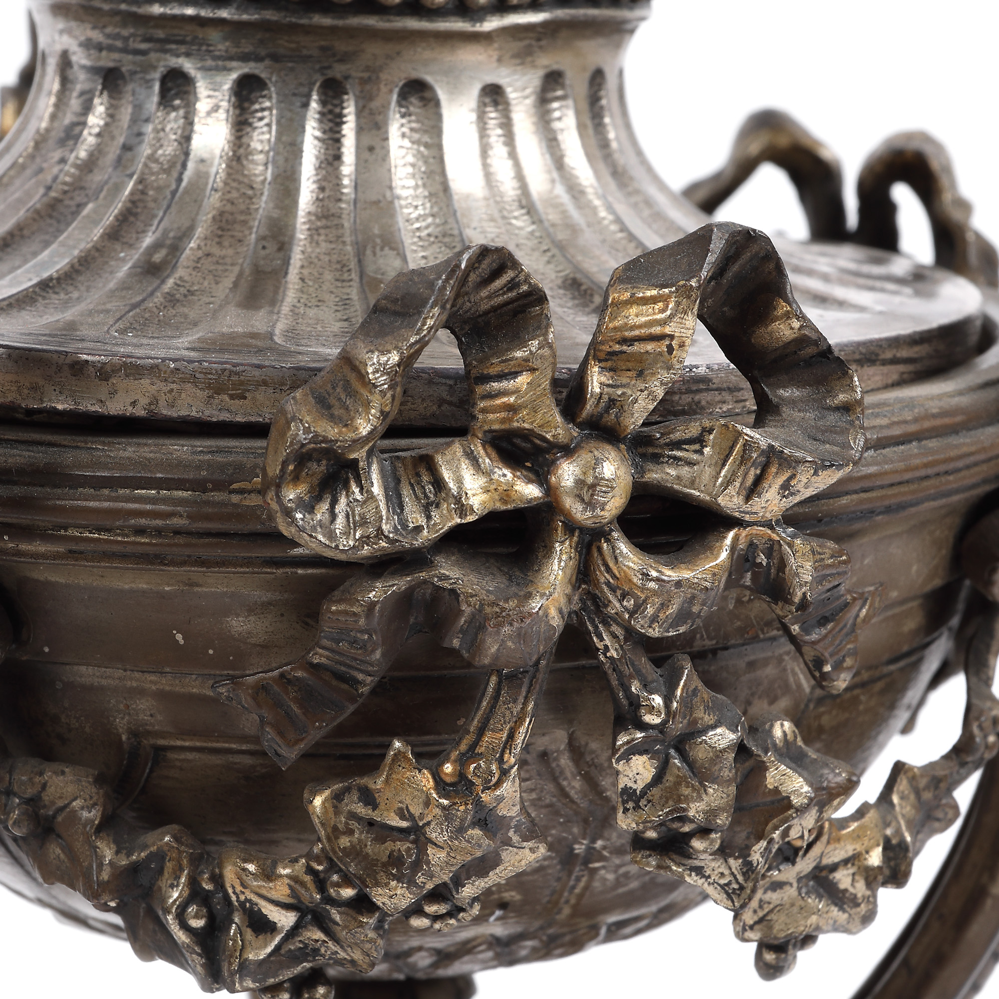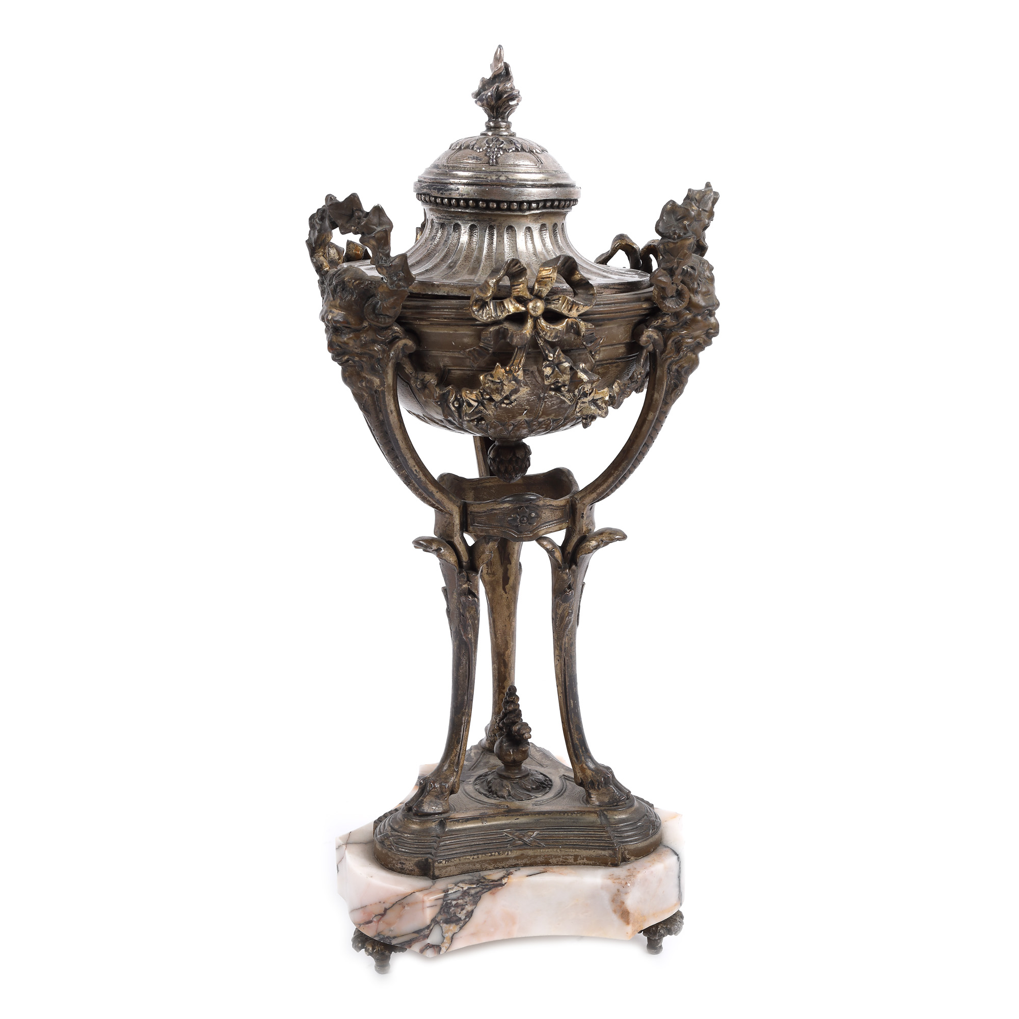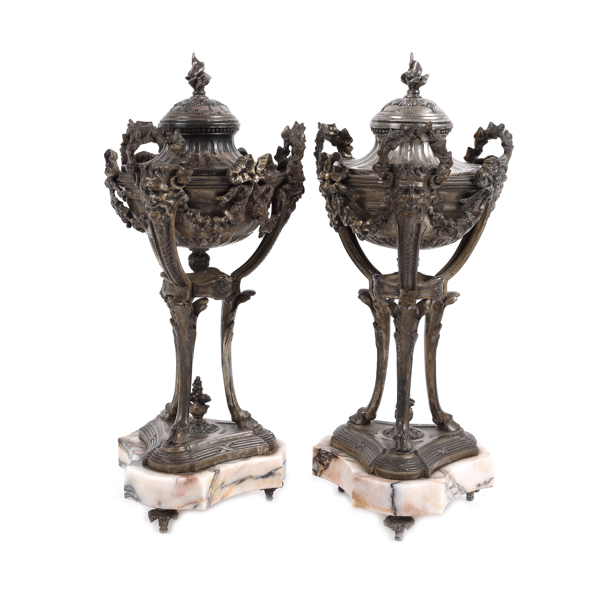 76. Pereche de urne decorative în manieră Neo-Clasică, decorată cu chipuri de satiri și ghirlande de flori, cu soclu din marmură, sfârșitul sec. XIX