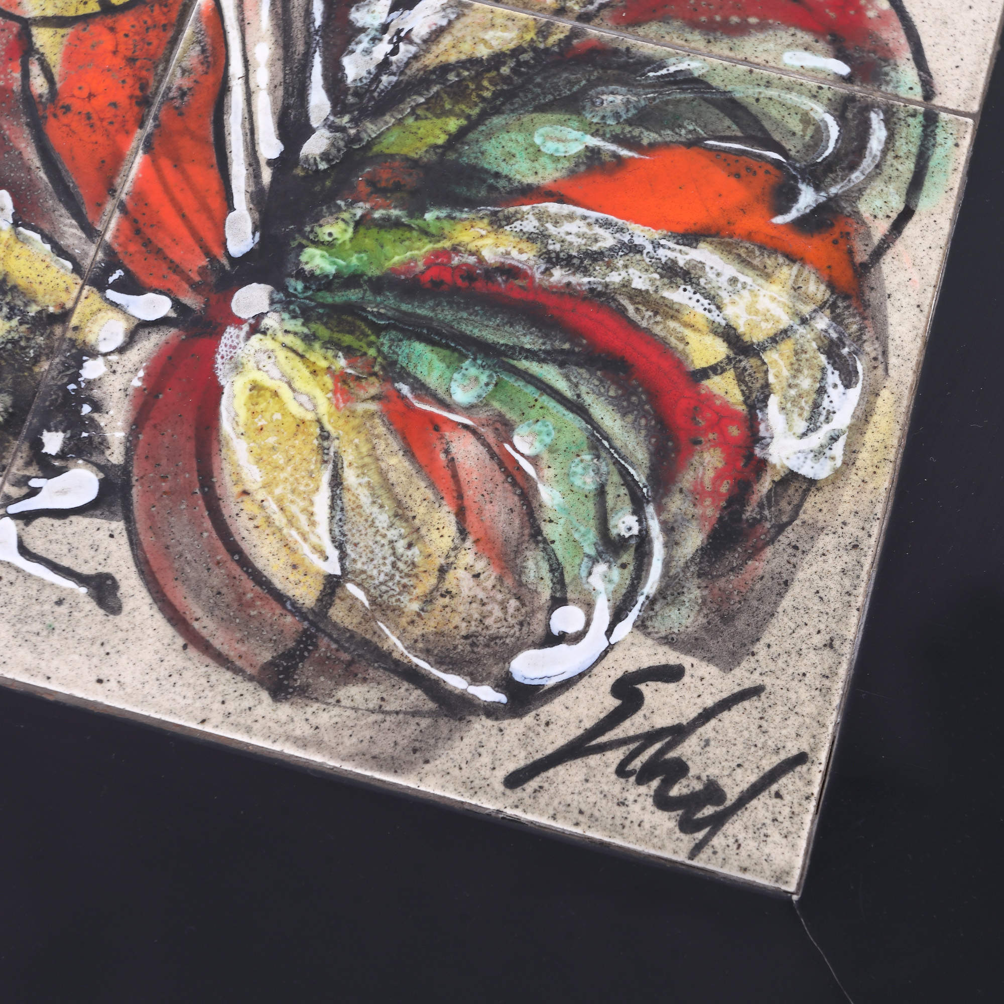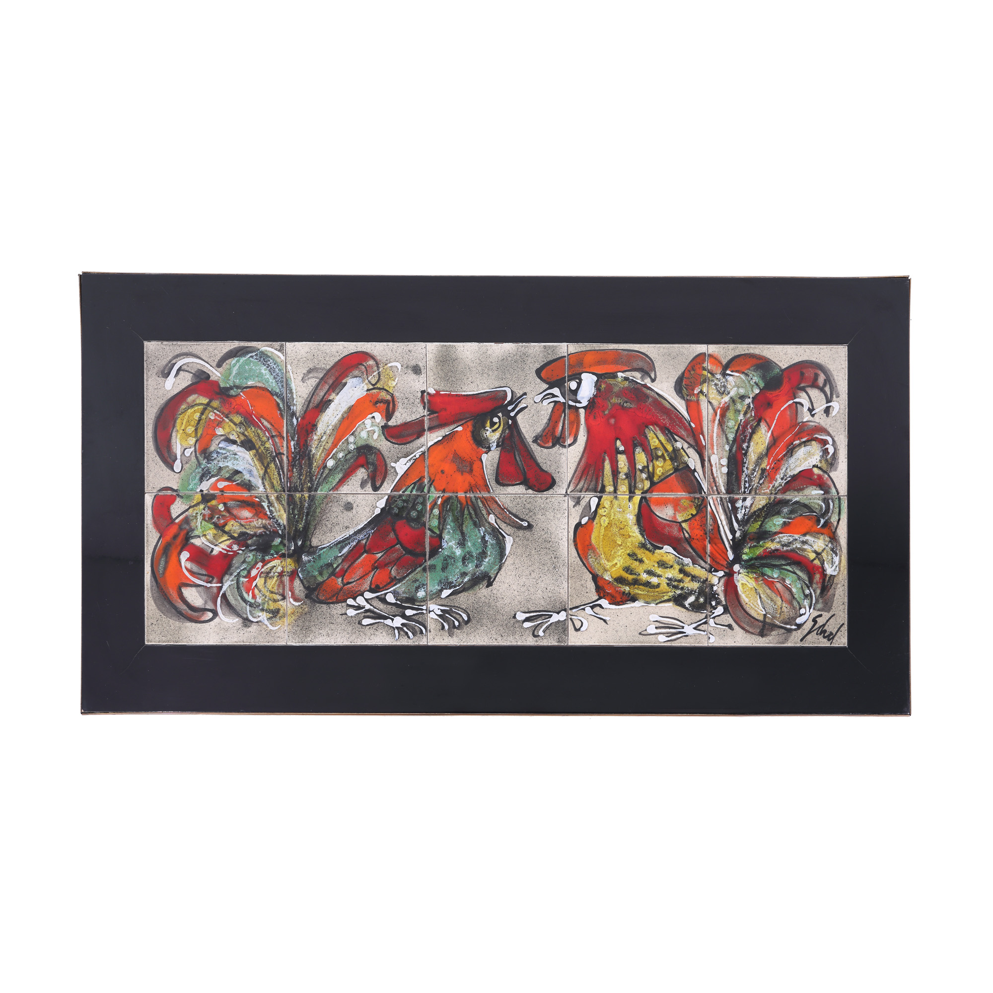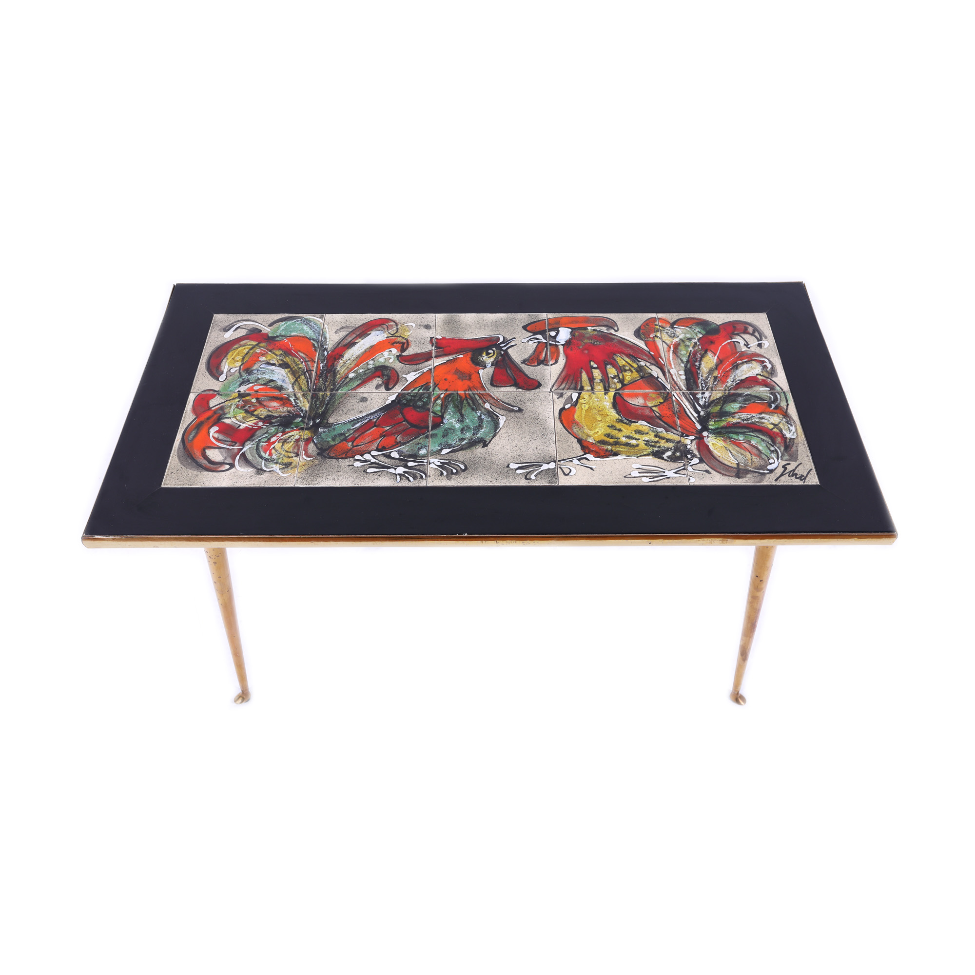 143. Rară masă Mid-Century Modern, cu blat din ceramică pictată cu cocoși în luptă [Cca. 1950]