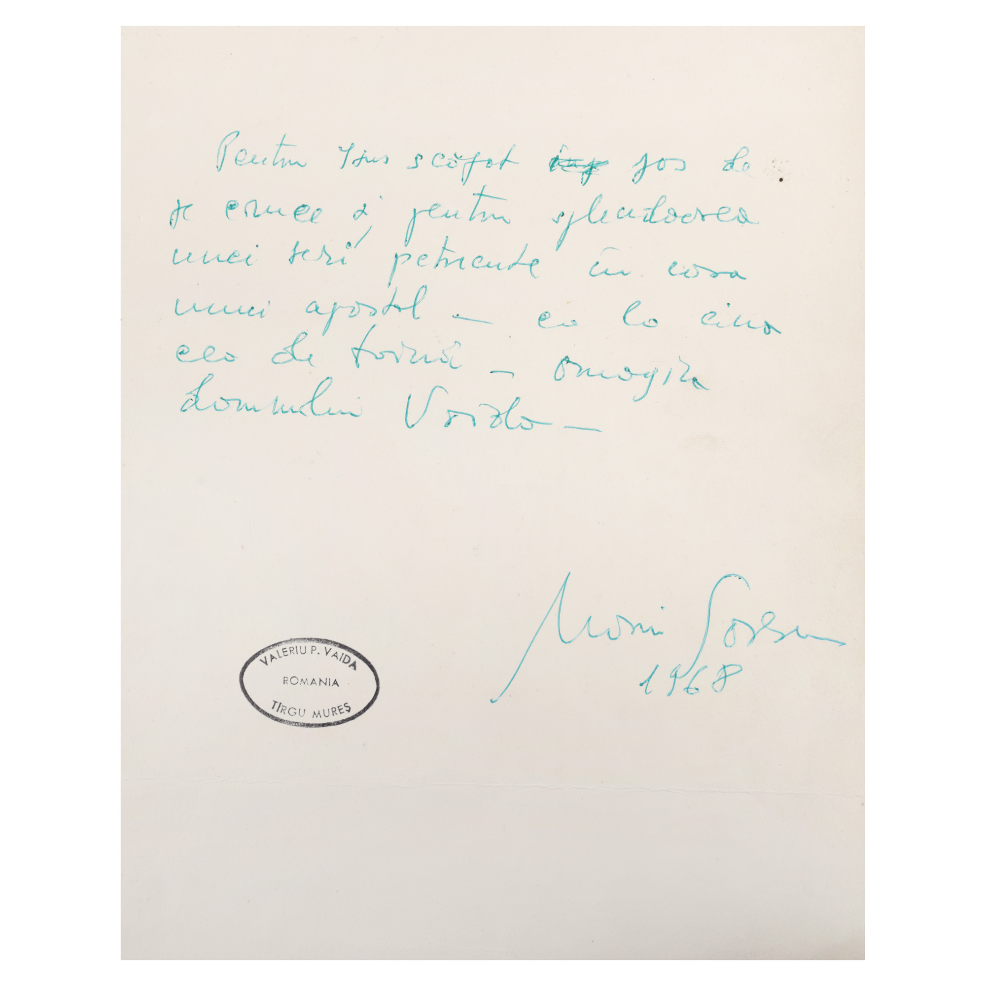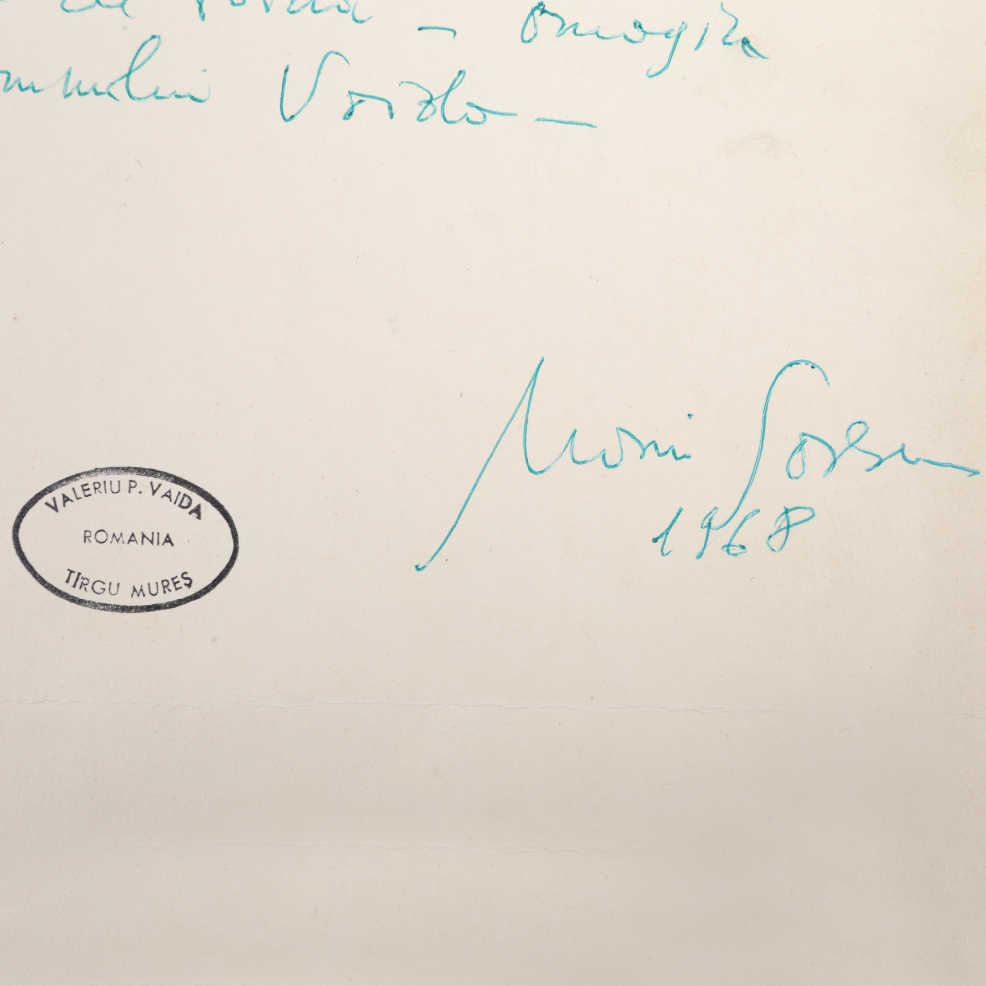 94. Amplă dedicație olografă a scriitorului Marin Sorescu către Vasile Vaida, 1968, cu ex-libris