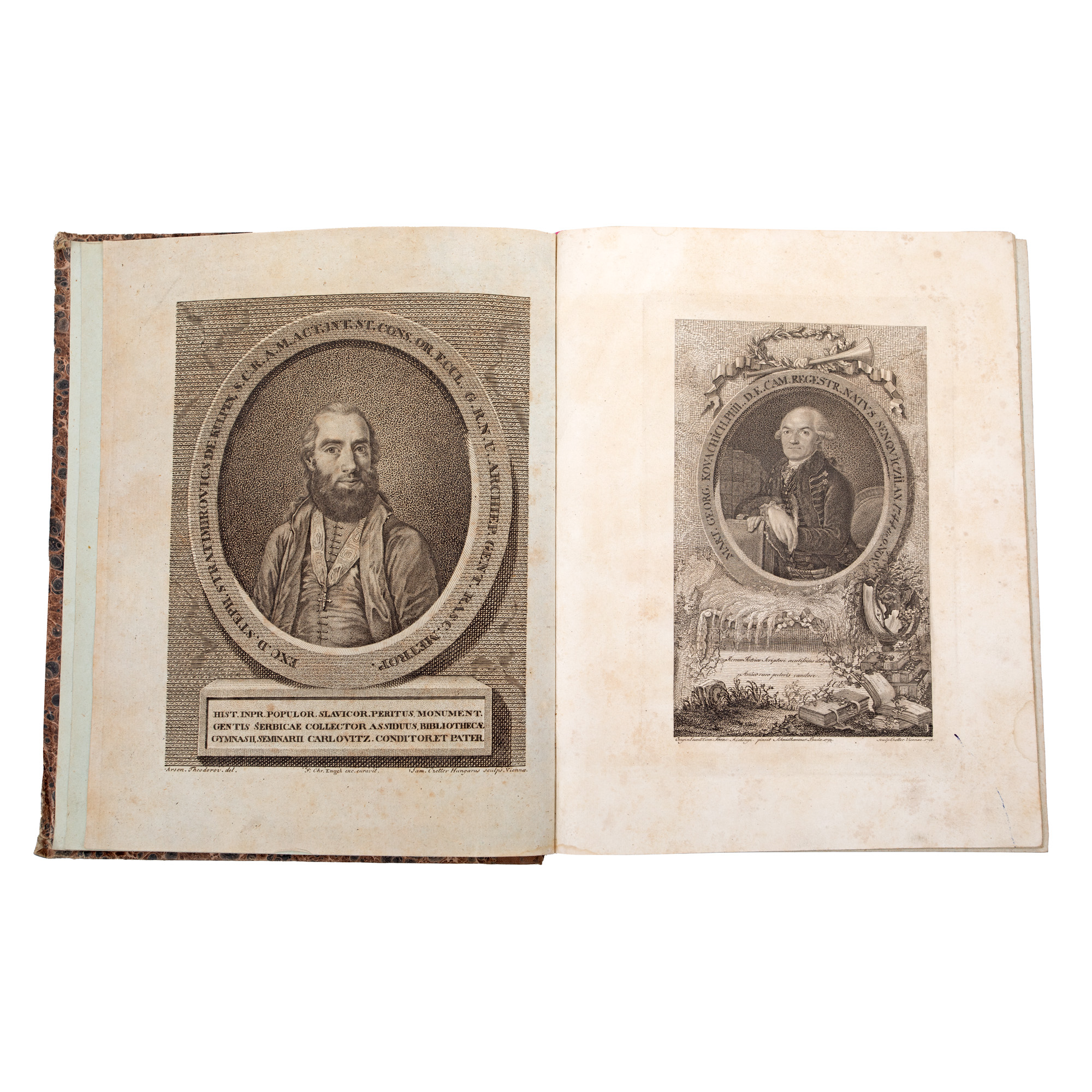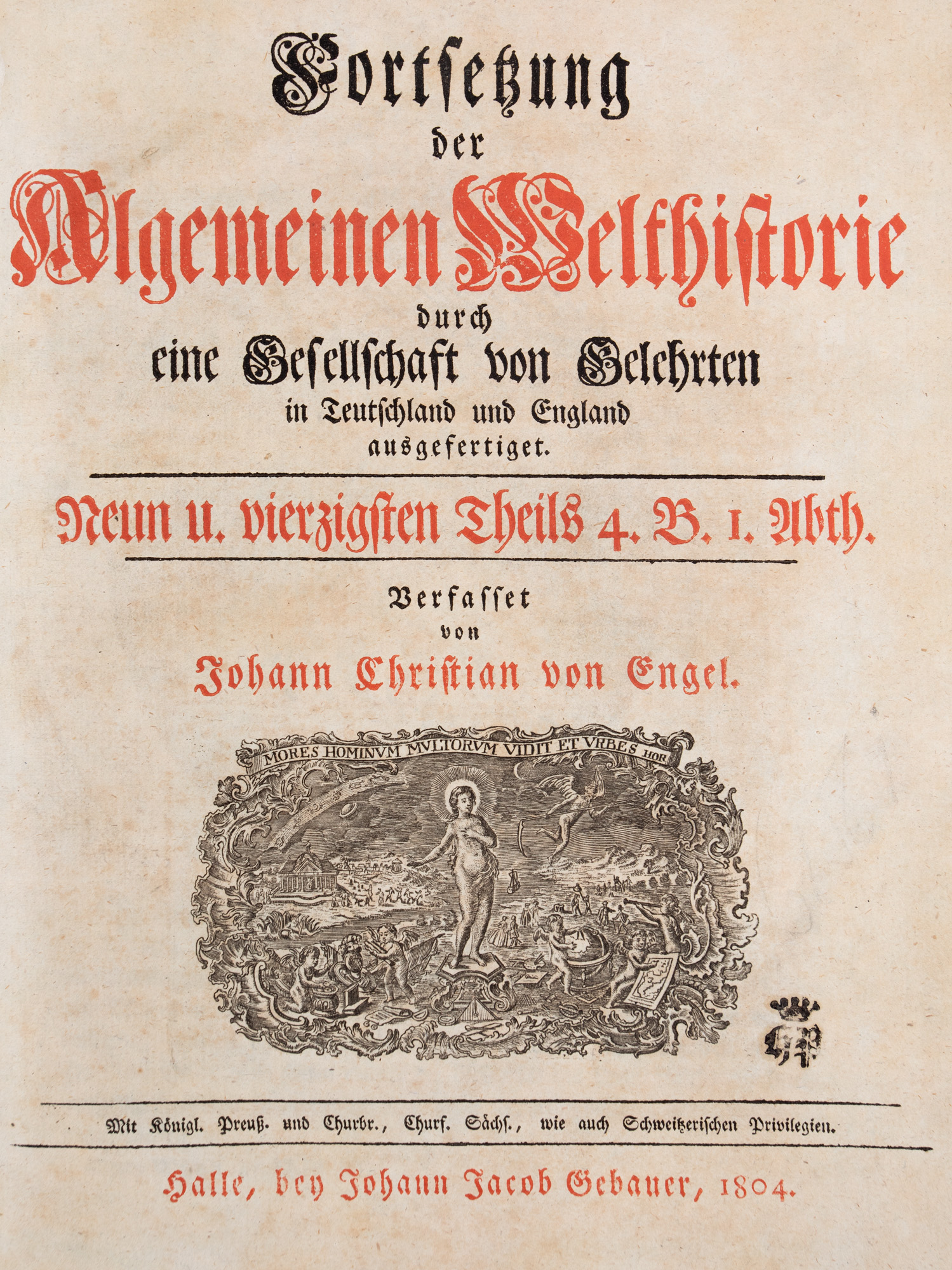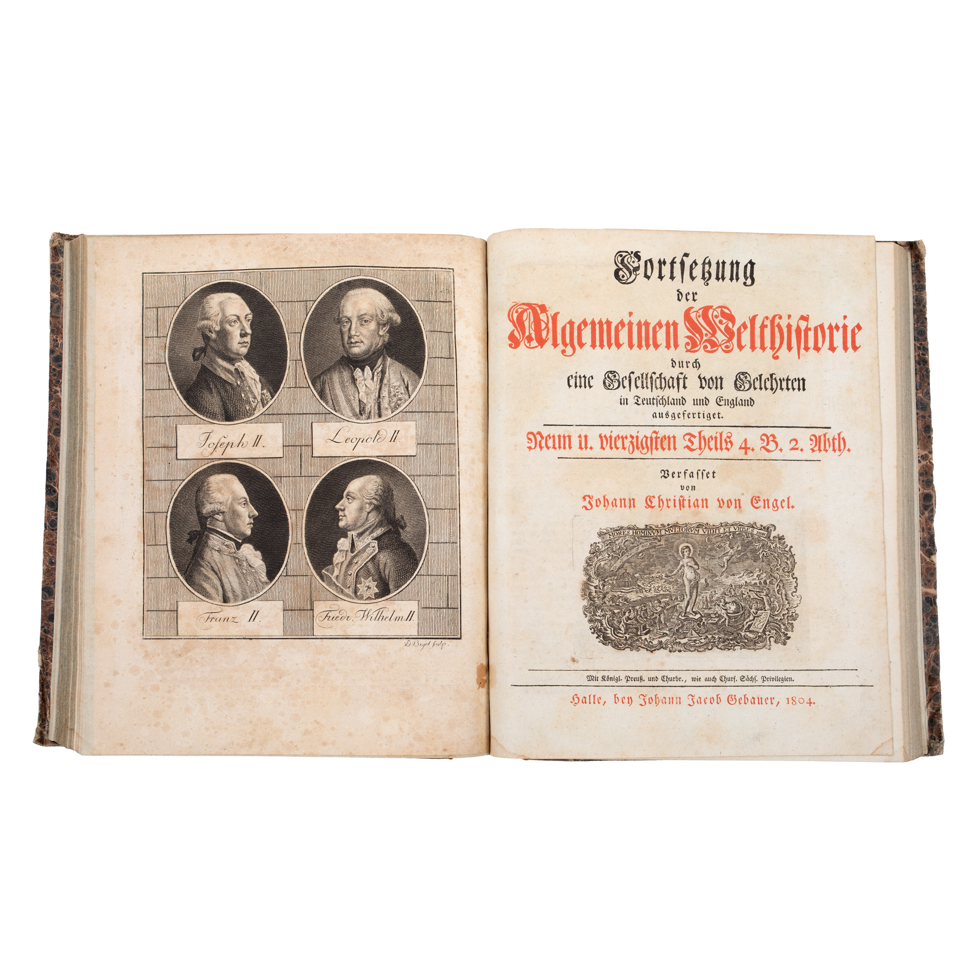 Exemplarul este complet. Primul volum are VIII + 382 pagini, iar al doilea volum: (1) filă + 362 pagini. Legătura ambelor volume este uniformă, fiind lucrată din tăblii de carton învelite în hârtie marmorată, iar cotorul din pânză, cu titlul: „Engel Allgemeine Welthistorie“. La începutul primului volum se află două gravuri, realizate la Viena, de San. Czetter Hungarus și Oretter, în anul 1798. În fruntea prefeței a fost plasată o ilustrație cu portretul lui Vlad Țepeș. La începutul părții a doua se află de asemenea o gravură, cu portetele Lui Iosif II, Leopold II, Franz II și Wilhelm II. Cuprins: Johan Christian Engel, funcționar la cancelaria aulică din Viena, istoric, autor al mai multor scrieri privind istoria universală, cu deosebire a Europei. Alături de Sulzer, Macai, și Endel, J.Ch. Engel este considerat precursor al teoriei lui Roessler, concept conform căruia poporul și limba română s-ar fi format la sud de Dunăre, iar spațiul nord-dunărean ar fi devenit o „terra deserta“, un teritoriu rămas nelocuit, numai bun să fie ocupat de triburile barbare maghiare venite din Asia. Istoricul austriac a expus aceste idei in lucrarea sa Fortsezung der allgemeinen Welthistoire durch eine Gessellscahft von Gelehrten in Deutschland und England ausgeferigel. Scrierea de față, Geschichte der Moldau und Valachen a fost imprimată, în cadrul a două volume, în anul 1804 la Halle. Tomurile, de formatul in-4o, le alcătuiesc VIII + 382 + 362 pagini. Cartea a avut ca revizor sau cenzor pe Joseph Beresevich. În primul volum, pe baza unei biografii istorice, înfățișează date statistice referitoare la Moldova și Valahia, la originea statelor feudale românești, afirmarea lor și, evident, la luptele cu turcii. În a doua parte se referă la istoria modernă a acestor teritorii până în vremea sa, la viața materială și culturală a locuitorilor. În prezent cele două volume nu păstrează însemnări de proprietate ori de cititor. Doar pe foaia de titlu se află aplicată o pecete cu coroană și inițialele G.P.