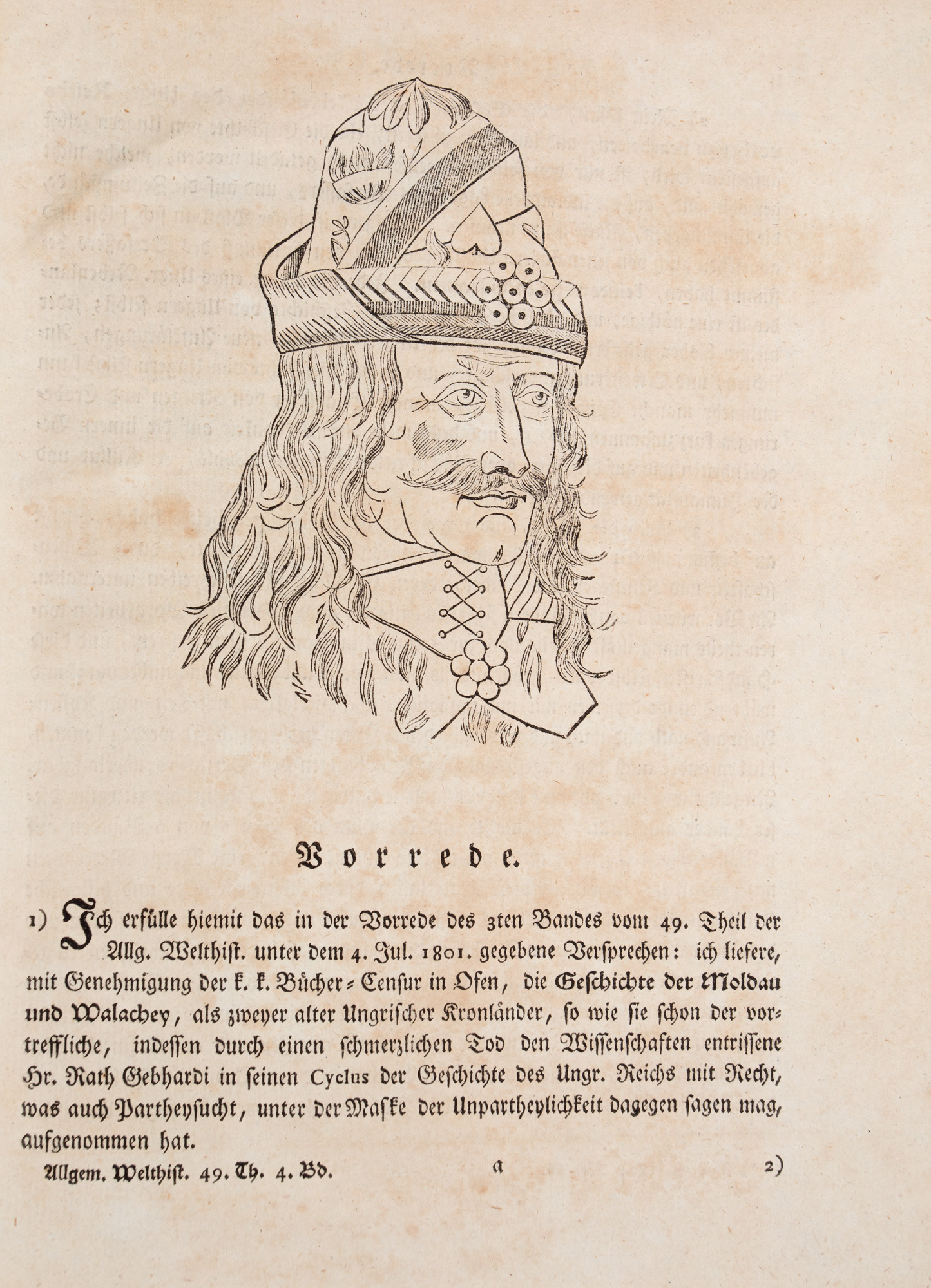79. Colegat de două volume "Continuarea istoriei generale a lumii (Fortsetzung der Algemeinen Welthistorie)", de Johann Christian Engel, germană, Halle, 1804, cu ex-libris și o gravură cu Vlad Țepeș