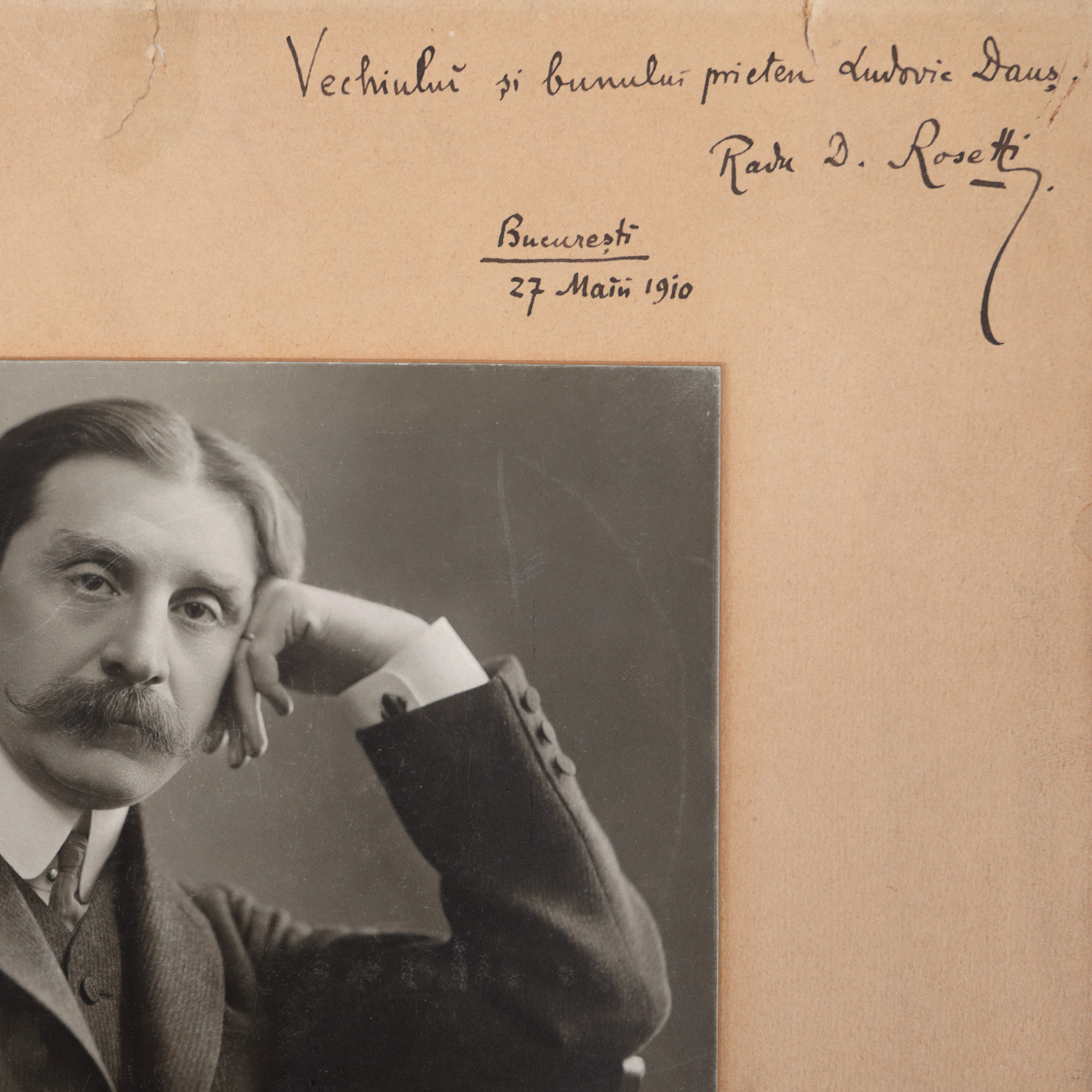 Scriitorul Radu D. Rosetti (1874-1964) este cunoscut astăzi mai ales datorită numeroaselor lui volume de impresii de călătorie, cu toate că a avut o bogată activitate literară. Fotografia este realizată la atelierul fotografic Julietta din București, este lipită pe cartonul original și poartă o dedicație olografă a lui către confratele Ludovic Dauș.