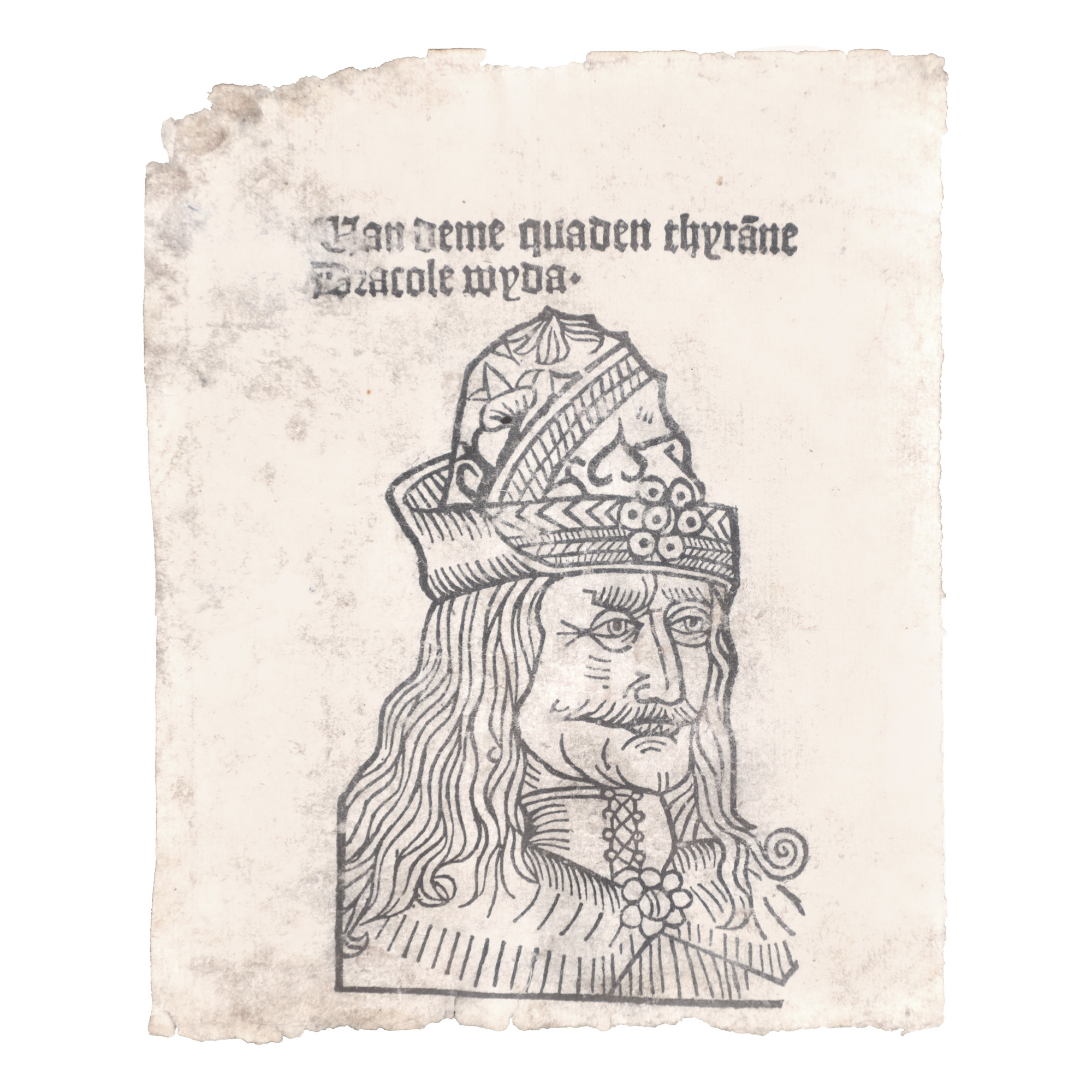 Xilogravură a figurii istorice a lui Vlad Țepeș, imprimată pe filă de incunabul reprezentând pagina de titlu a ediției princeps, incunabulul din Lübeck, 1488-1493. Pe fila recto, în partea superioară, deasupra gravurii, se păstrează un așa-zis colontitlu: „Uan Deme Quaden Thyrane Dracole Wyda“. Sub acest titlu este reprezentată pagina de titlu a ediției lui Bartholomaeus Gothan. Incunabulul de la Lübeck, din 1488-1493, este primul din ediția sa, conținând 12 pagini referitoare la istorisirile despre Vlad Țepeș. Gravura care îl reprezintă pe voievodul Vlad Țepeș este însoțită de un text tipărit într-un dialect din nord-vestul Germaniei denumit plattdeutsch, foarte apropiat de olandeză. Folosirea acestui dialect demonstrează că această gravură a avut o circulație limitată geografic, cel mai probabil nu a circulat în Transilvania unde se folosea dialectul din sudul Germaniei, respectiv niederdeutsch. Pe fila de hârtie, de calitate superioară, se poate observa cu ajutorul tehnicii moderne de laborator, un filigran care prezintă stema orasului Ranvensburg din Germania. Filigranul prezintă de fapt poarta principală a orașului Ranvensburg, unde predomină două turnuri întărite, dispuse într-un scut frânt. A avut o bună circulație în spațiul german și occidental în secolele XIV-XV. Acest tip de filigran este remarcat și de filologul Alexandru Mareș printre filigranele care au circulat în Țările Române în secolul al XVI-lea, fiind denumit impropriu zid de cetate. În genere, edițiile germane ale povestirilor despre Dracula aveau foarte multe reproduceri însoțite de mici istorioare sugestive, tipărite și colorate manual. Erau vândute în târguri importante ale Germaniei și Europei, cu scopul de a promova în mod deliberat o imagine deformată despre așa-zisele atrocități provocate de voievodul muntean sașilor din Transilvania. Titlul se referă la legendele țesute în jurul său, o calomnie monstruoasă. Edițiile unor incunabule reproduceau în serie astfel de file conținând gravuri cu istorioare pe înțelesul oamenilor de rând. Cele mai cunoscute reproduceau figuri istorice din edițiile: Bamberg, 1491, 1494, 1499, Lübeck, 1488-1493 și Hamburg, 1502, Nürnberg, 1488, Strassbourg, 1500, Augsburg 1520.