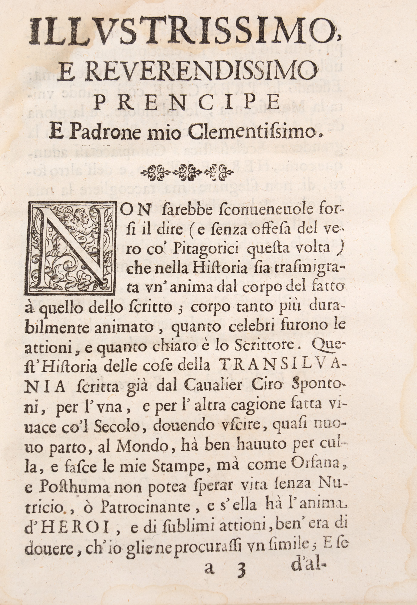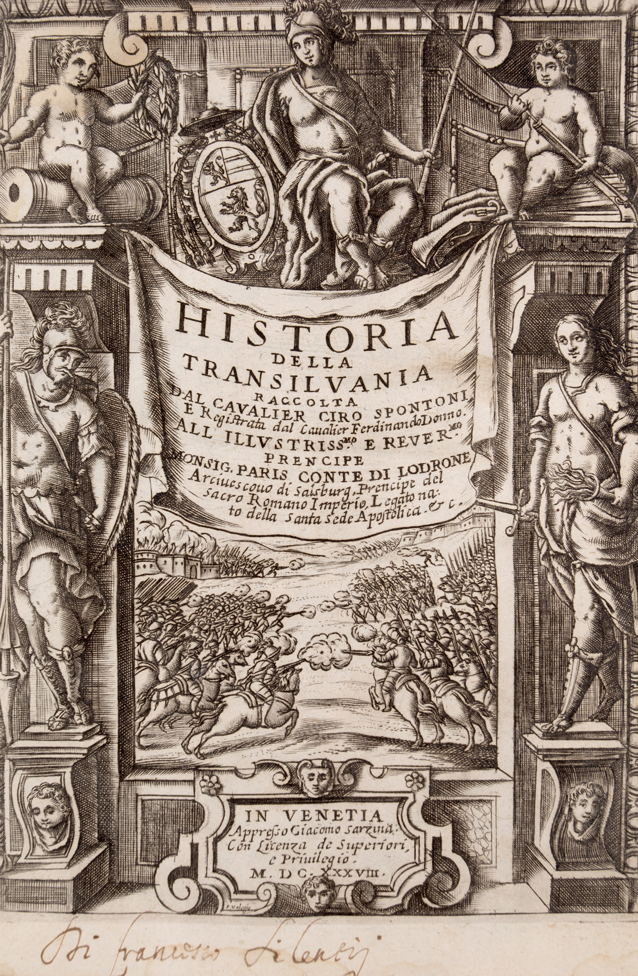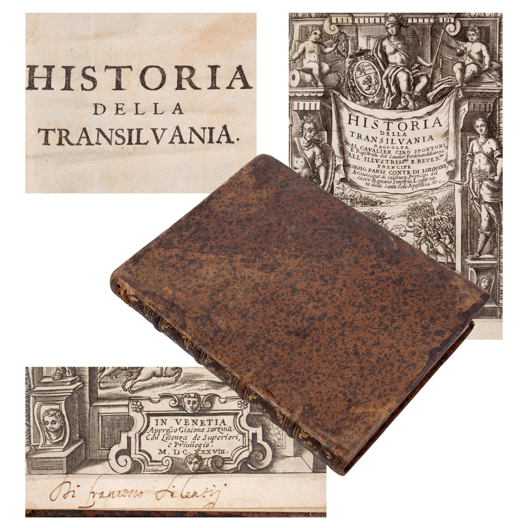 Cartea lui Ciro Spontone este completă, având 16 file + 351 pagini. Legătura cărții este din tăblii de carton învelite în piele de culoare maro, marmorată. Pe cotor se află imprimate ornamente de compoziție tipografică și succesiuni de vrejuri aurite. Din punct de vedere artistic, atrage atenția ținuta grafică îngrijită; frontispiciile, inițialele ornate și vignetele, dar mai ales gravura paginii de titlu.Ciro Spontone, scriitor și poet italian, originar din Bologna. În timpul vieții a îndeplinit funcția de secretar al guvernatorului din Ancona, C. Boncompagni, a lui L. Bentivoglio din Castelo, al ducelui de Nemours din Torino, al marchizului Marco Pio de Sassuolo și a a lui marchizului de Castiglione, Rodolfo Gonzaga. În răstimpul cât s-a aflat în serviciul lui Gonzaga a scris cartea despre războiul din Transilvania. O perioadă scurtă de timp a fost guvernator în Rovigo, iar între 1600 și 1610 secretar al Senatului din Bologna. A scris, printre altele, poema Nero (1588), Hercule difensore d,Homero (1595), Dodici libri del governo di Stato (Verona, 1599), La corona del principe (Verona,1590), Il Bottrigaro (Verona, 1589) e Hercole difensore di Homero (Verona, 1595), un comentariu asupra poeziei lui Tasso (Verona, 1587), și Attioni de’ re dell’Ungheria (Bologna, 1602), celebra Metoposcopia, și Historia della Transilvania (Venezia, 1638). Cartea Historia della Transilvania este de un real interes pentru istoria românilor și a lui Mihai Viteazul. De fapt, ca secretar al generalului austriac Basta, a redactat memoriile acestuia, sub titlul anunțat, pe care a tipărit-o în anul 1638, la Veneția, în imprimeria lui Giacomo Sarzina. Din punct de vedere istoric, memorialul militar oferă o frescă impresionantă asupra realităților sociale-conomice, politice și militare din spațiul carpoato- dunărean din epoca lui Mihai Viteazul. Exemplar original, prezintă gravuri și decorații însemnate, se află în stare bună de conservare și are valoare patrimonială deosebită.