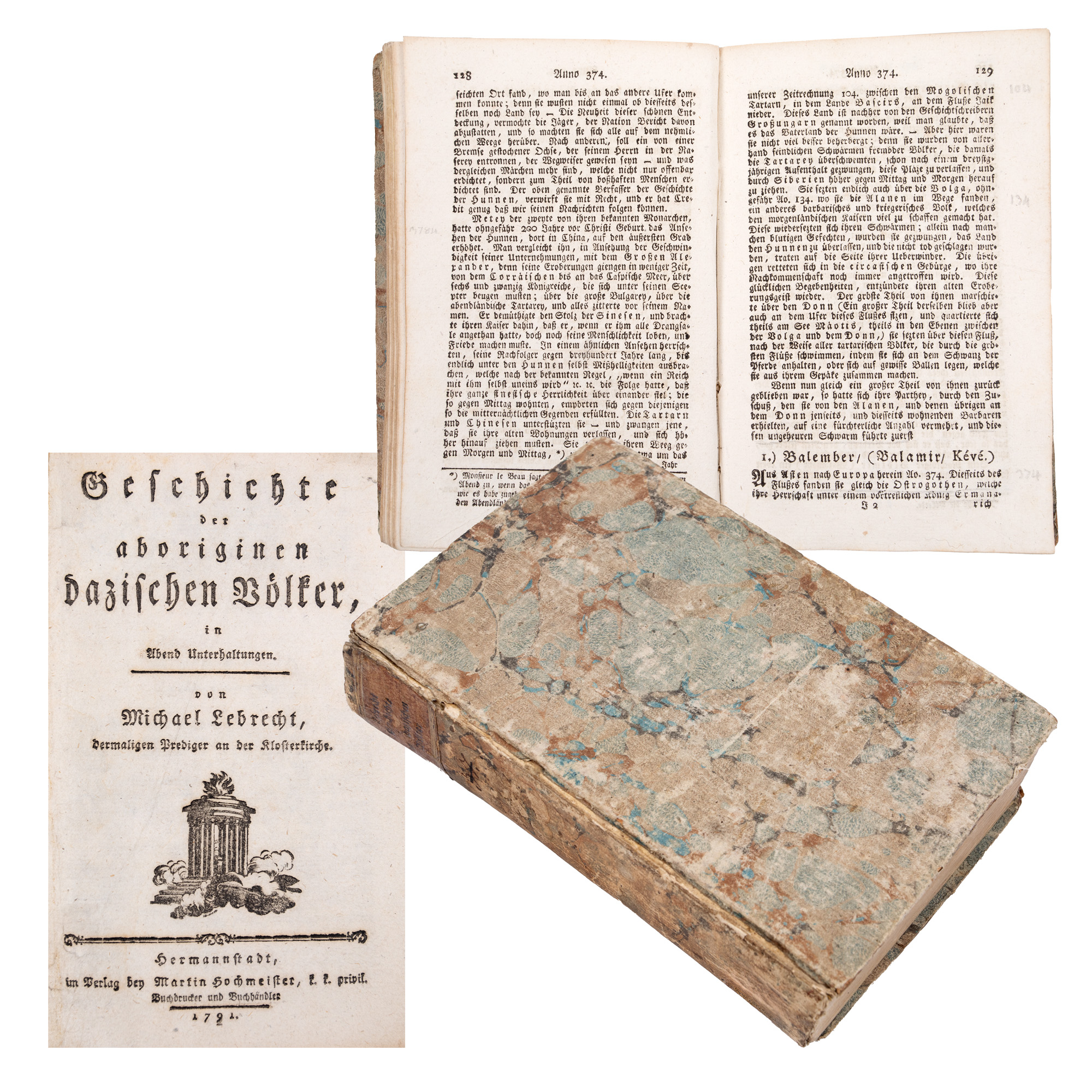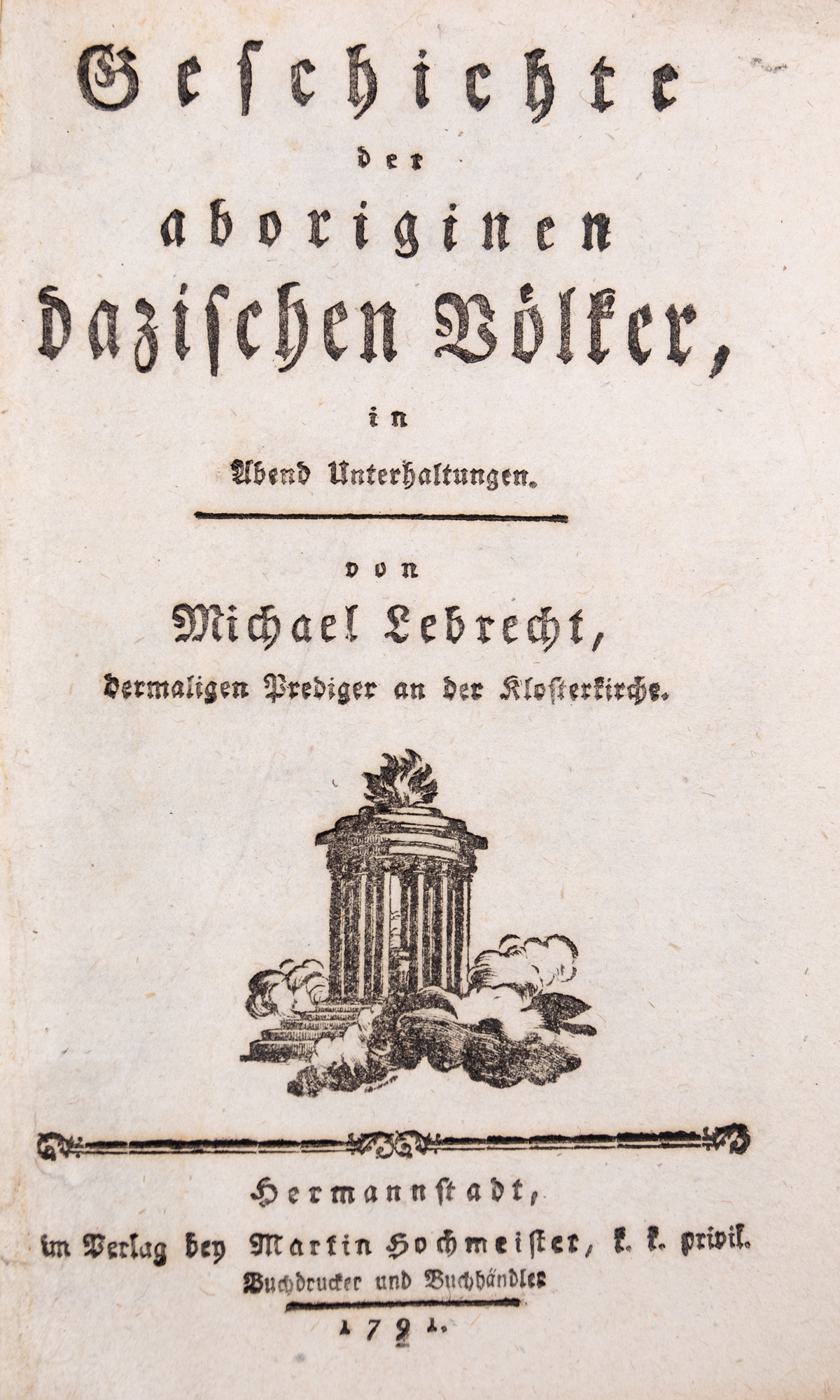 Este un exemplar complet, având (5) file+416 pagini. Cartea a fost tipărită în limba germană, în tipografia lui Martin Hochmeister din Sibiu. Prefața a fost scrisă în aprilie 1791. Legătura exemplarului (190 x 125 mm) este cea originală, din tăblii de carton învelite în hârtie de nuanță gri marmorată, ce păstrează pe cotor eticheta veche. Michael Lebrecht (1757-1809), istoric sas, a trăit în Transilvania, în epoca Luminilor, fiind, un timp, preot evanghelic în Șura Mică (Sibiu). Preocupat de trecutul și realitățile vieții sociale, economice, politice și militare ale țării, a scris și tipărit mai multe cărți, cu un larg răsunet în cadrul epocii: Die Geschichte von Siebenburgen, Hermannstadt, 1784, Versuch einer Erdbeschreibung des Grossfurstenthums Siebenburgen, Hermannstadt, 1789, Leben Johann Corvins, în „Siebenburrrghische Quartalschrift“, I, 1790, Uber den National-Charakter der in Siebenburgen befindlichen Nationen, Wien, 1792, Siebenburgens Fursten. I-II, Hermannstadt, 1791, 1792. Importanța acestor scrieri îl alătură pe Michael Lebrecht pleiadei cărturarilor sași din cadrul epocii, precum Filstich, Felmer, Eder, Haner, Seivert, Wolf. Încheiem această succintă prezentare subliniind faptul că Michael Lebrecht a fost mult apreciat de istoricii Școlii Ardelene. Reprezintă o lucrare istorică privitoare la autohtonii Transilvaniei, autorul tratând, pe baze științifice, trecutul locuitorilor acestui teritoriu din antichitate până în secolul al X-lea, la venirea ungurilor. Cartea conține multe date privitoare la români, la daci și romani, despre împărații romani de la Traian până la Aurelian (născut în Dacia), despre latinitatea limbii române, obiceiurile și sărbătorile populare din Ardeal (asemănându-le cu floraliile antice), despre obârșia națiunii române din coloniile împăratului Traian. Apărută în perioada Supplexului, scrierea aceasta a susținut, într-un fel, prin temeiuri istorice, revendicările naționale ale românilor din Transilvania. A fost, prin urmare, firesc ca această lucrare să fie căutată și folosită în scrierile cărturarilor români. Ioan Budai-Deleanu chiar afirma că Lebrecht a redactat una din cele mai frumoase pagini săsești despre romanitatea românilor, iar cărturarul Sava Brancovici din Rășinari (Sibiu) folosea afirmațiile lui Lebrecht, despre obârșia dacică, la redactarea predicii cu titlul Istoria Românilor din Țara Ardealului, ținută în august 1792. În concluzie, această tipăritură aparținând, bibliologic vorbind, domeniului daco-romanica, reprezintă o lucrare de o deosebită însemnătate pentru istoriografia Transilvaniei.