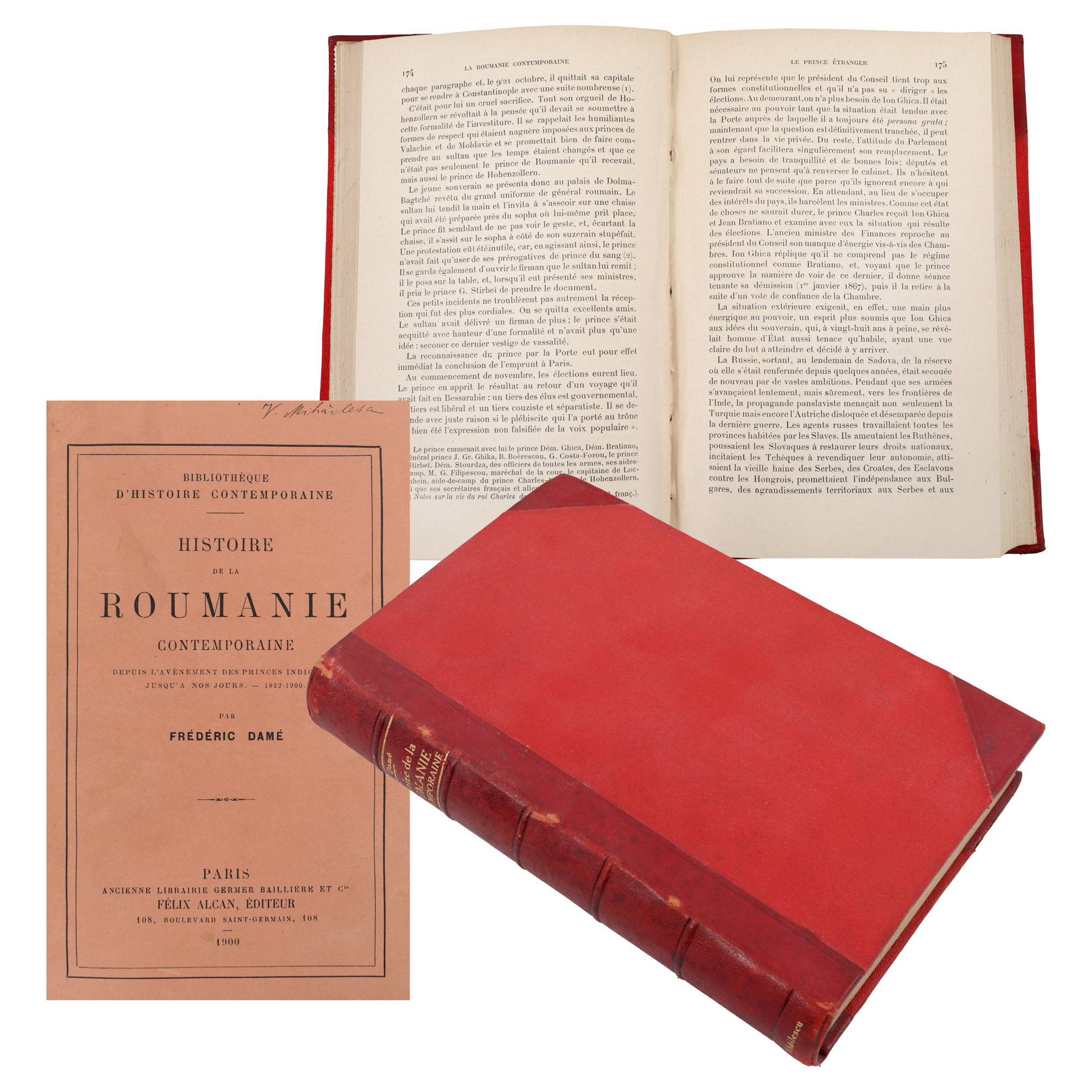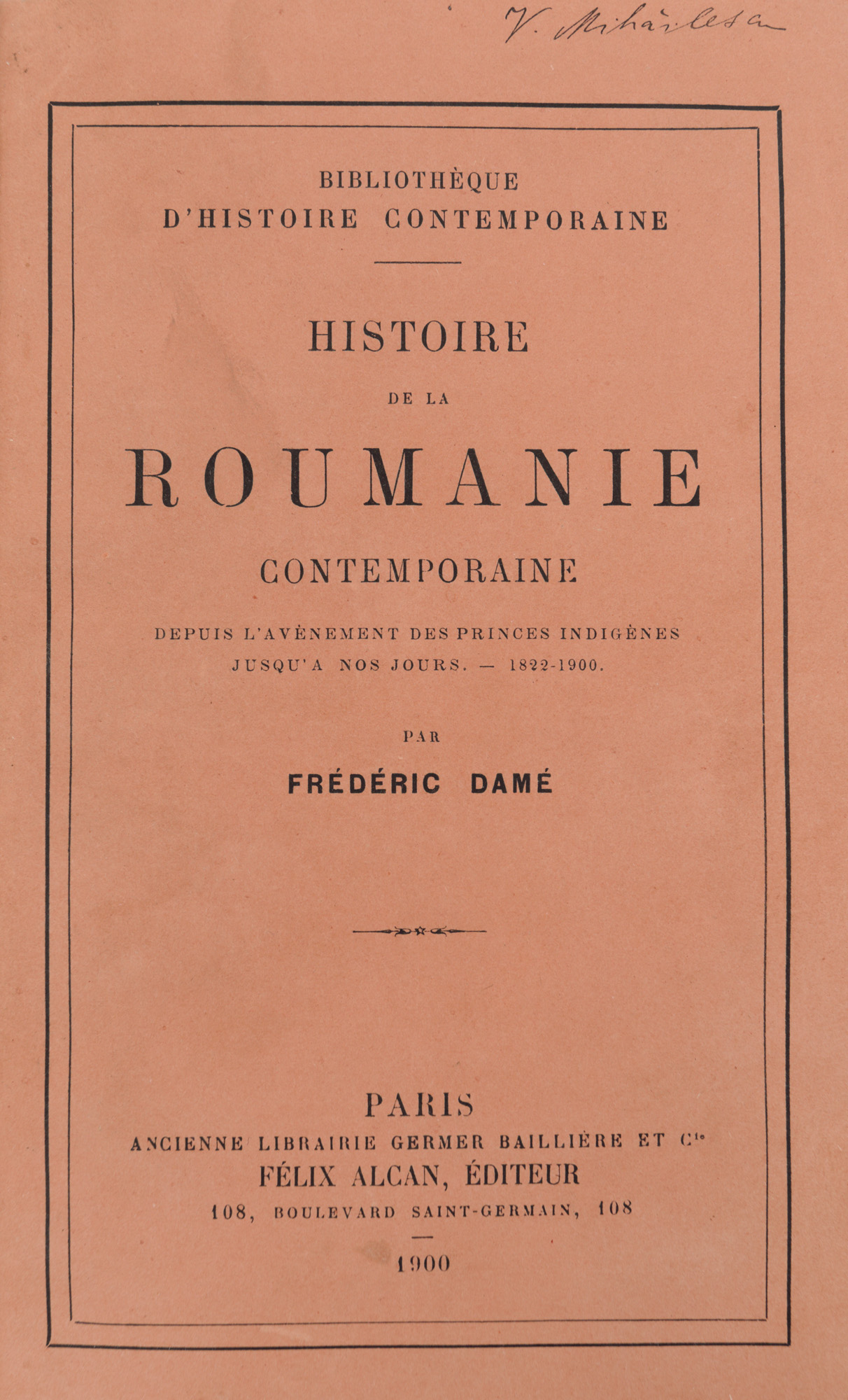 Ziaristul francez Fredric Damé (1849-1907) s-a stabilit definitiv în România în 1872 și a avut o bogată activitate ca fondator de ziare în limba franceză și profesor la liceul Sf. Sava din București. După publicarea acestei lucrări la Paris, în care descria istoria românilor între 1822 și 1900, Damé a intrat într-o aprinsă polemică cu istoricul Nicolae Iorga care l-a criticat vehement. Exemplarul se află într-o foarte bună stare de conservare, este legat în pergamoid, cu colțare și cotor din piele.