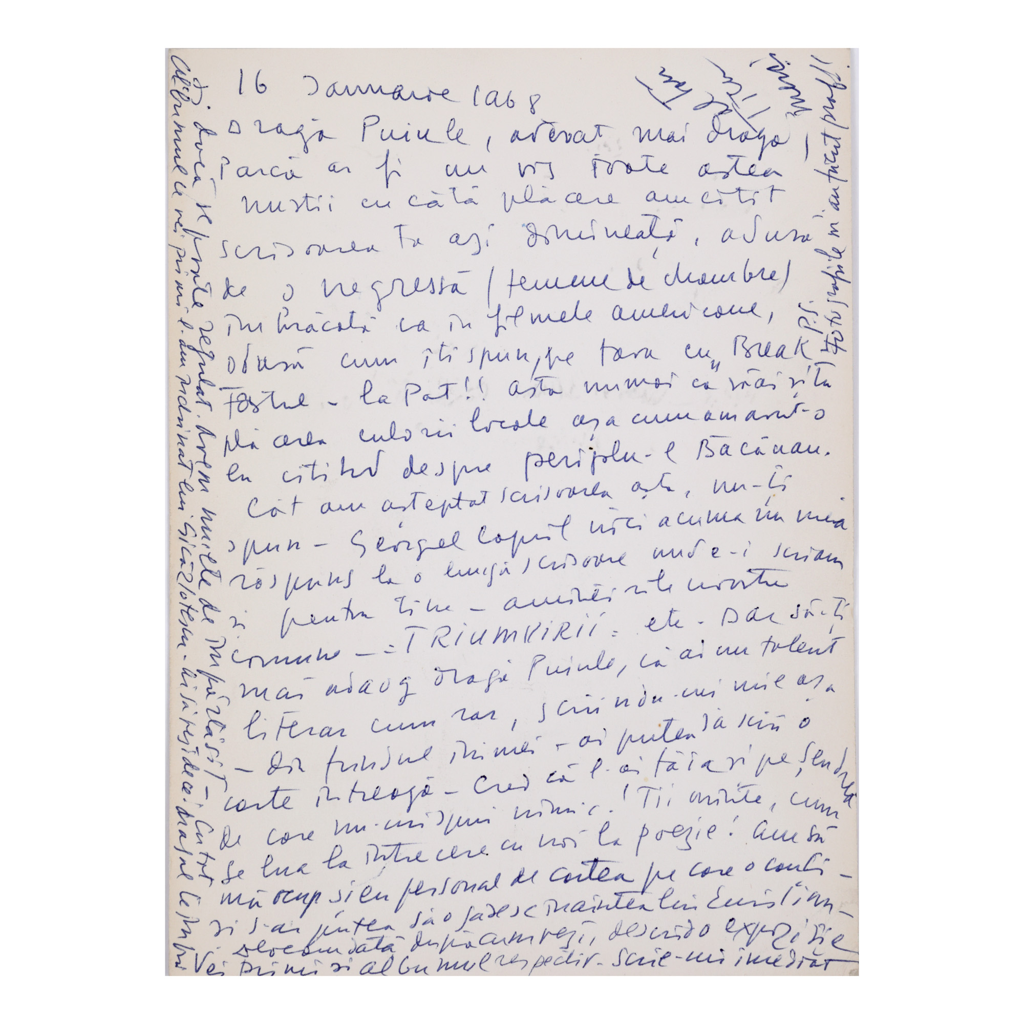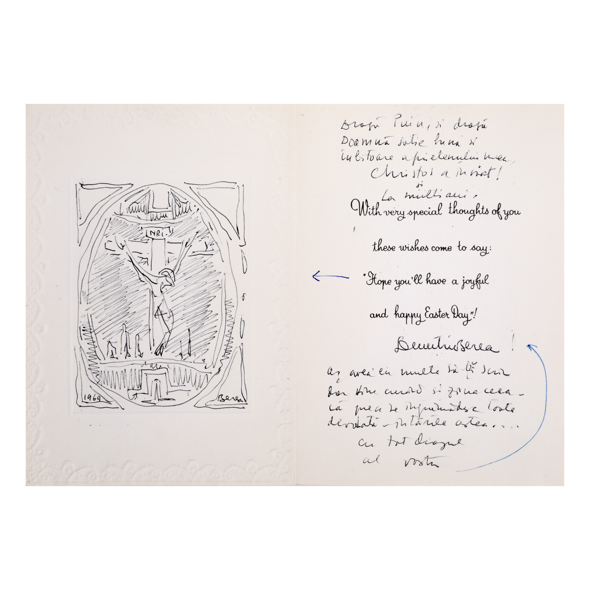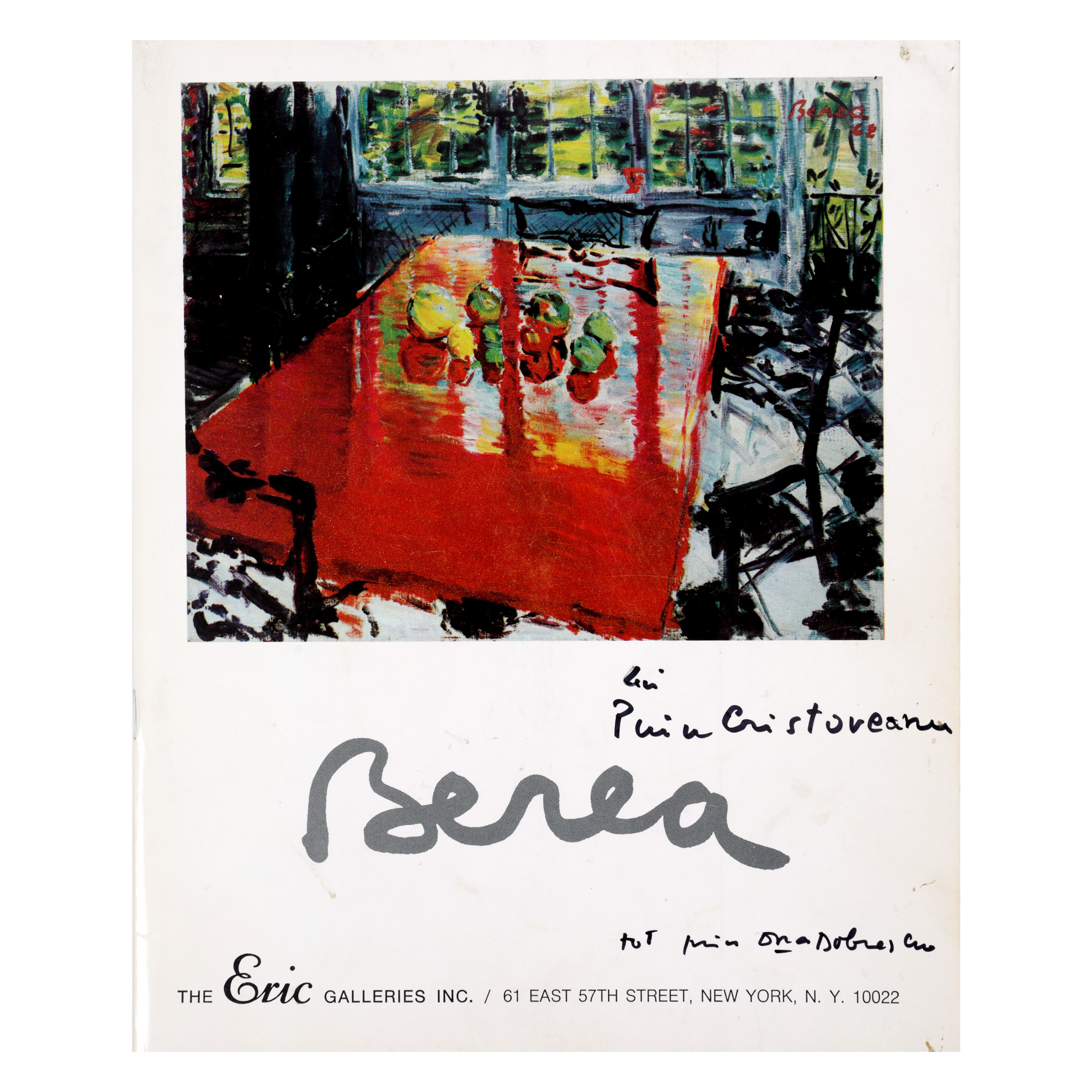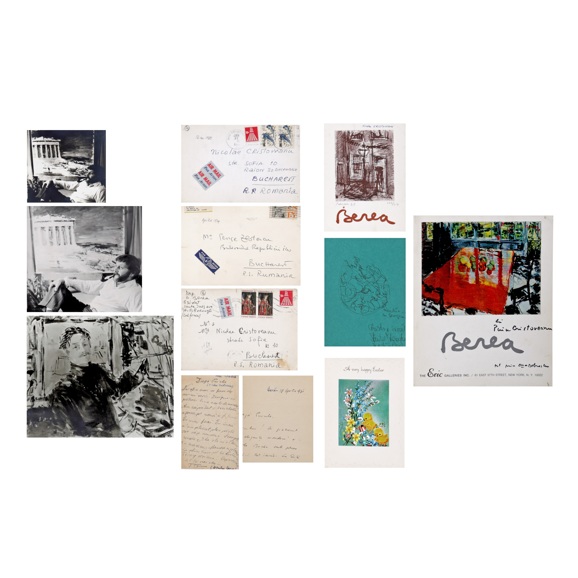 Lotul este alcătuit din mai multe piese referitoare la pictorul Dimitrie Berea, astfel: 1. Catalogul expoziției personale deschisă la New York în 1973, cu dedicația olografă a artistului către Puiu Cristoveanu. 2. Carte poștală olografă către Nicolae Cristoveanu, circulată de la Tg. Neamț la Agapia, 25 iulie 1927. 3. Scrisoare olografă, semnată și datată, către Puiu Cristoveanu, 18 aprilie 1931. 4. Felicitare de Anul Nou 1969 trimisă de pictor din America lui Nicolae Cristoveanu, datată și semnată, în plicul original, cu un desen al artistului realizat cu pixul în interior. 5. Felicitare de Paște realizată manual de pictor, cu un text olograf și desen inedit, trimisă din America lui George Zlotescu, în plicul original. 6. Invitație la o expoziție personală, trimisă din America de pictor lui Nicolae Cristoveanu, cu un amplu text olograf, datat și semnat, în plicul original. 7. Invitație la o expoziție personală realizată de artist sub forma unei litografii, semnată cu creionul "Berea 68", exemplar 100/250. 8. Trei fotografii realizate de Nicolae Cristoveanu (două portrete ale artistului și o lucrare a lui), una cu o dedicație olografă, semnată și datată, a pictorului.