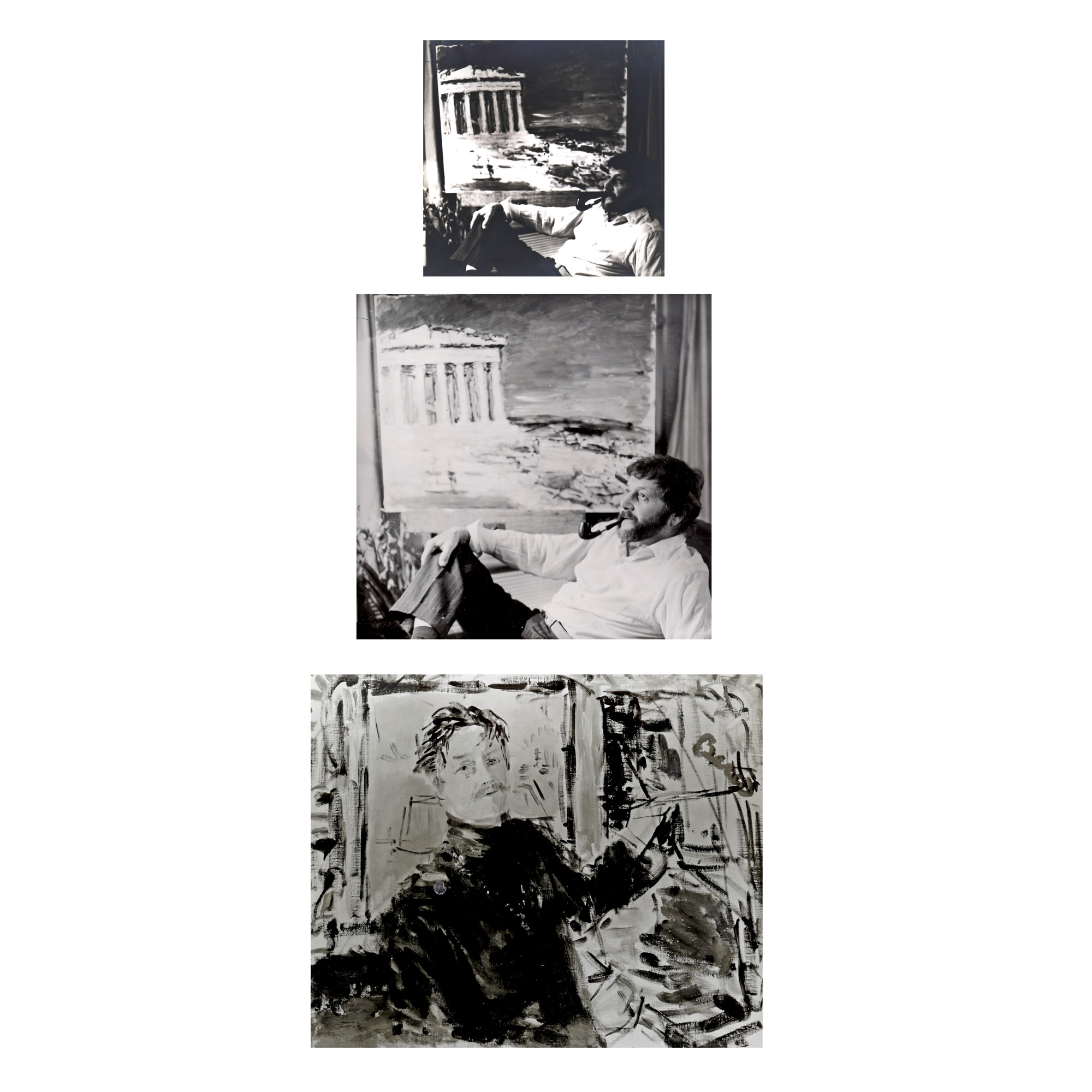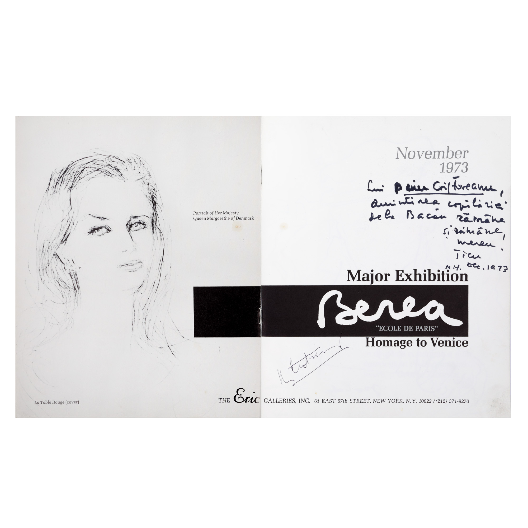 112. Lot complex format dintr-un catalog al unei expoziții Dimitrie Berea, fotografii și documente cu dedicațiile și semnăturile olografe ale artistului către Nicolae Cristoveanu și George Zlotescu, 1968-1974
