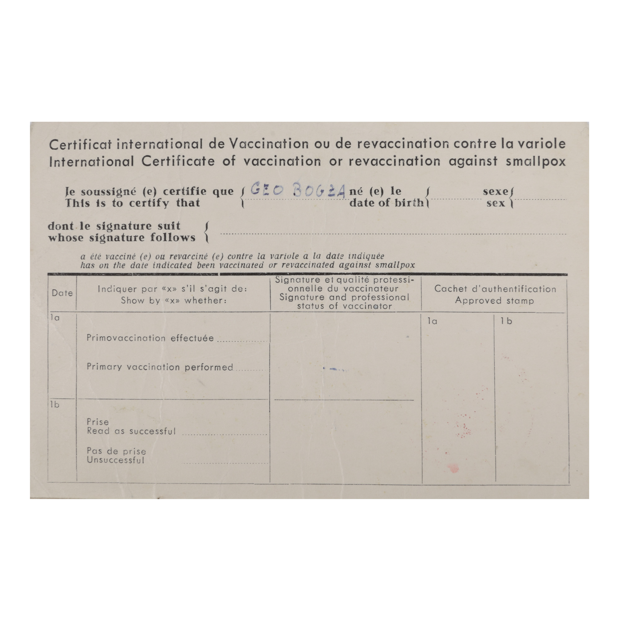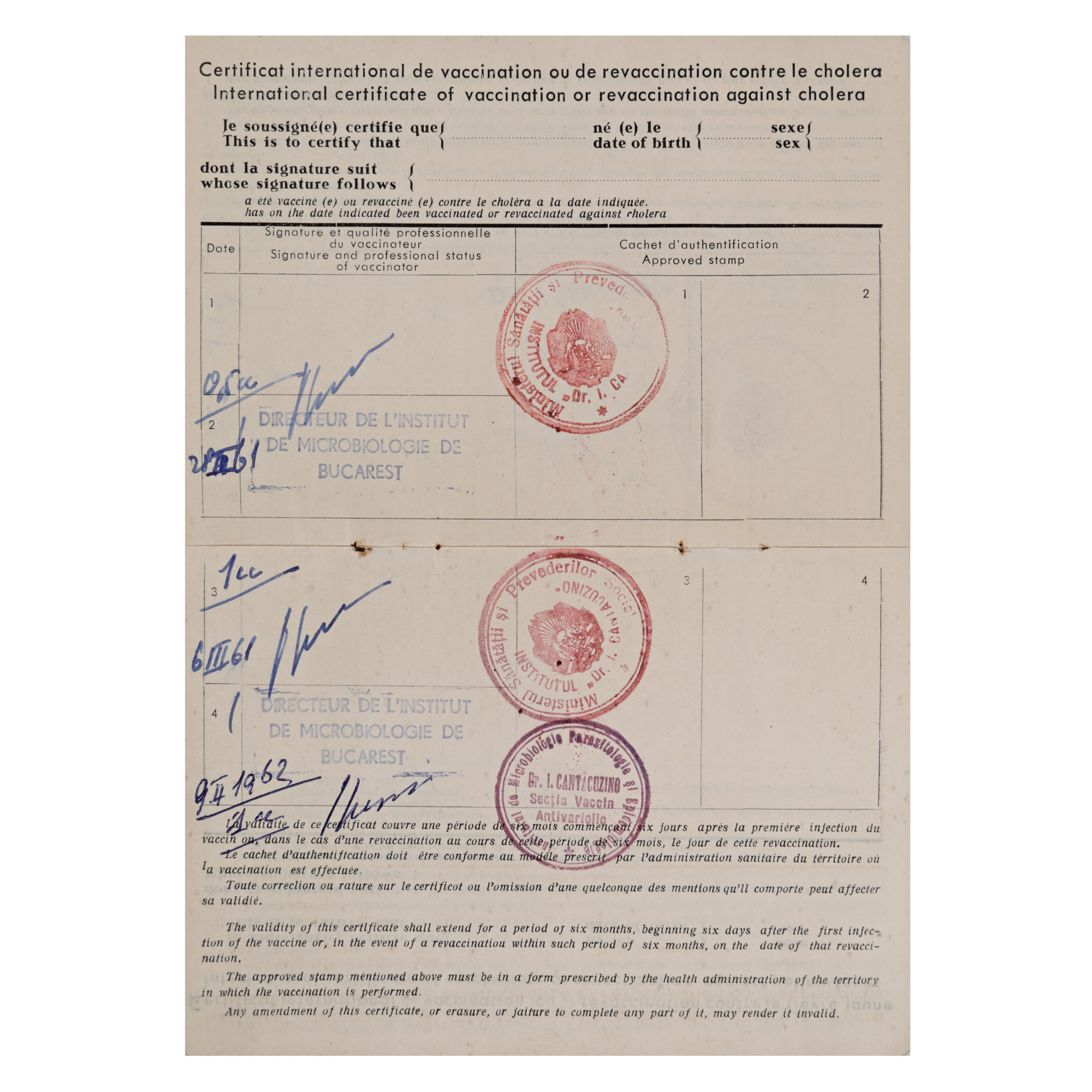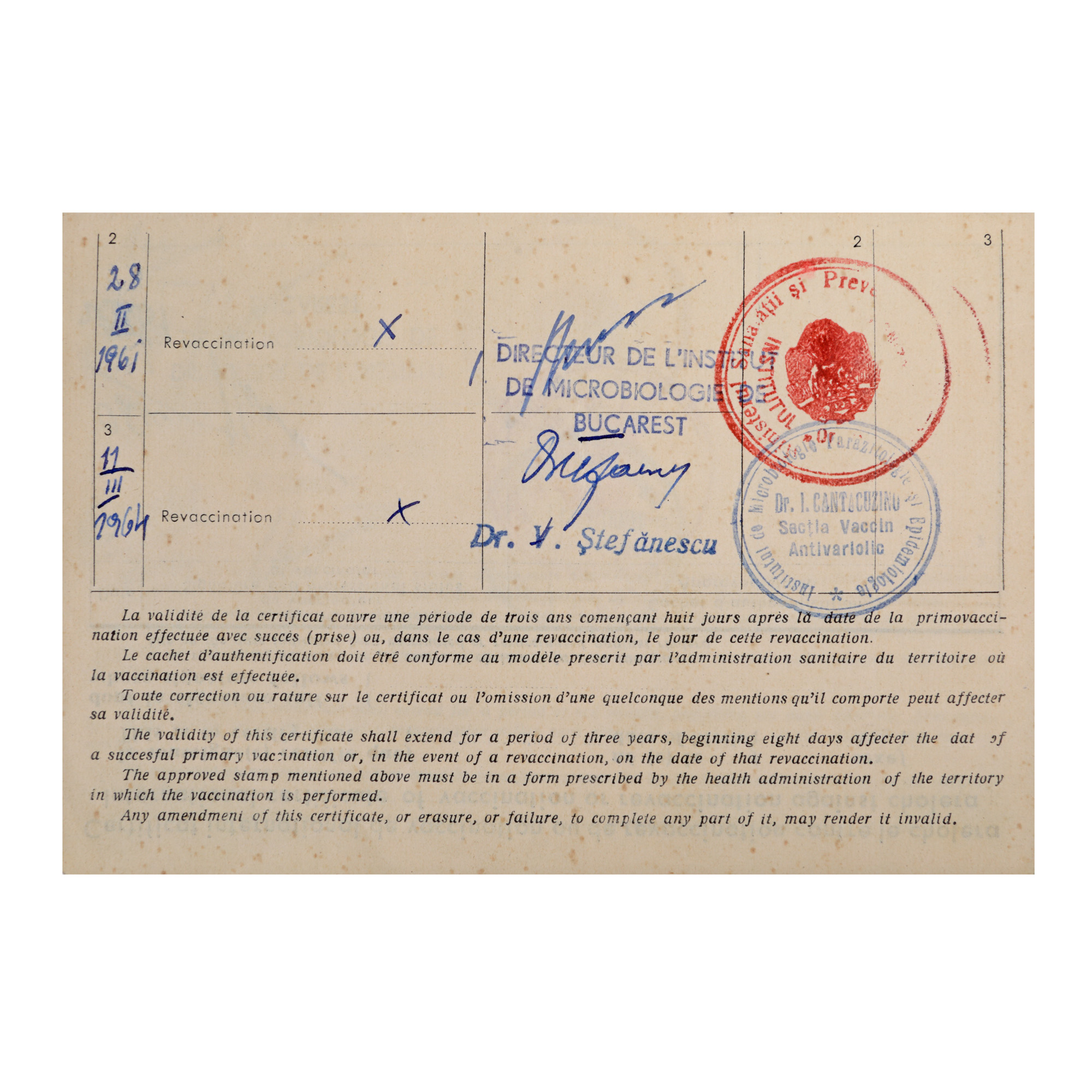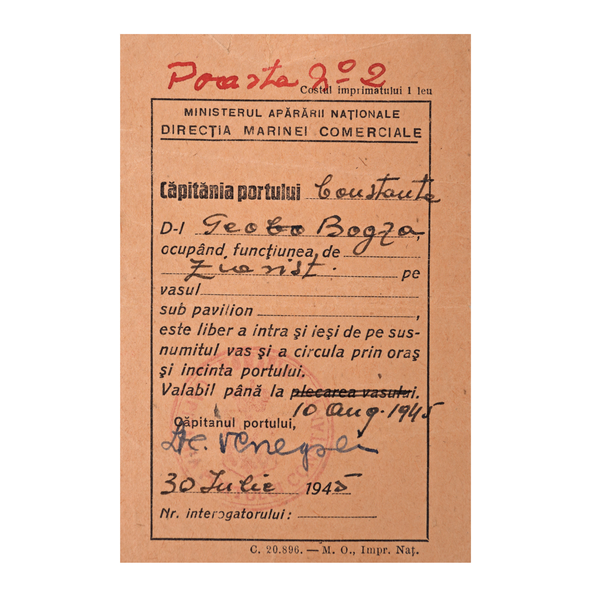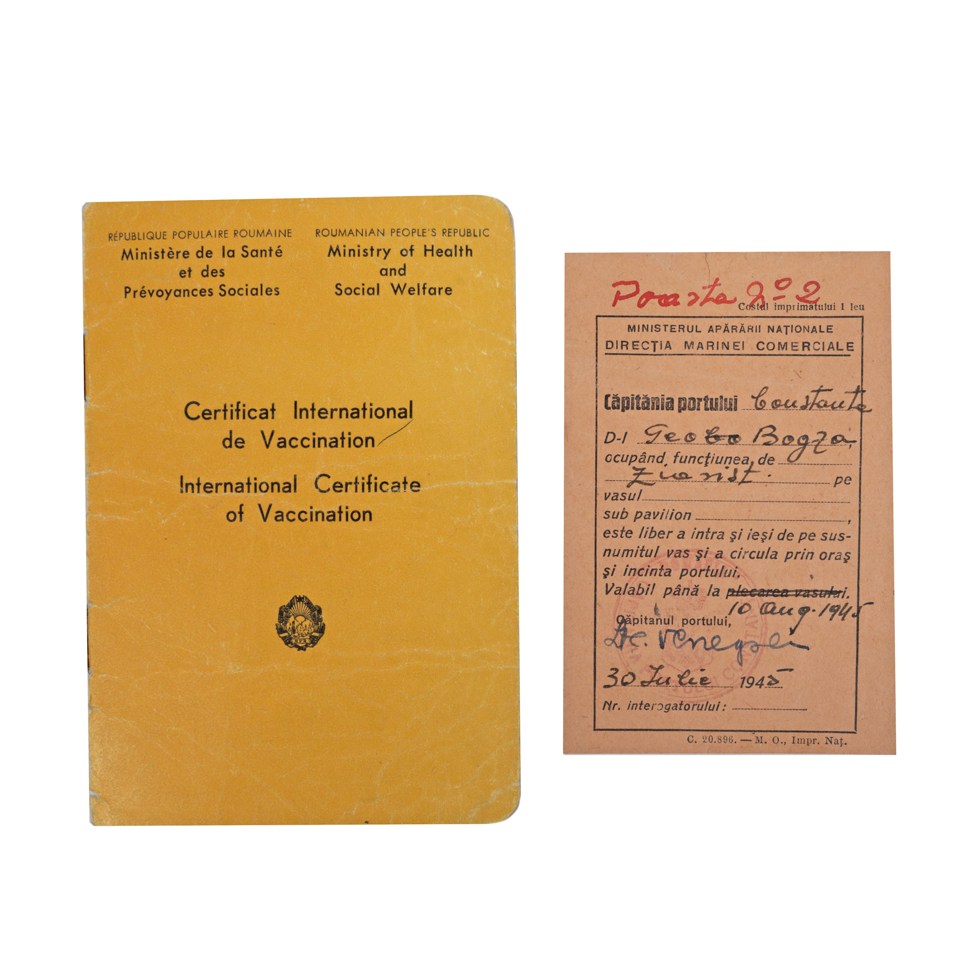 113. Lot format din certificat internațional de vaccinare și permis de acces pe un vas comercial, 1945-1961, au aparținut lui Geo Bogza