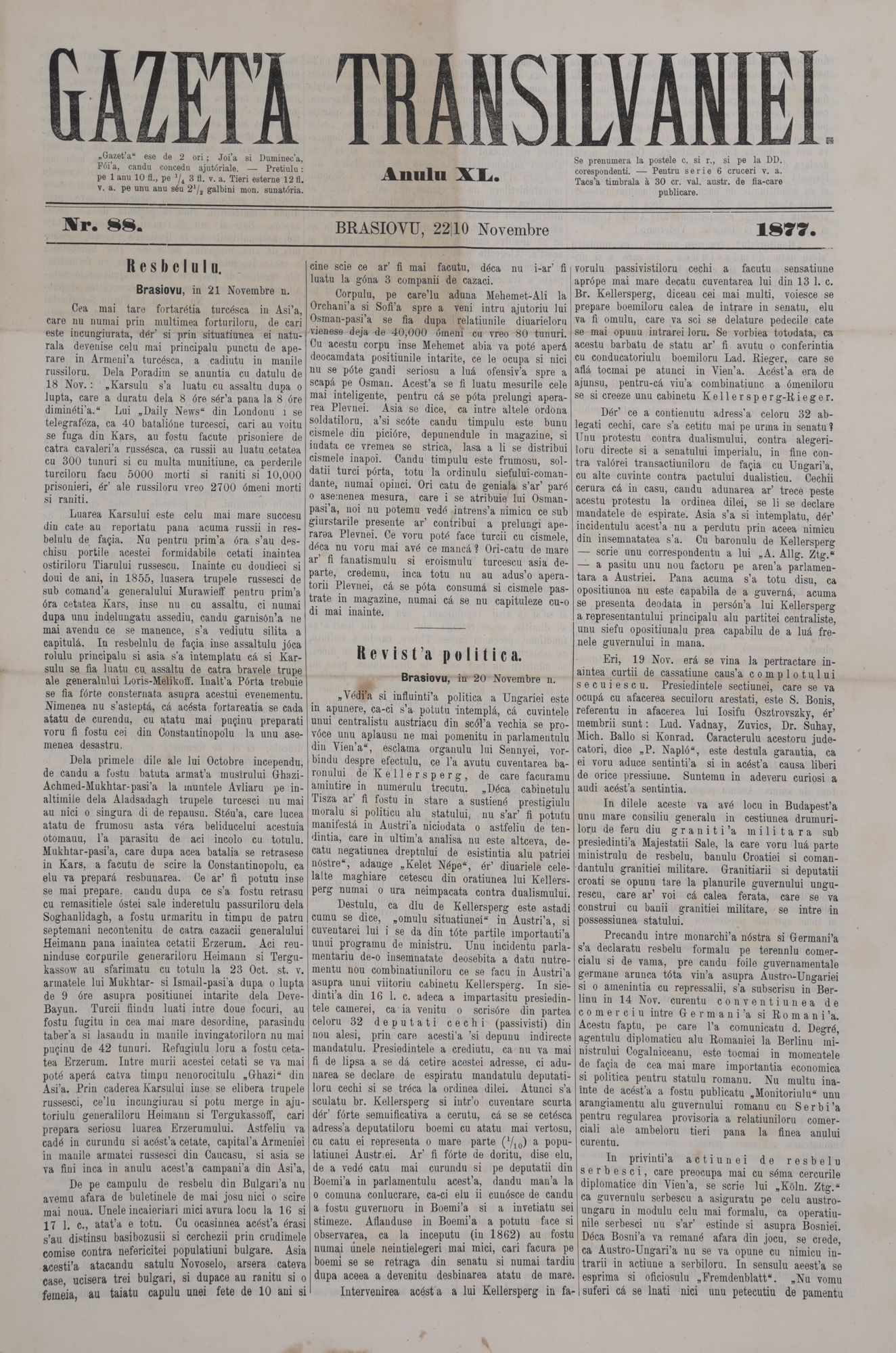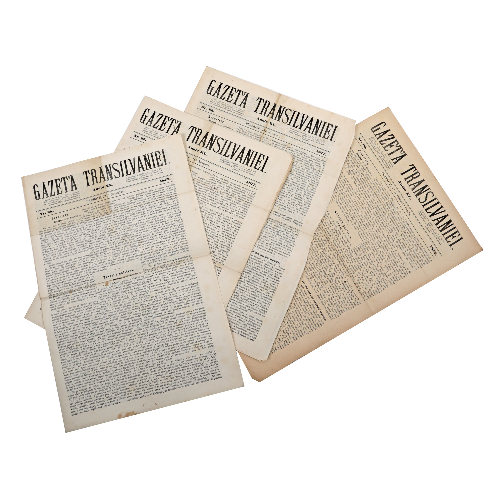 131. Lot format din patru numere ale ziarului ”Gazeta Transilvaniei”, Brașov, 1877 (nr. 85-88), numere dedicate Războiul de Independență al României