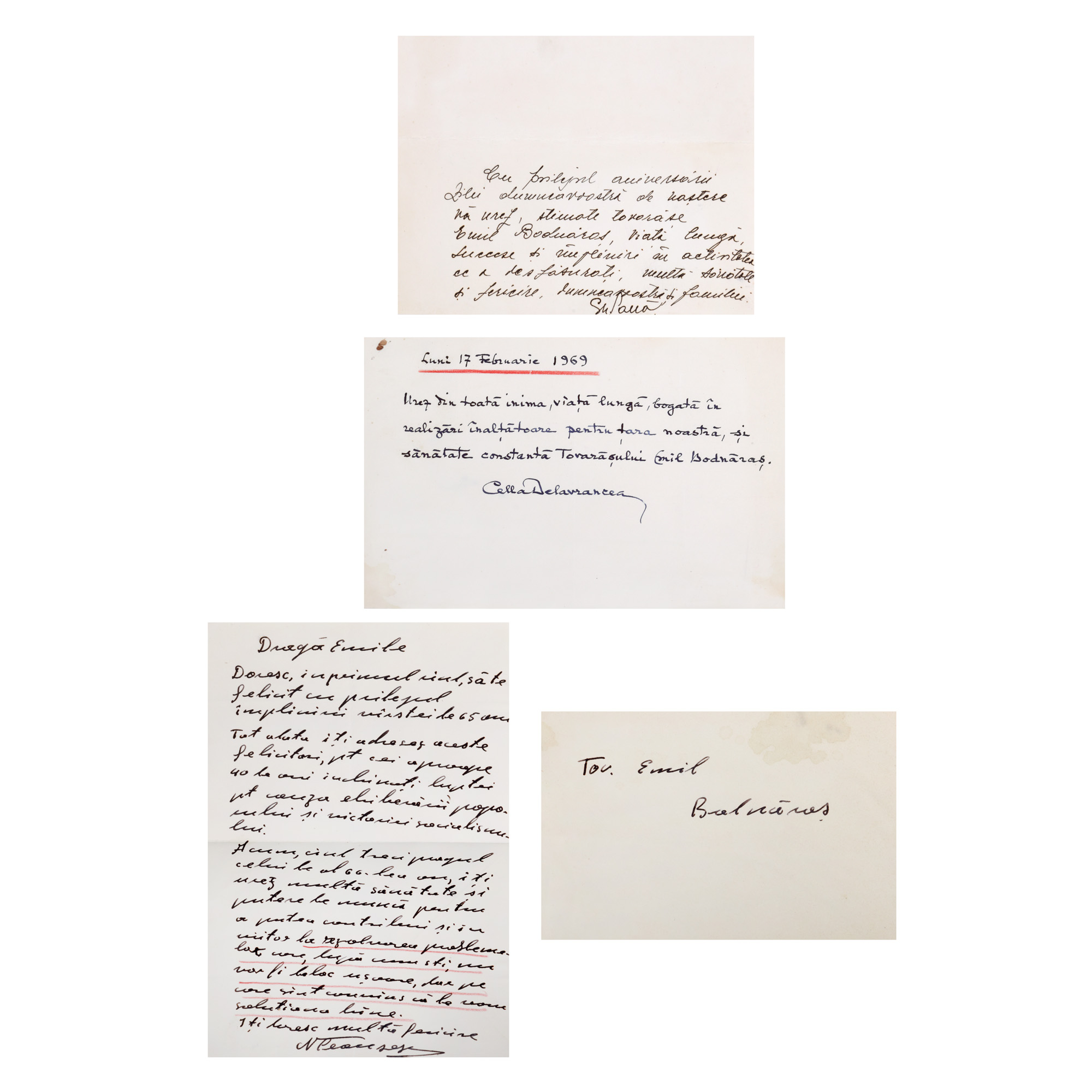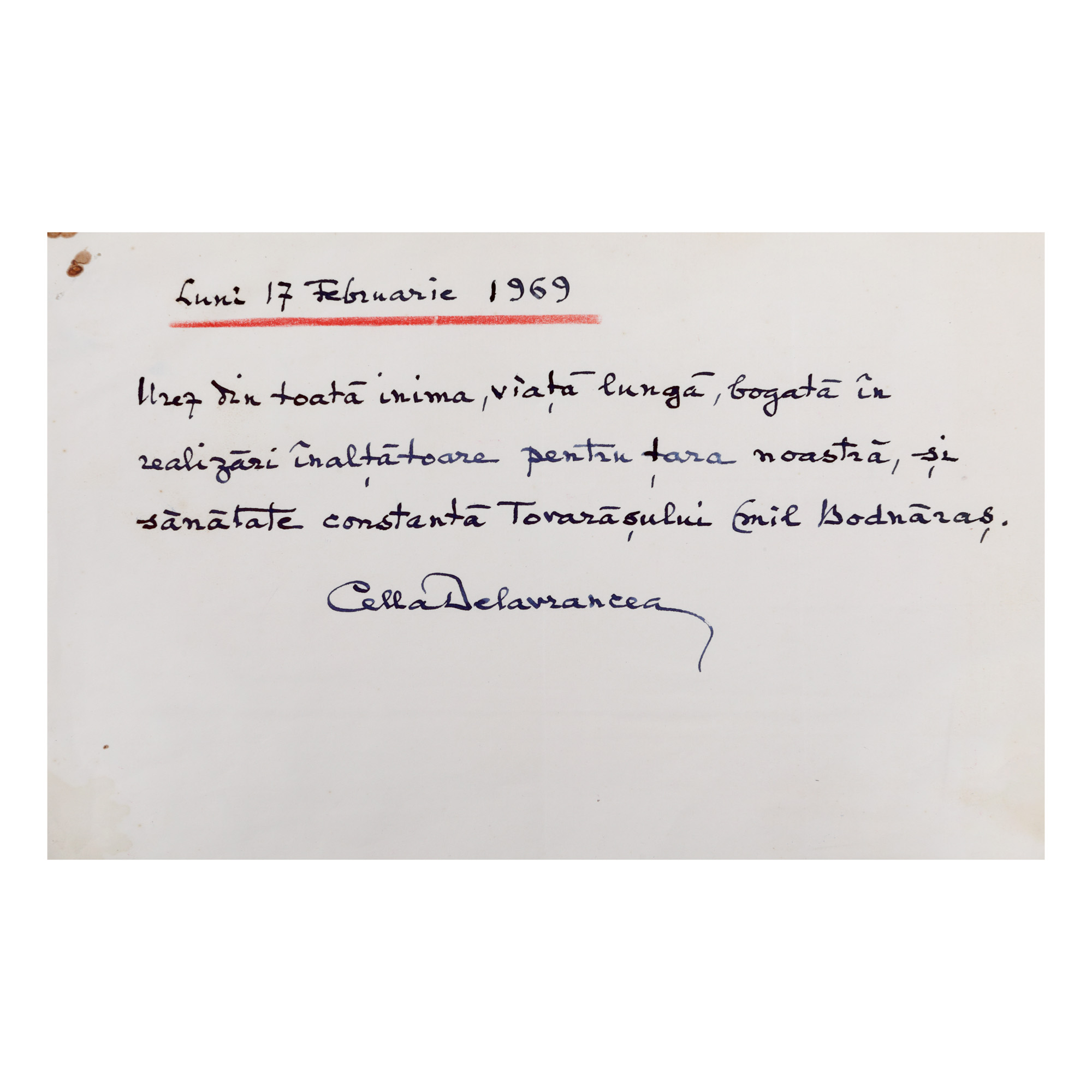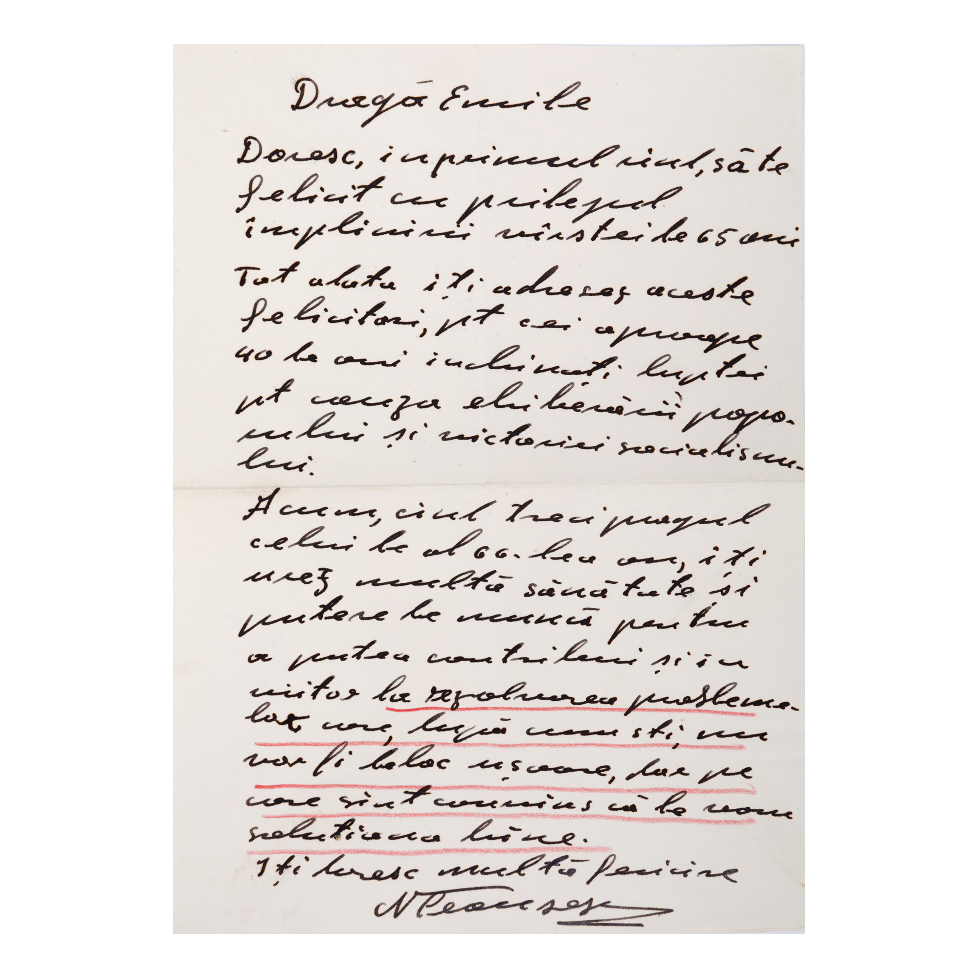 103A. Lot format din trei scrisori trimise de către Nicolae Ceaușescu (însoțite de plic), Gheorghe Pană și Cella Delavrancea, către fostul Ministru al Apărării Naționale Emil Bodnăraș, cu ocazia aniversării sale, 1969, cu semnături olografe