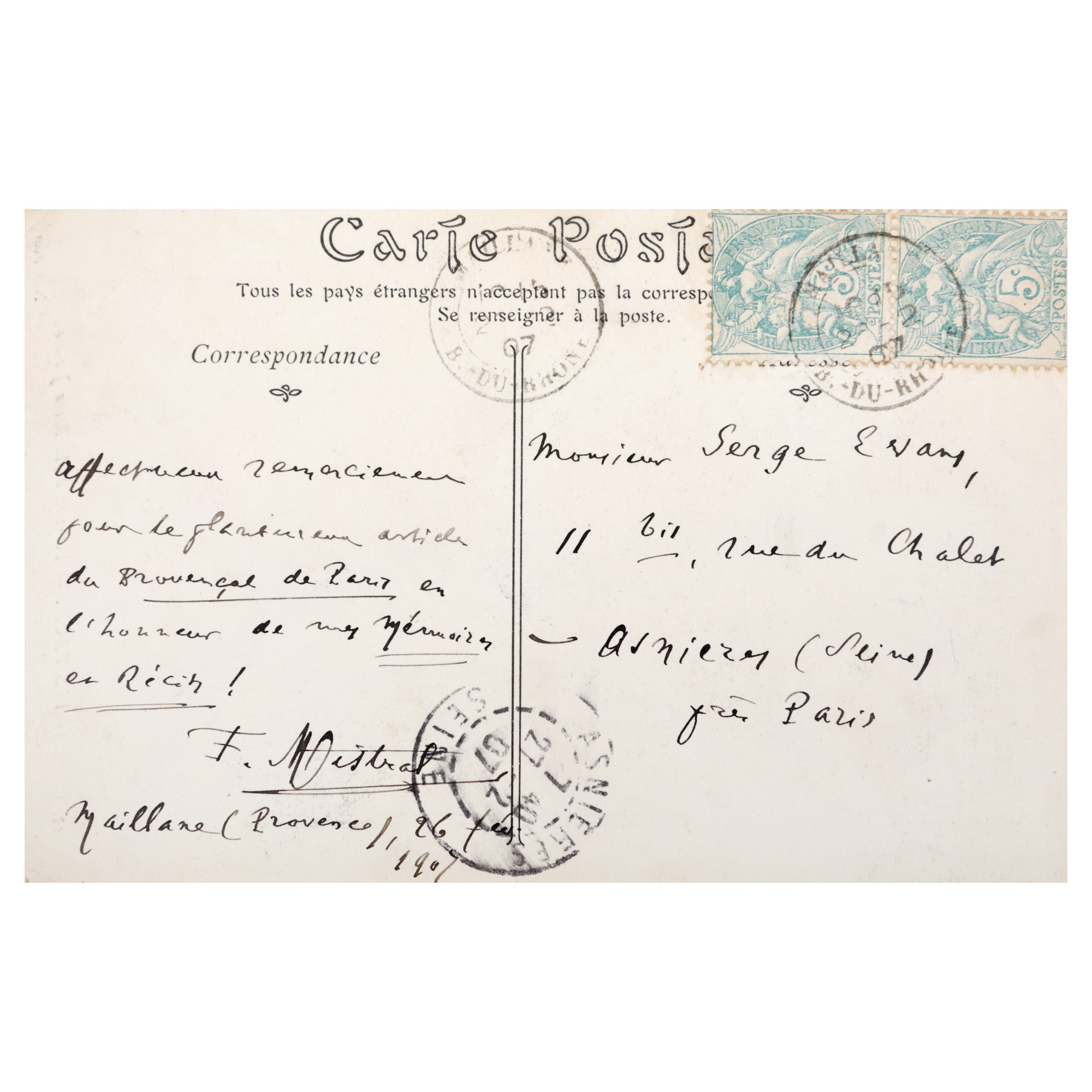 Scriitorul provensal Frederic Mistral (1830-1914), câștigător în 1904 al premiului Nobel pentru literatură, a fost fondatorul și președintele Societății Scriitorilor Felibri. El s-a aflat într-o relație de prietenie cu Vasile Alecsandri care a fost premiat de confrații Felibri și care l-a prezentat reginei Elisabeta a României. Cartea poștală este redactată olograf, semnată și datată.