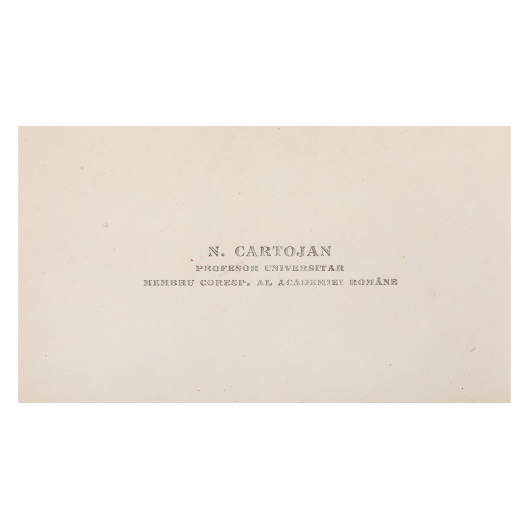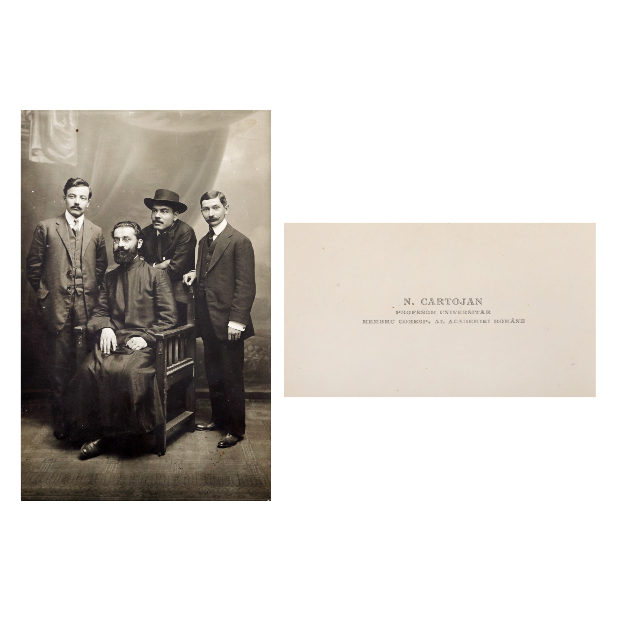 Istoricul literar, profesorul universitar și academicianul Nicolae Cartojan (1883-1944) apare, primul din dreapta, într-o fotografie de tinerețe. Lotul este completat de o carte de vizită a acestuia din perioada deplinei maturități.