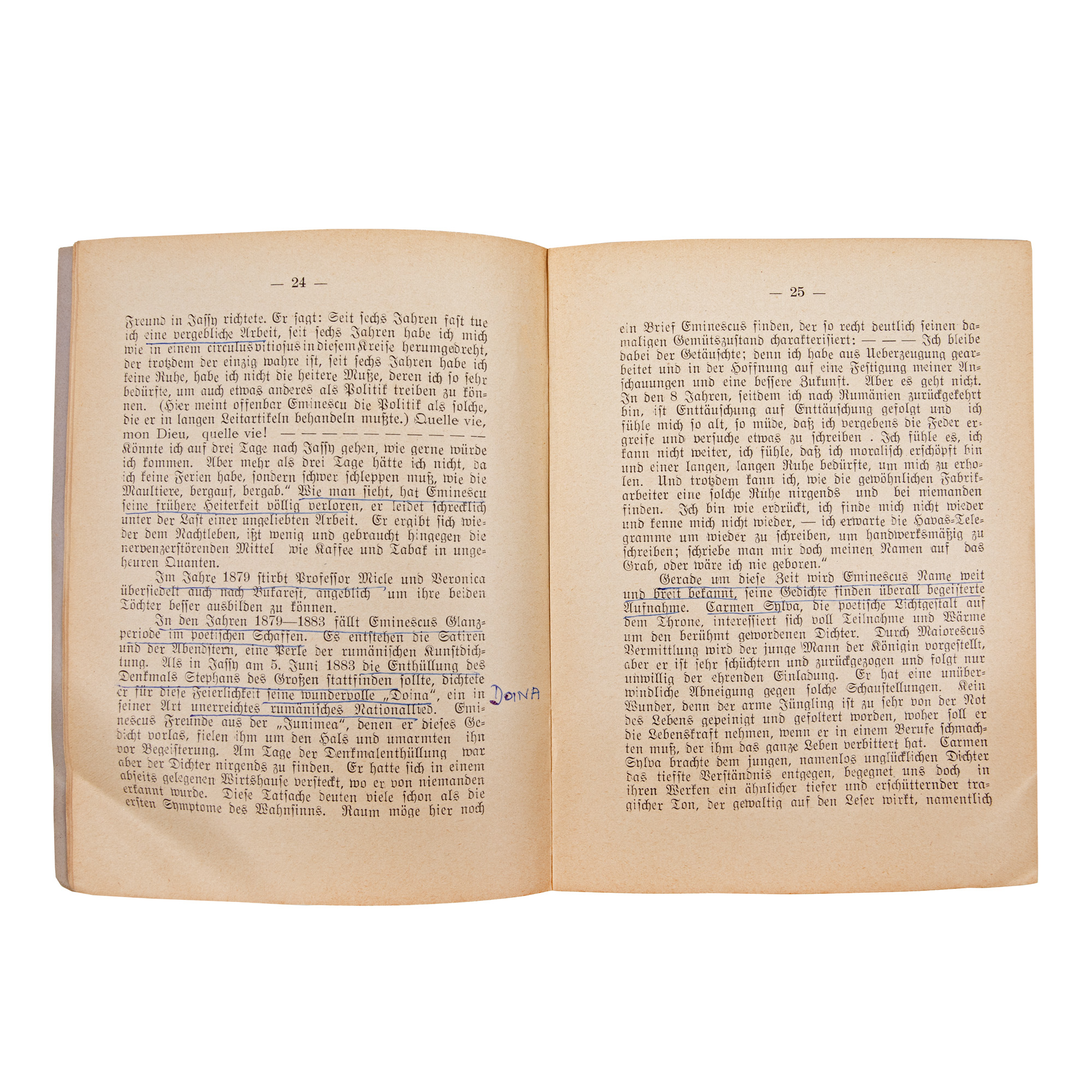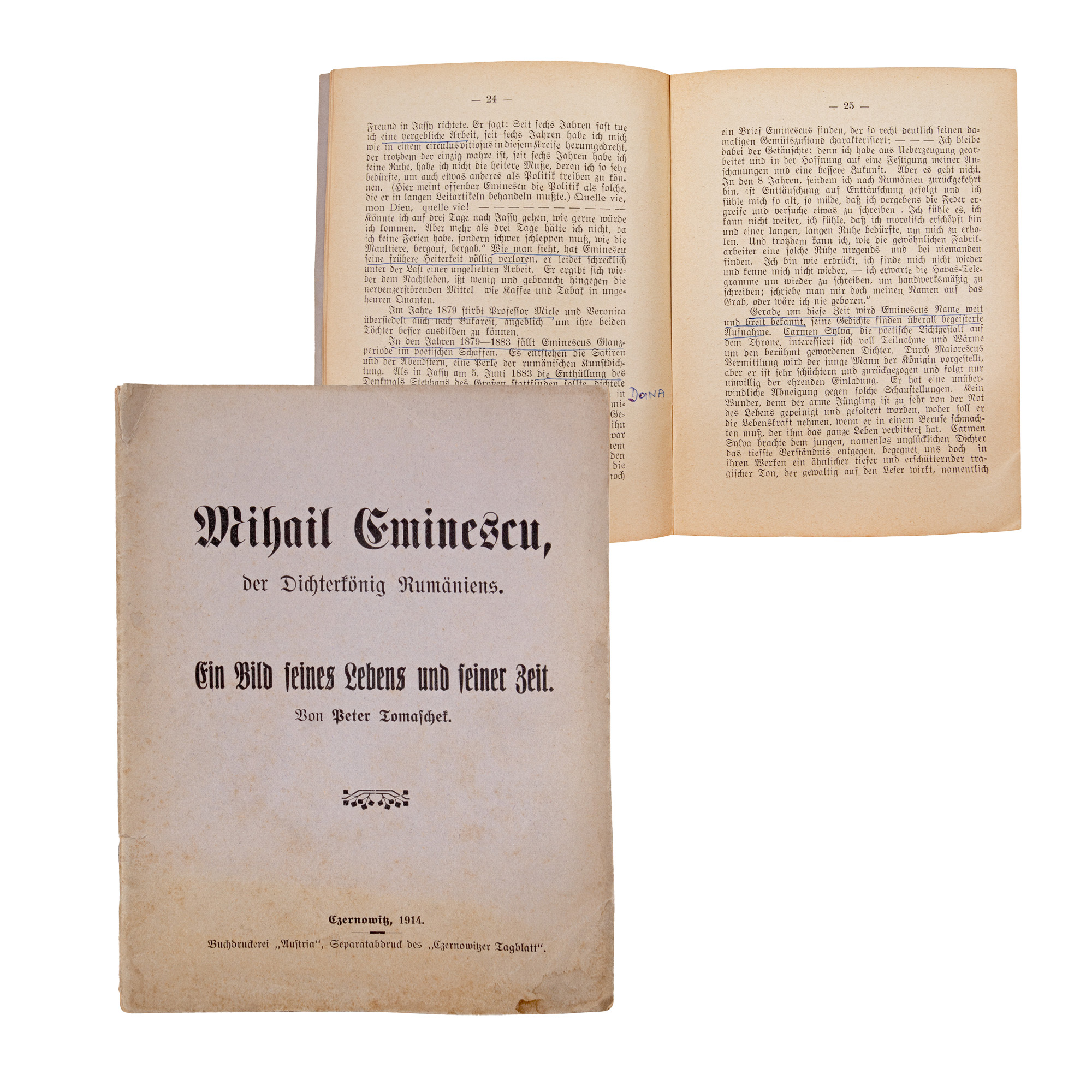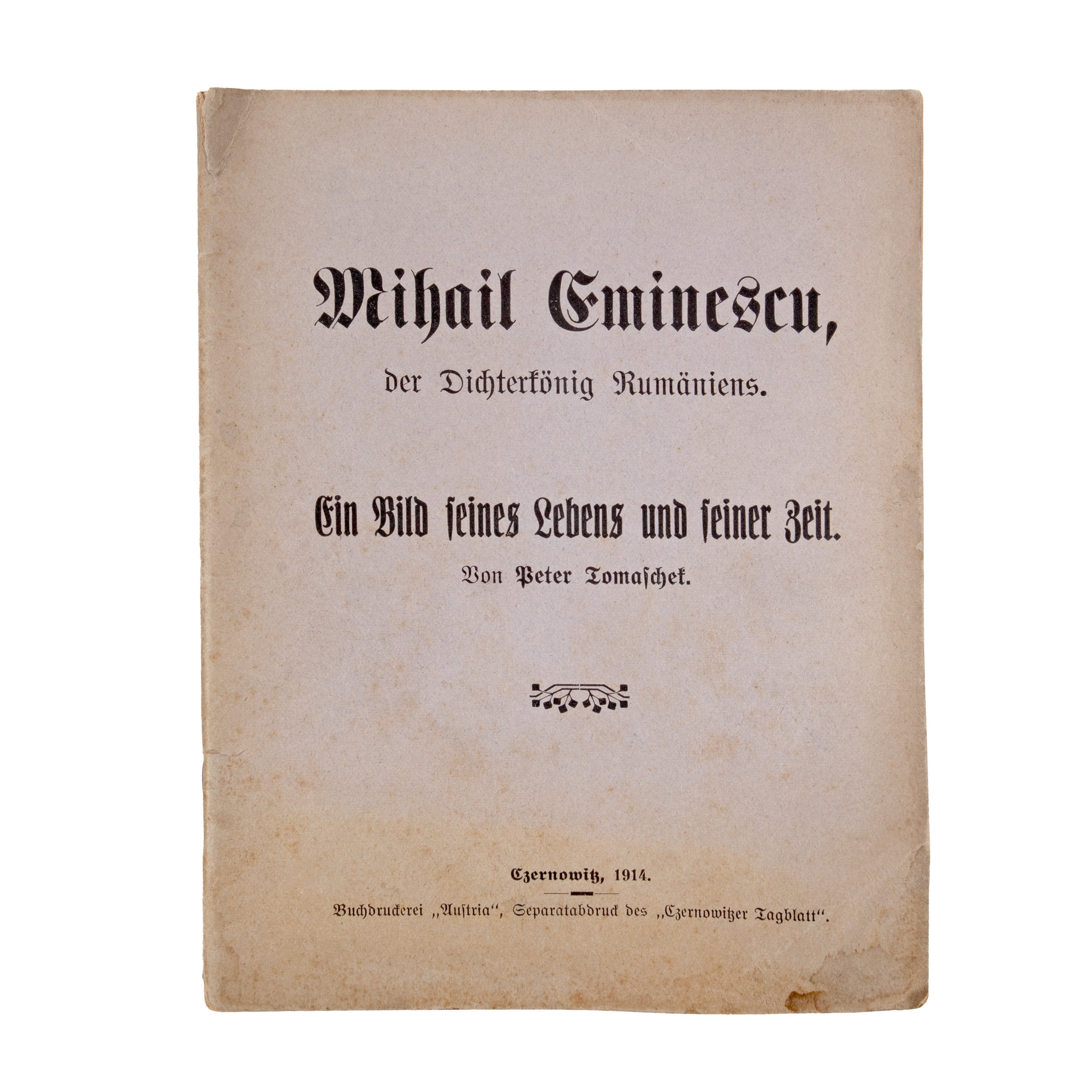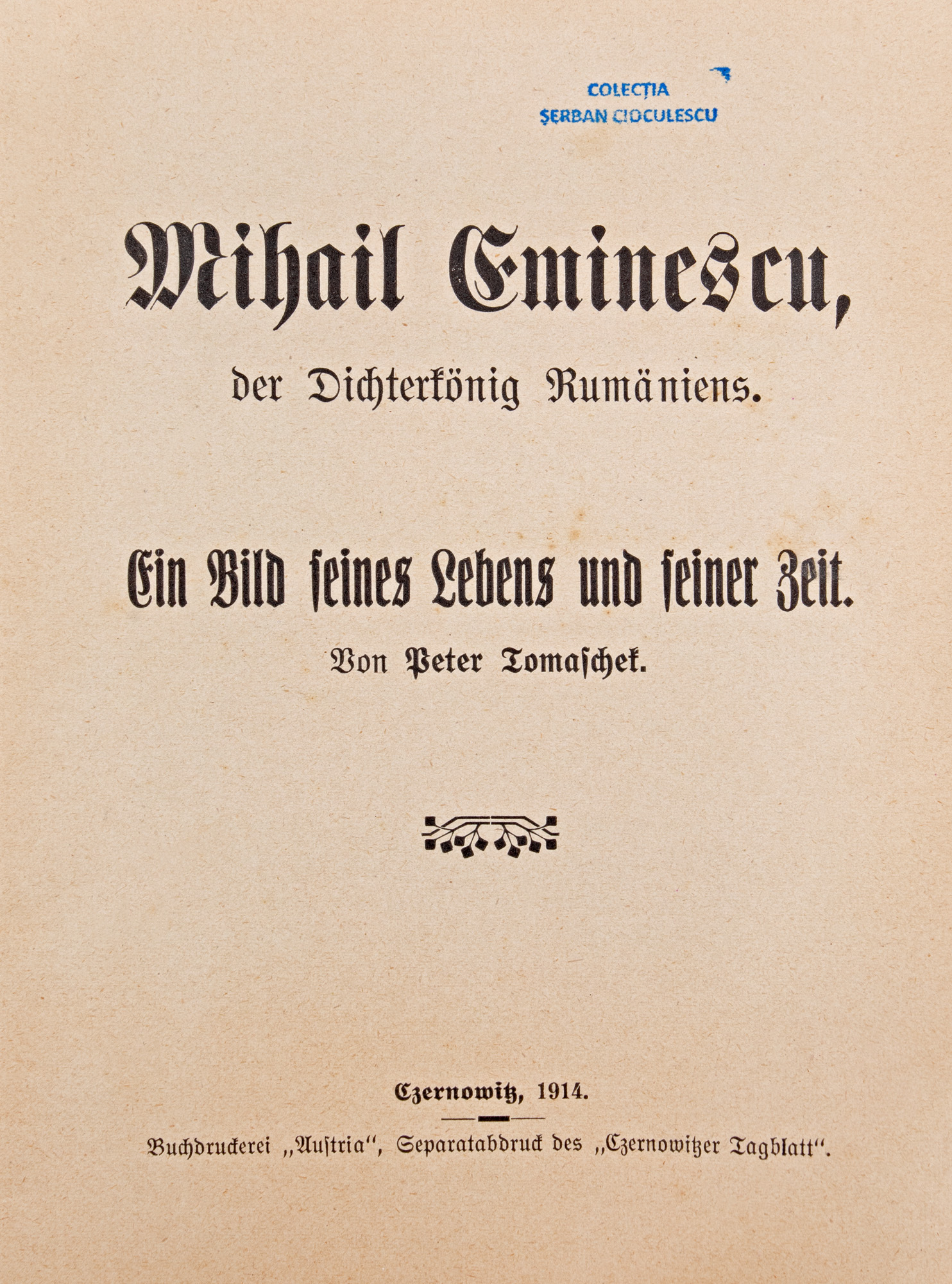 183. "Mihail Eminescu, poetul României", de Peter Tomafchet, germană, Cernăuți, 1914, provine din colecția criticului literar Șerban Cioculescu