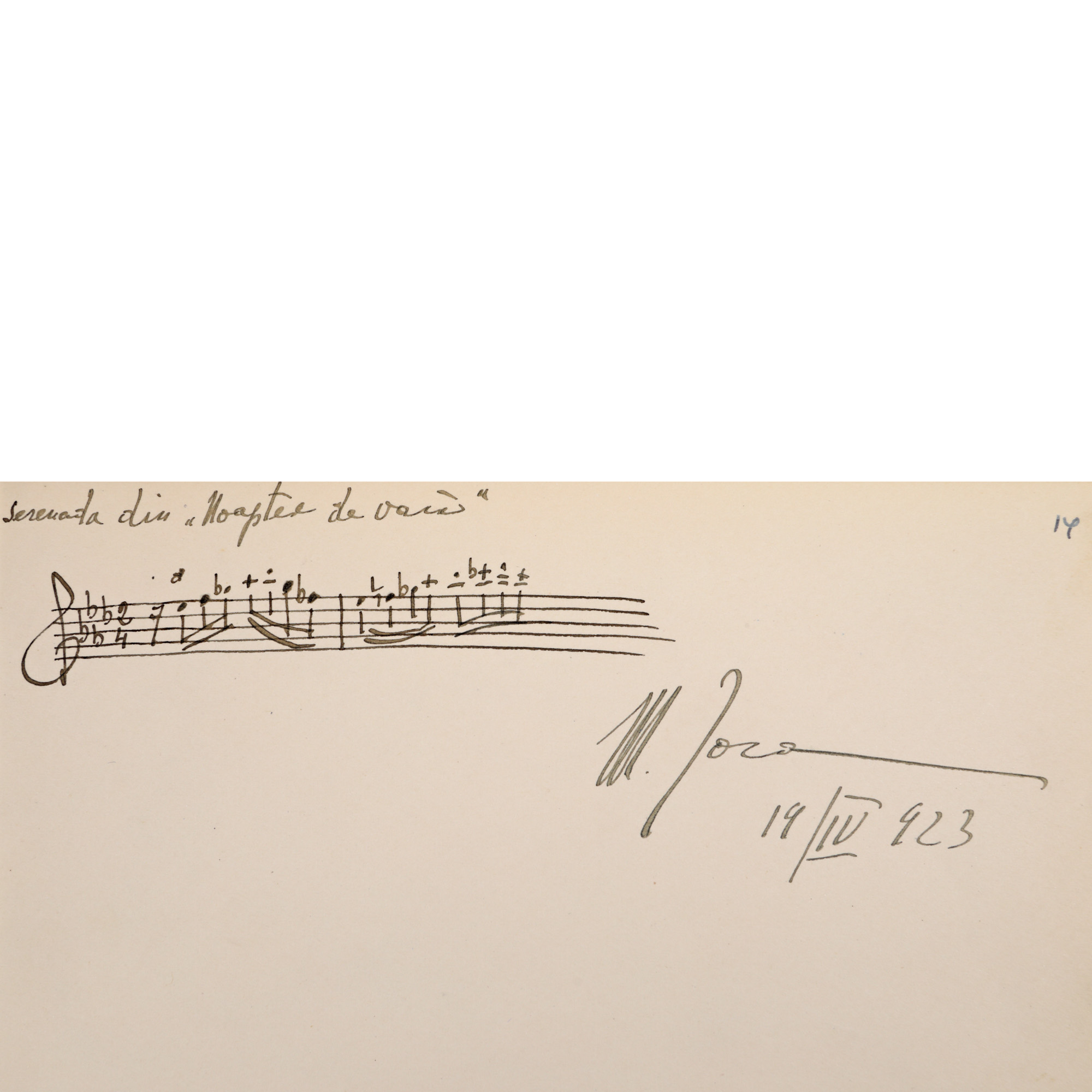 91. Partitură olografă, fragment din suita pentru orchestră în Re Major ”Noapte de vară” (partea a doua, 1915), a compozitorului Mihail Jora, 19 aprilie 1923, cu semnătura olografă a compozitorului, piesă rară, de colecție